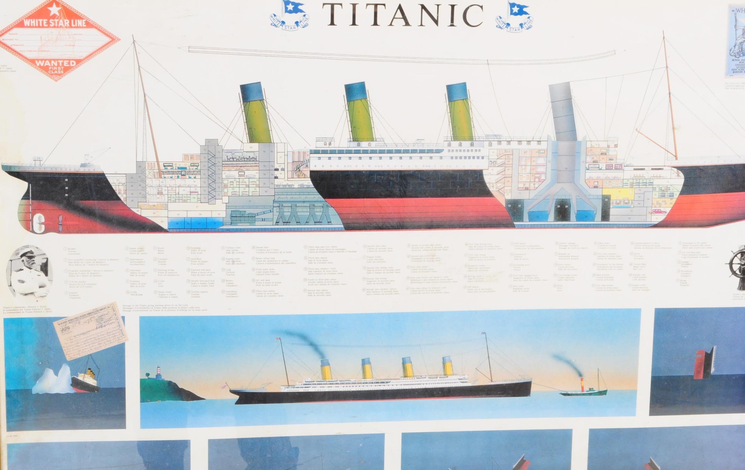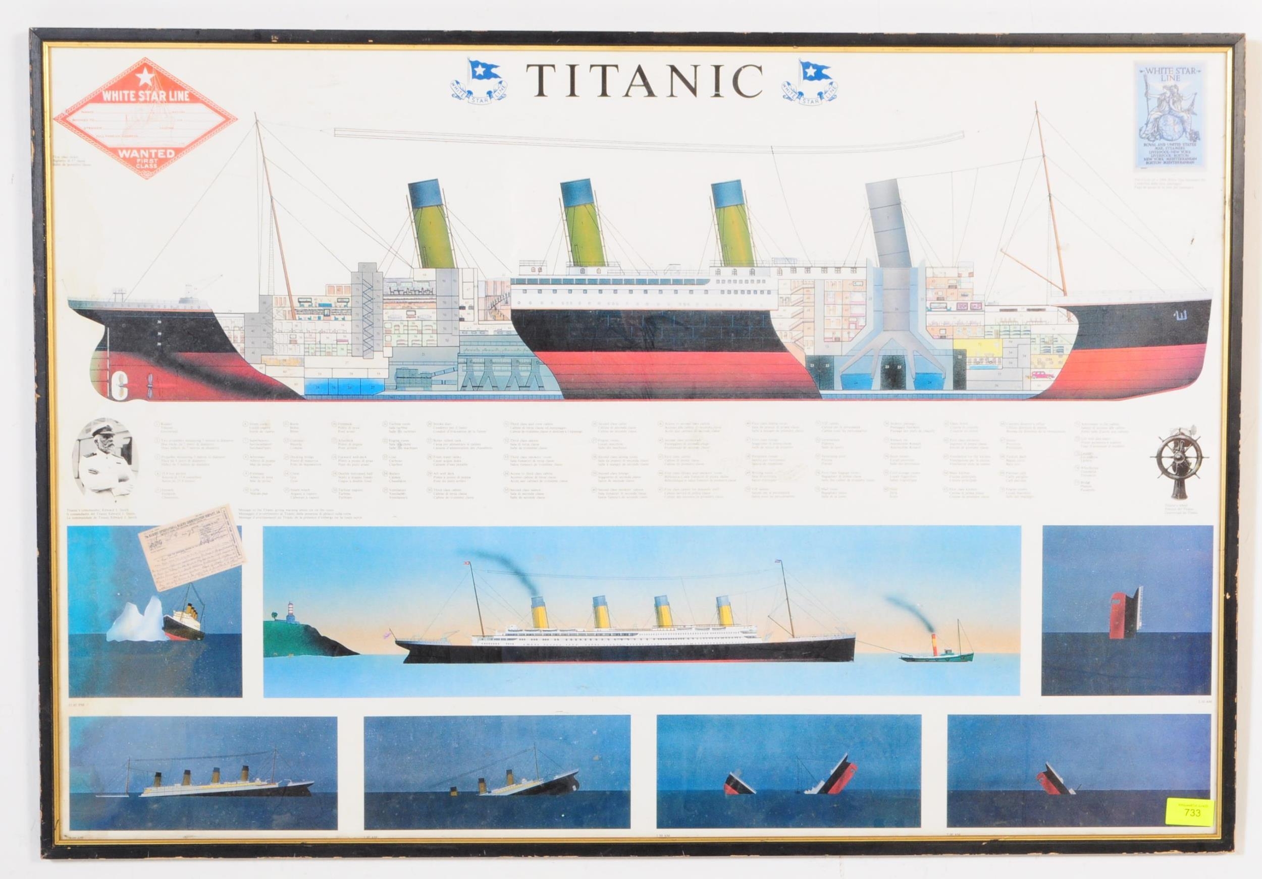 Titanic / White Star Line Interest; A vintage, retro 'Timetable To Sinking' print depicting RMS Titanic approaching the iceberg and subsequent sinking. Framed and glazed. Size; 66cm x 96cm.