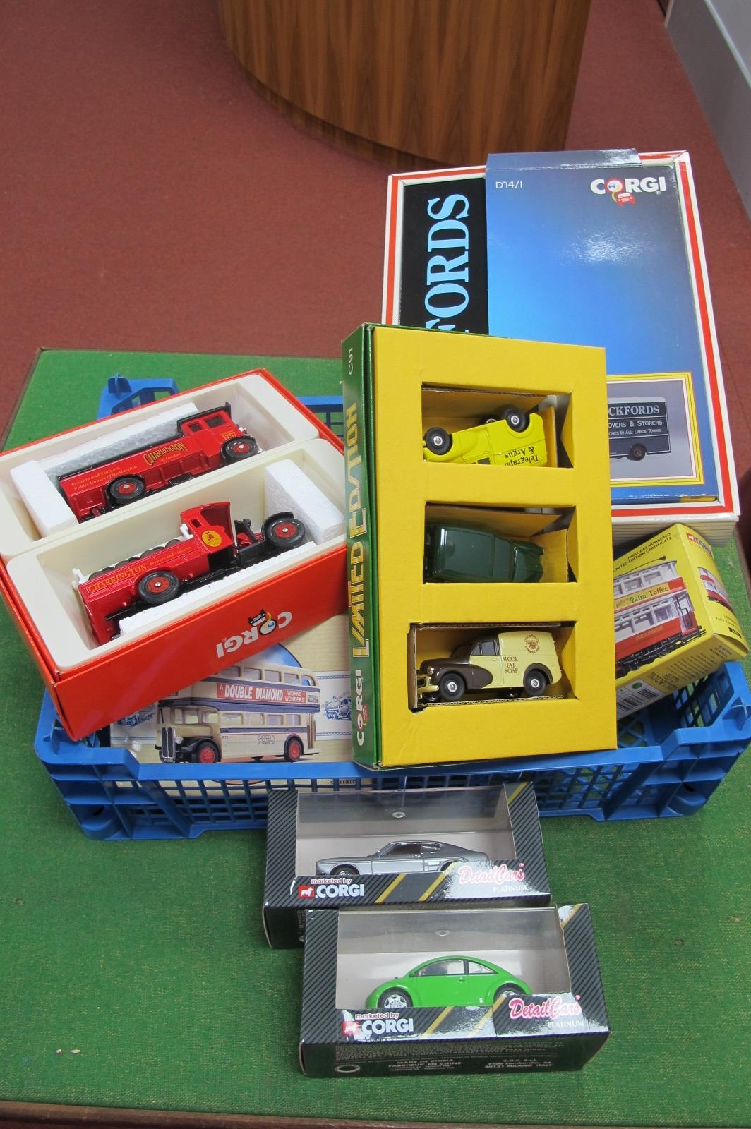 Thirteen Diecast Model Vehicles by Corgi Detail Cars, to include #97002 AEC Regent - Sheffield #D74/, Pickfords three vehicle set Detail Cars ART.303 Ford Capri 2300 GT 1969, #98468 Champlain Yellow Coach 743, boxed.