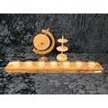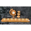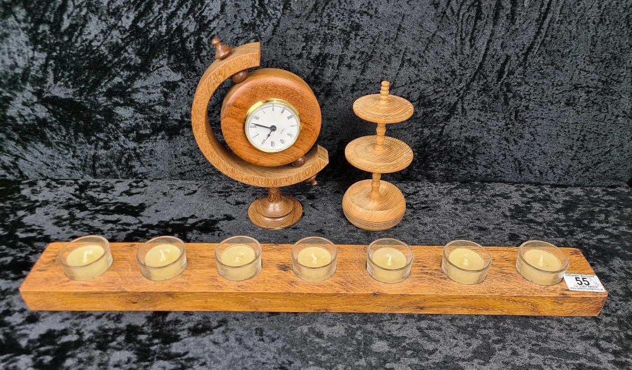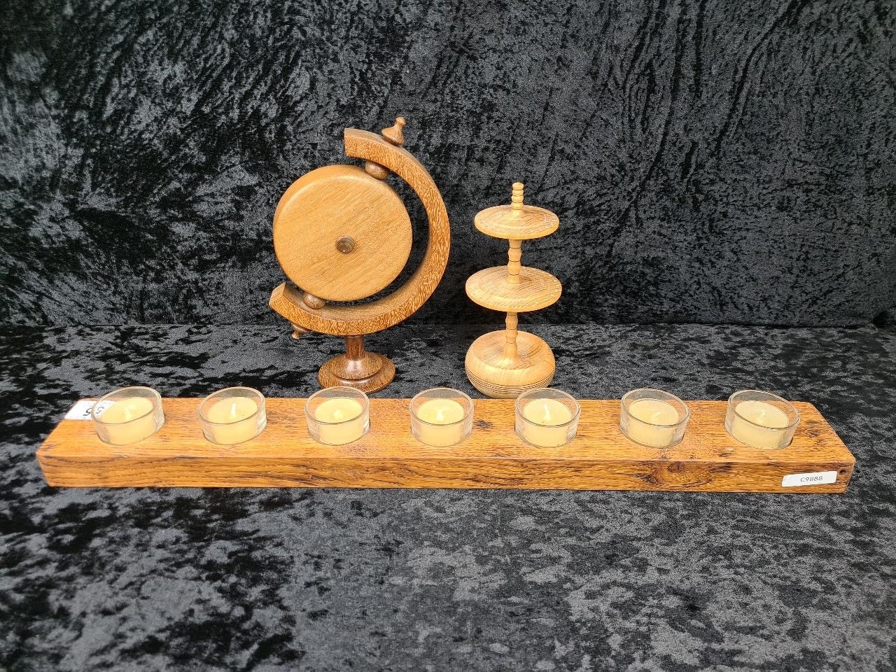 Trio of treen! Wooden globe clock, tea light holder with gla...