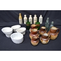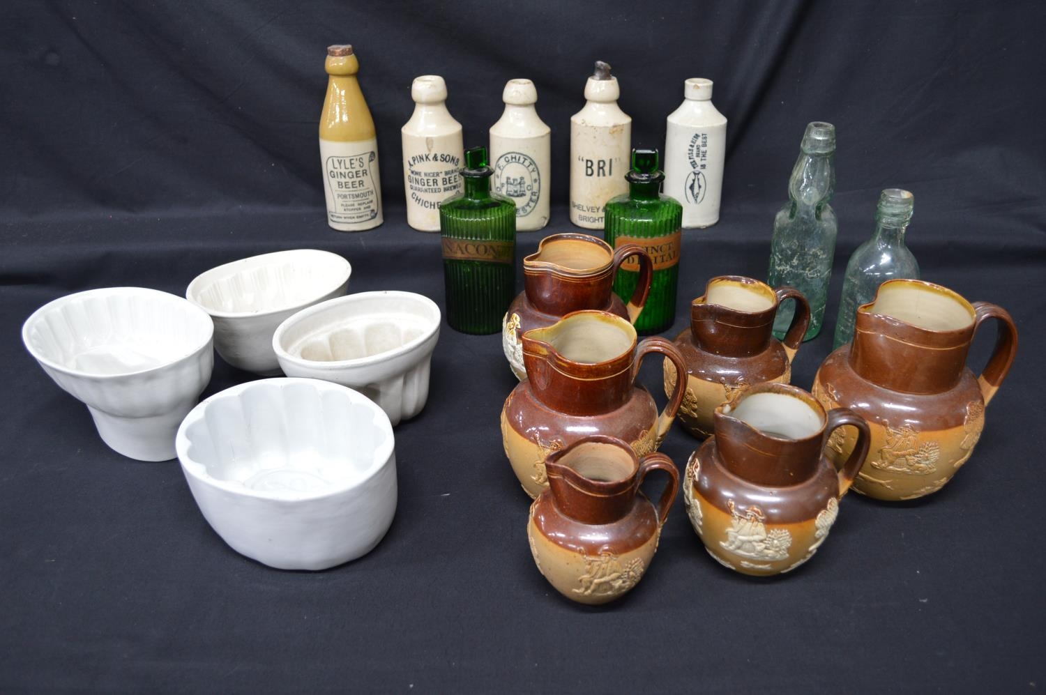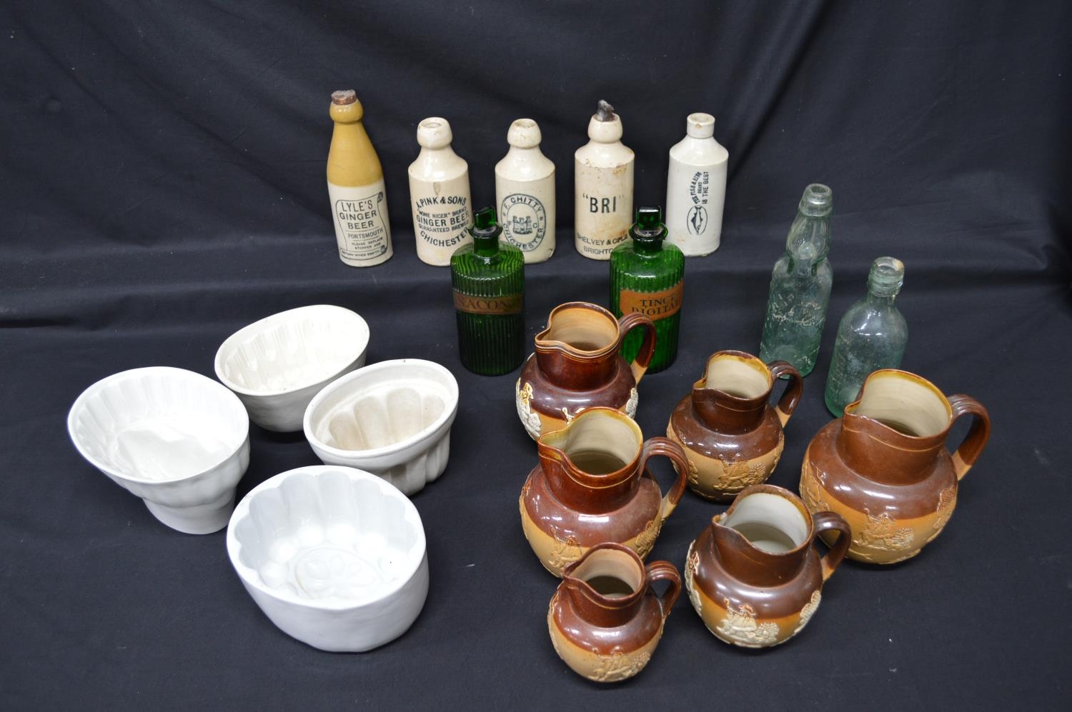 Group of six Harvestware jugs together with four ceramic jelly moulds and quantity of stoneware and glass bottles