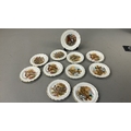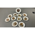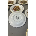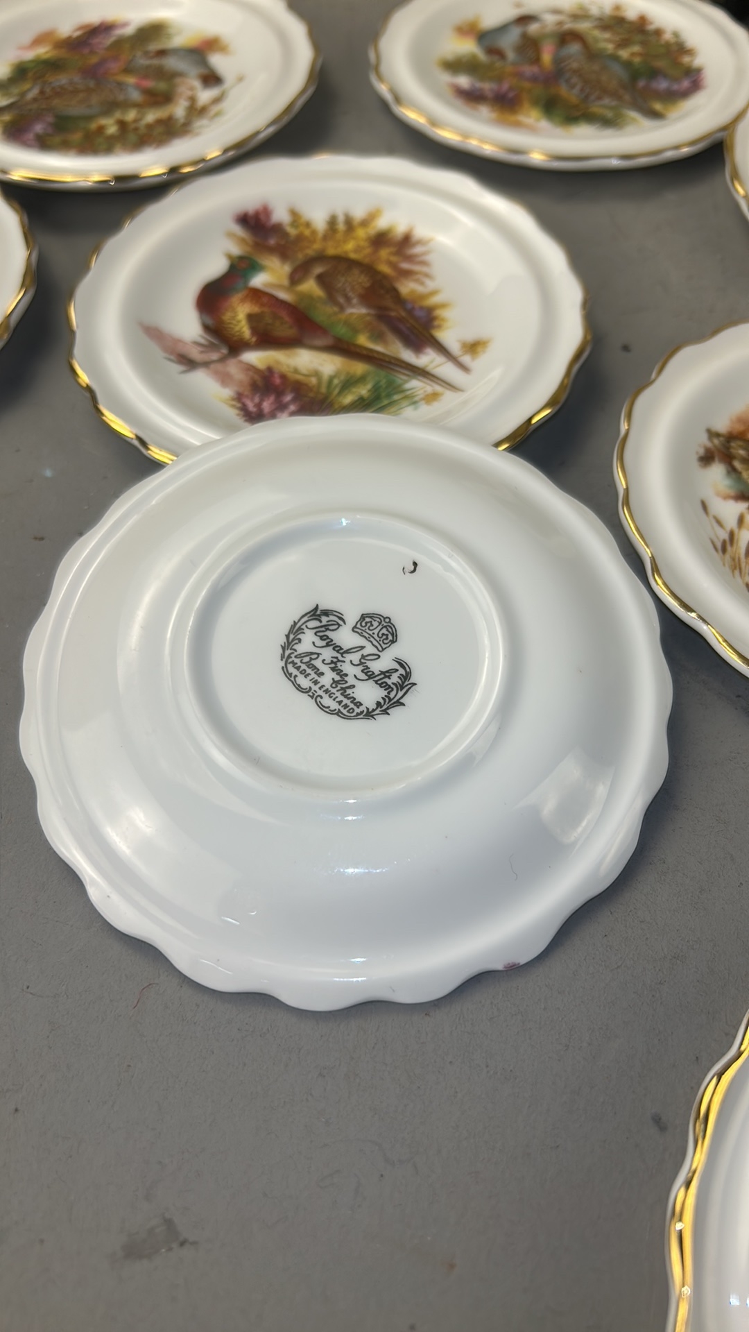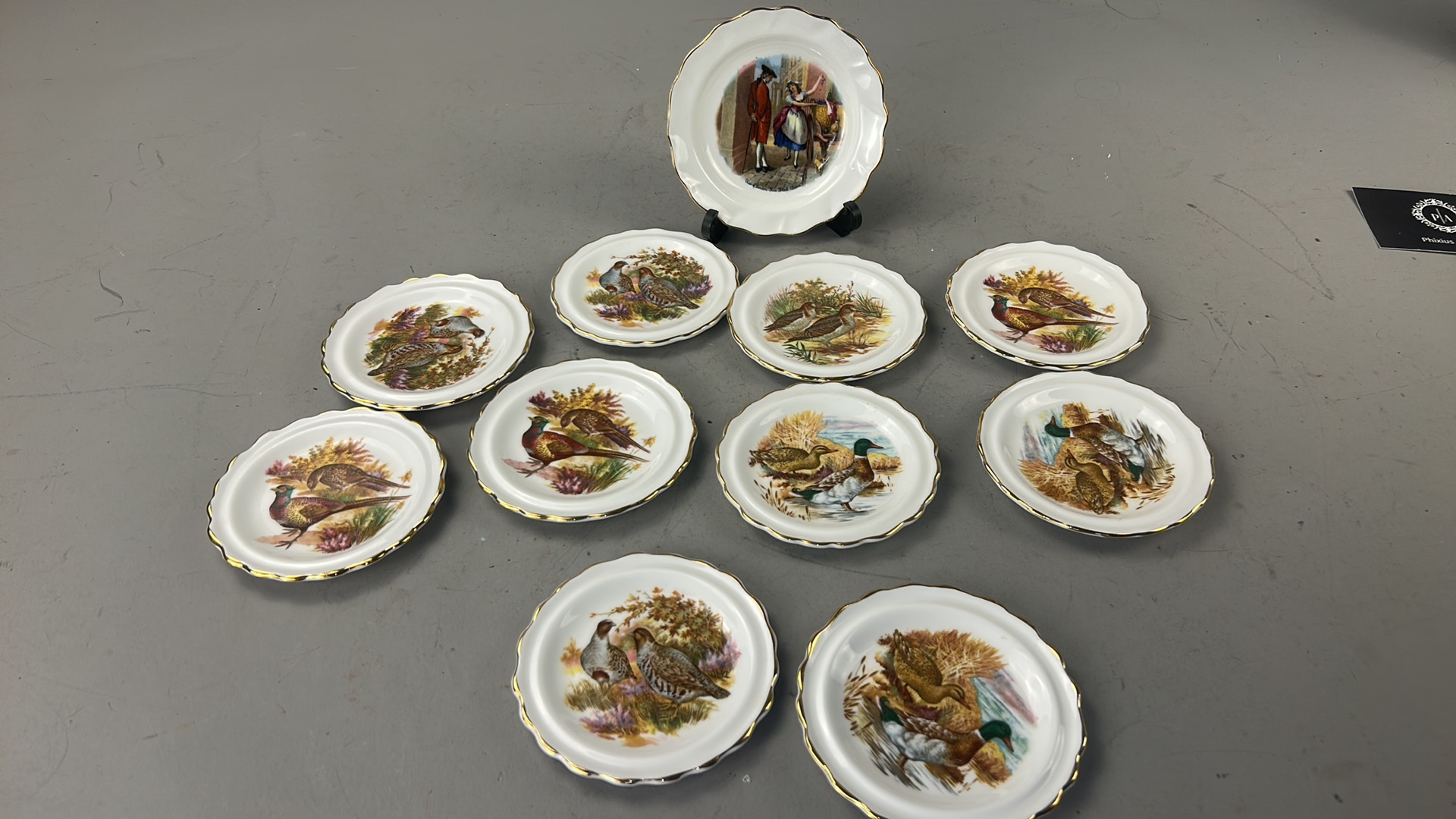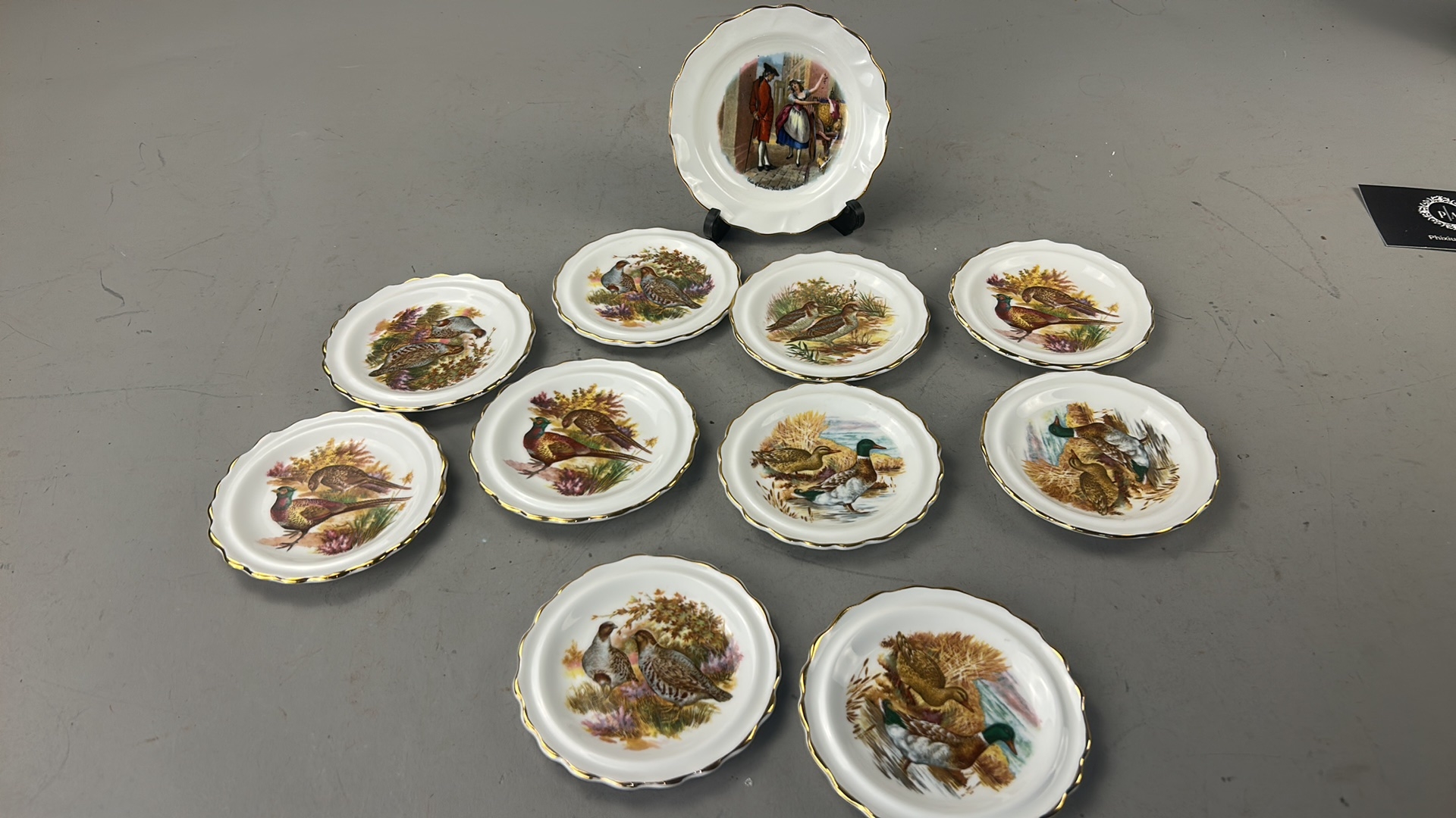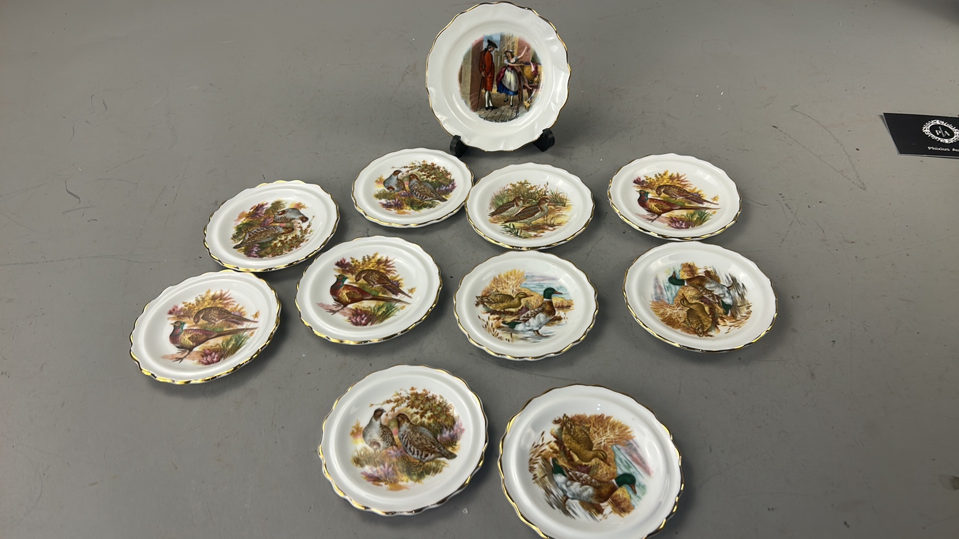 Set of eleven English bone china side plates by Royal Stafford, each scallop-rimmed with gilded edge; ten depicting game birds, one showing an 18th-century courting couple, printed backstamp.