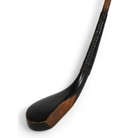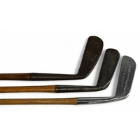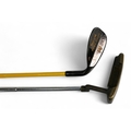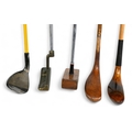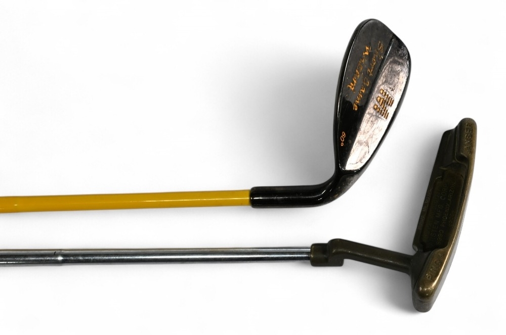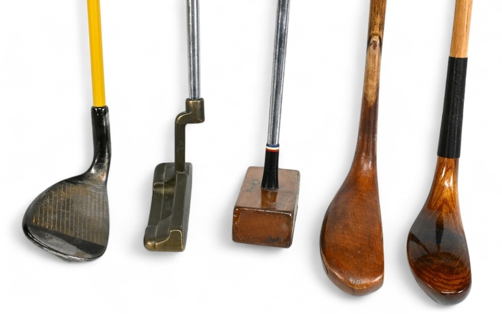 5x Assorted Golf clubs to incl late longnose scared neck putter with 4x added lead plugs to the sole in light stained persimmon, t/w 4x modern clubs to incl a Ping Anser putter with Pheonix address, Ben Sayers (now illegal) 90deg wood and brass head putter with a steel shaft, modern scared neck putter in laminate maple hand made in St Andrews and short game wizard 60deg wedge fitted with a coated steel shaft - all with grips