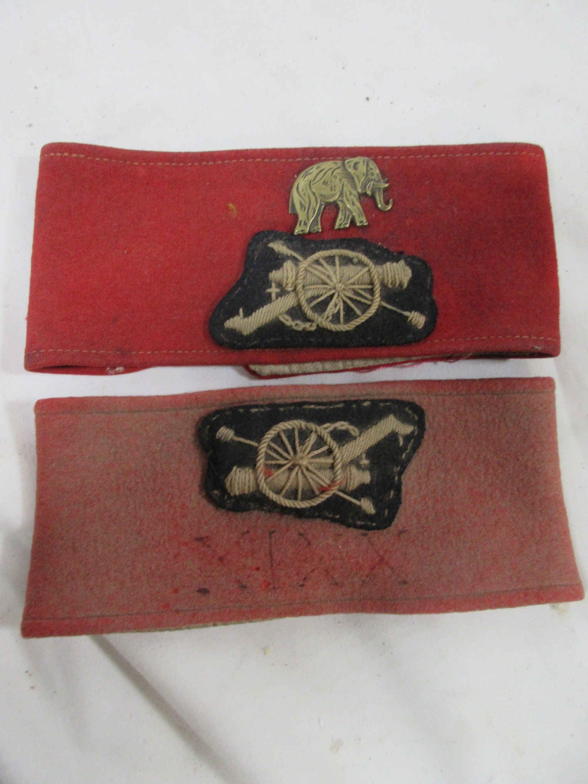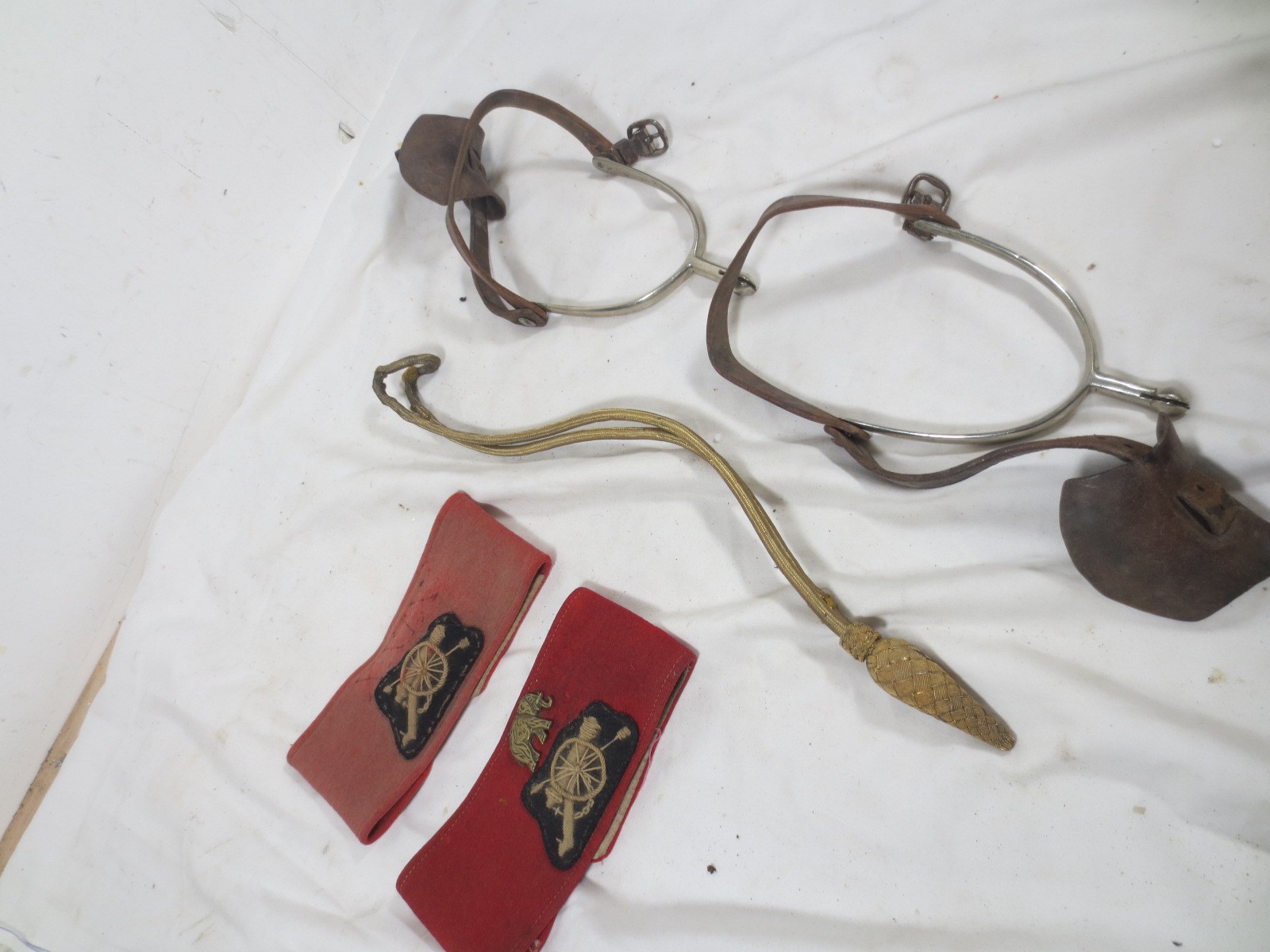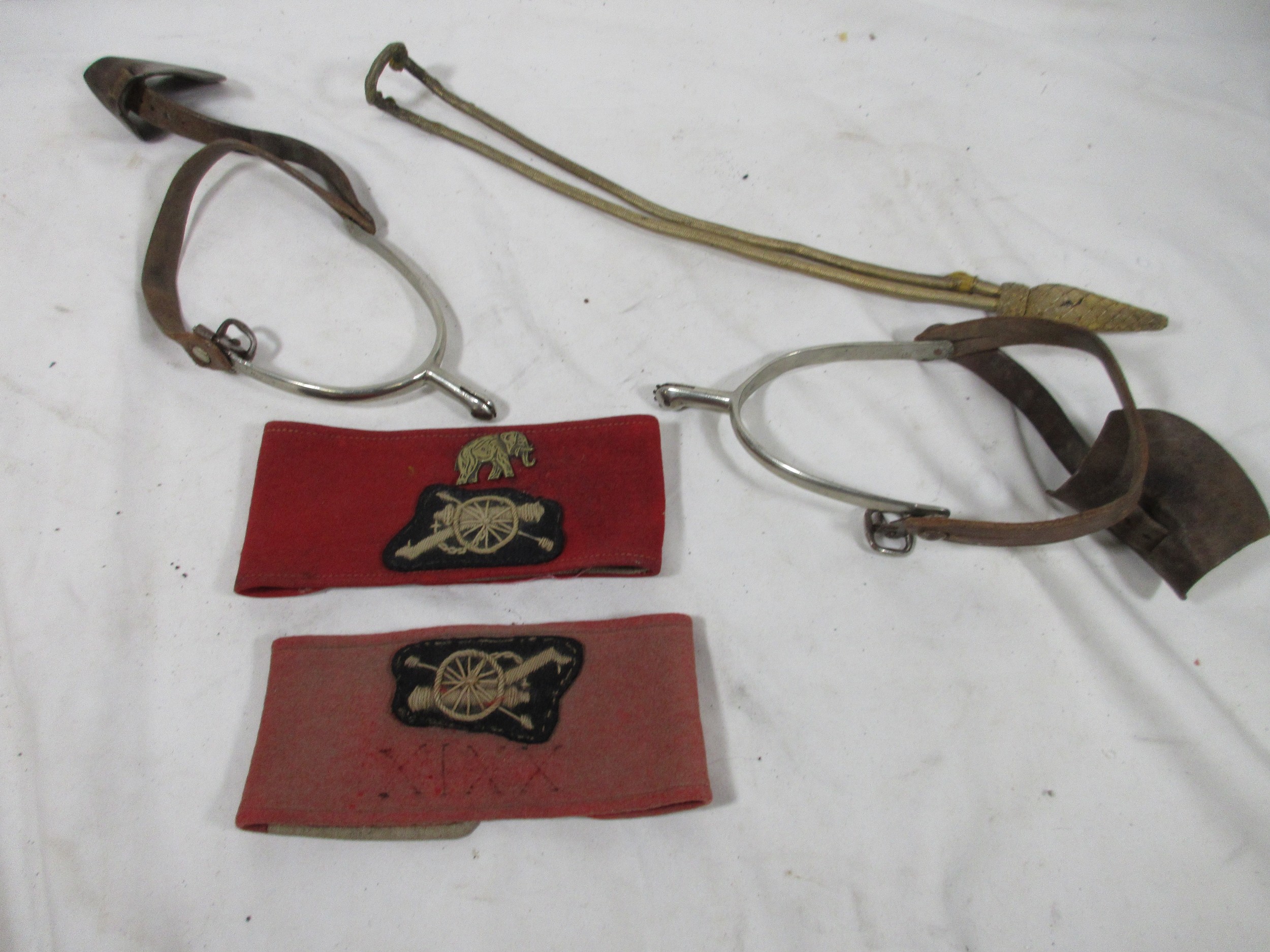 A pair of Royal Artillery armbands and a pair of officer's spurs, one armband with the elephant divisional insignia, the other with XXIX for the 29th Division which Brigadier Stockdale commanded the divisional artillery for. Also included is a bullion sword knot. Originally belonged to Brigadier General H E Stockdale CB CMG DSO.