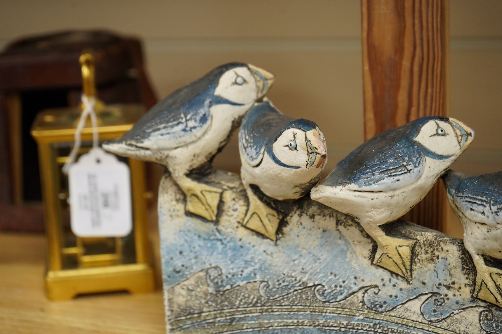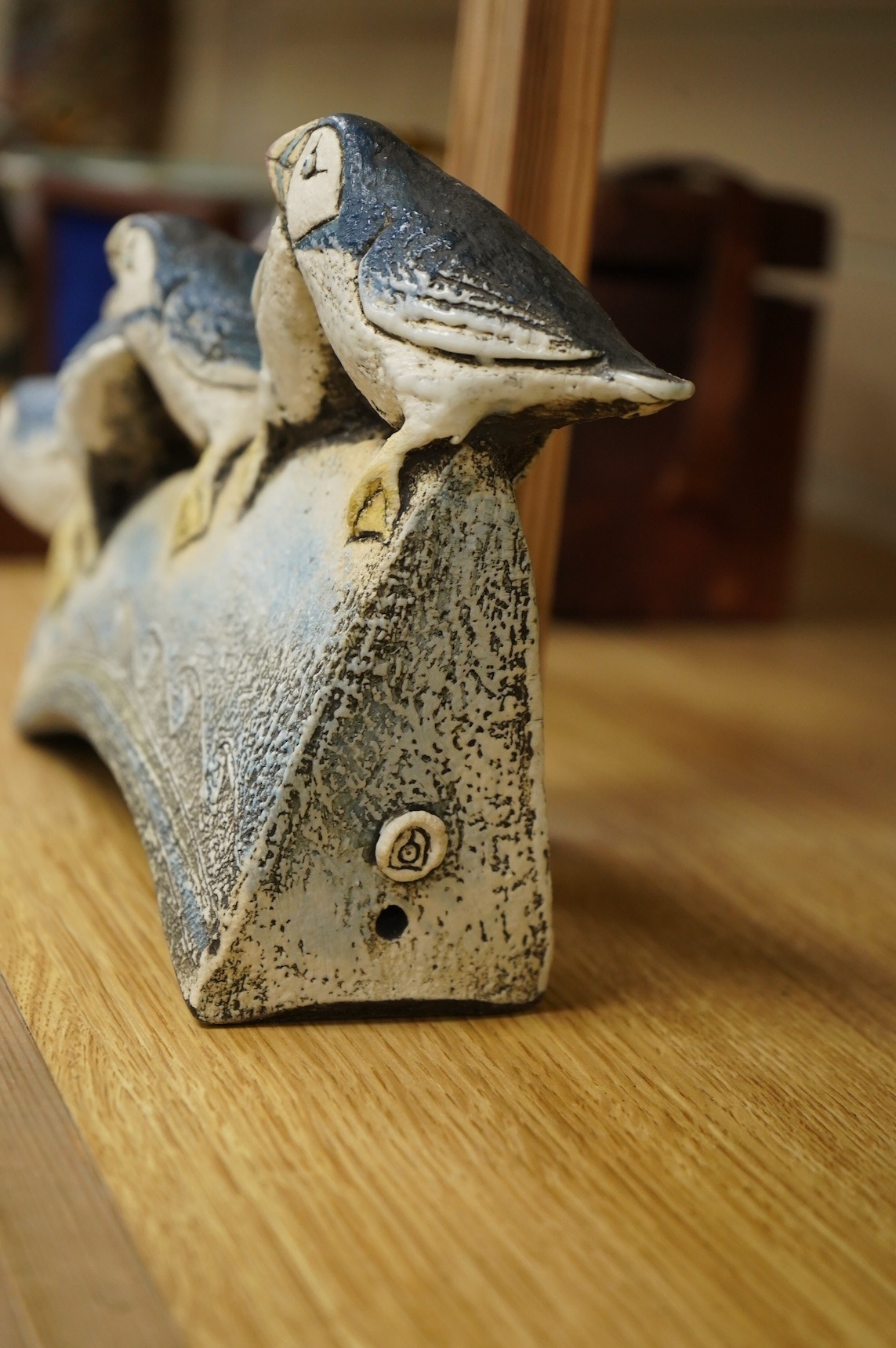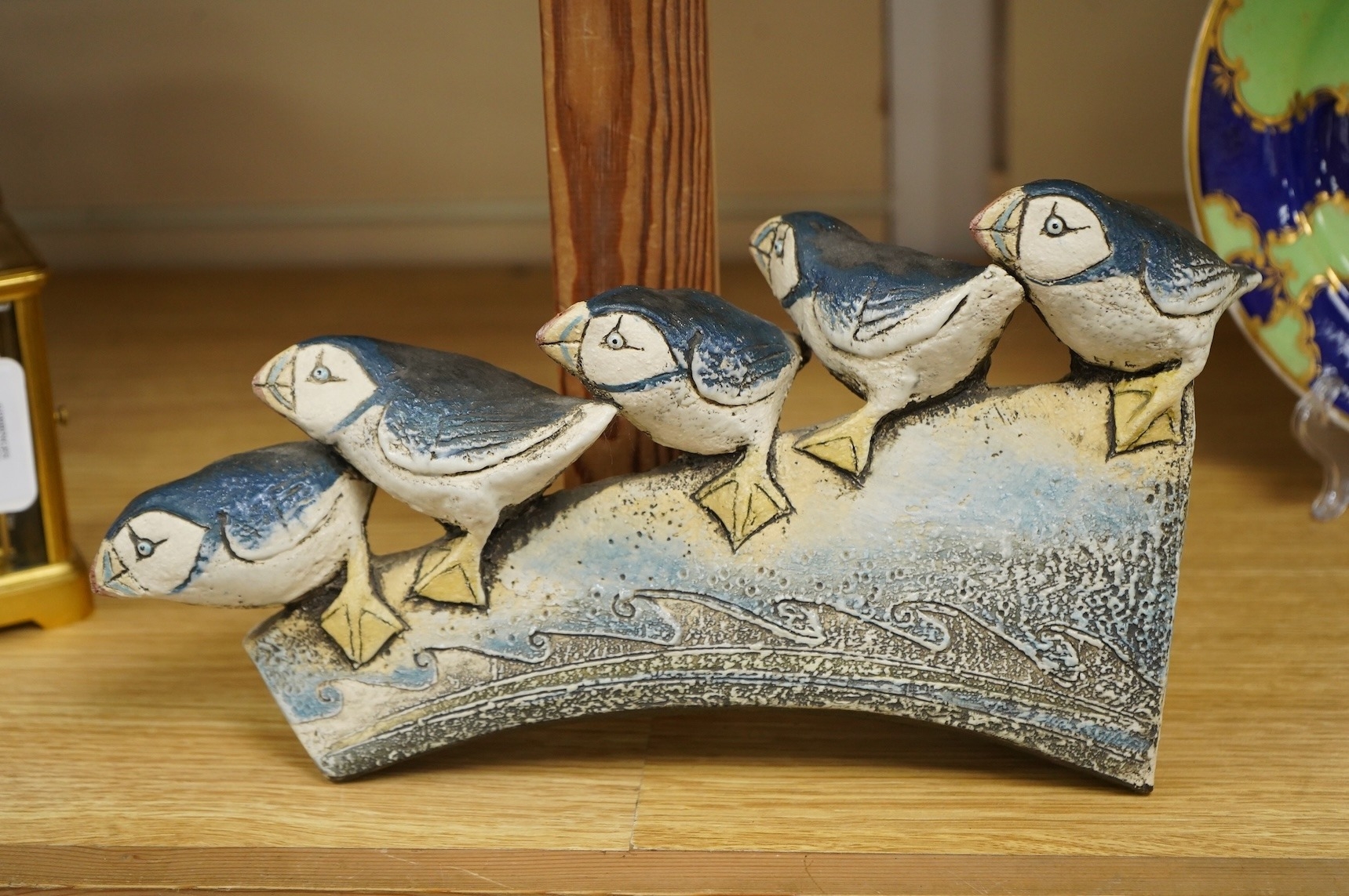 A Blandine Anderson studio ceramic sculpture, of Puffins on a ledge, 31cm wide