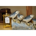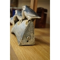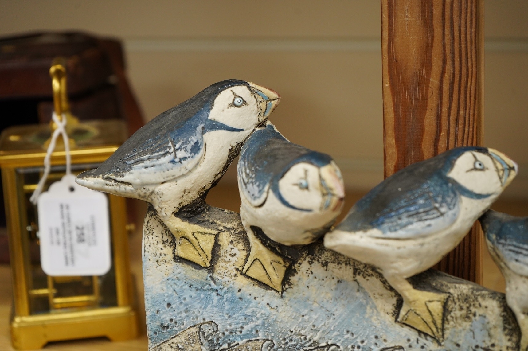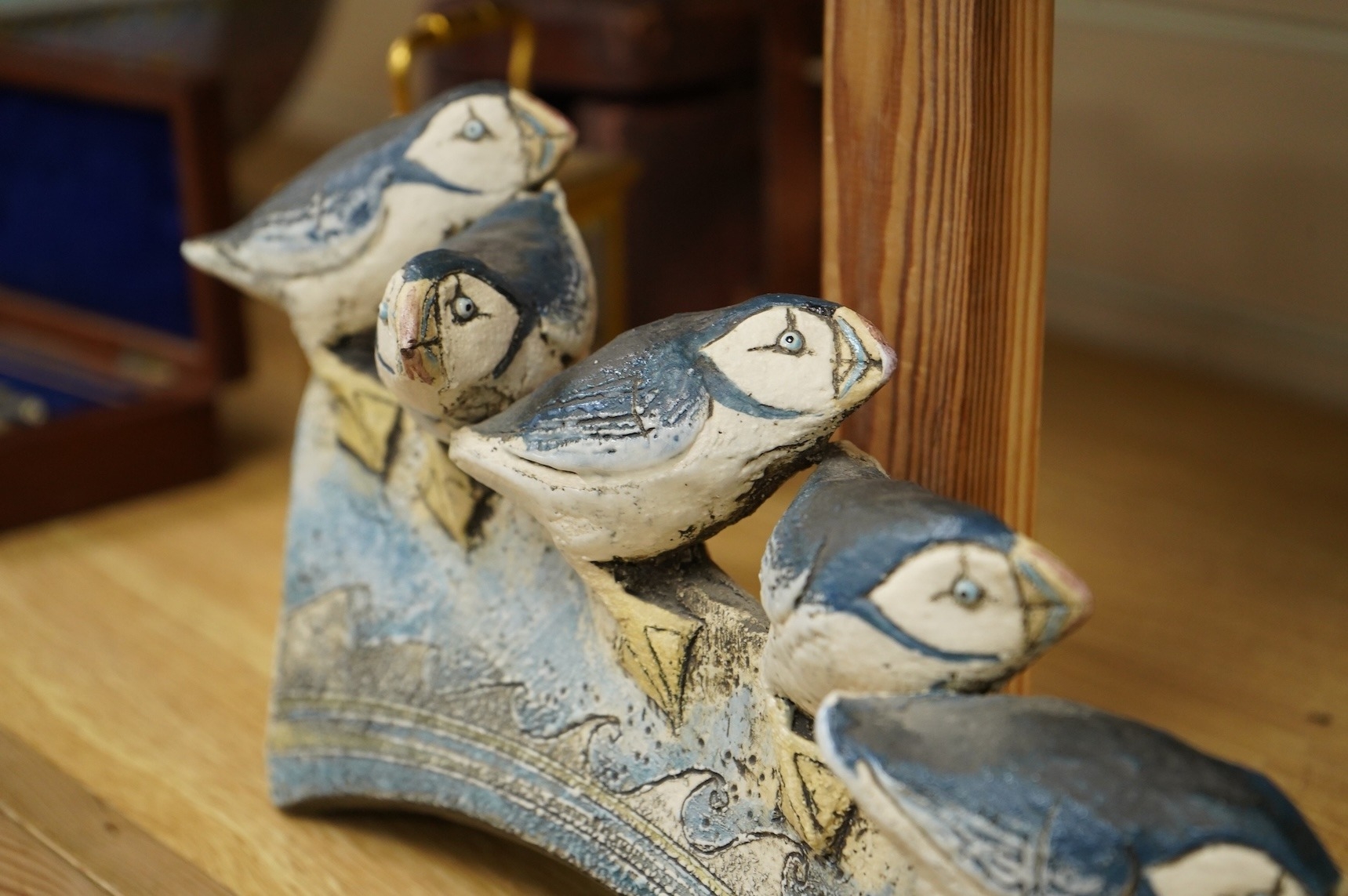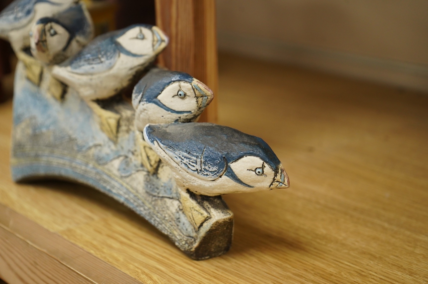 A Blandine Anderson studio ceramic sculpture, of Puffins on a ledge, 31cm wide