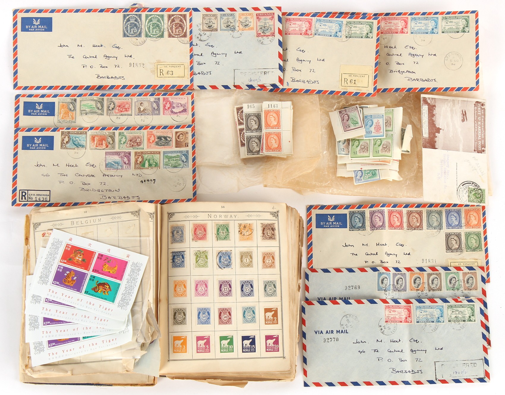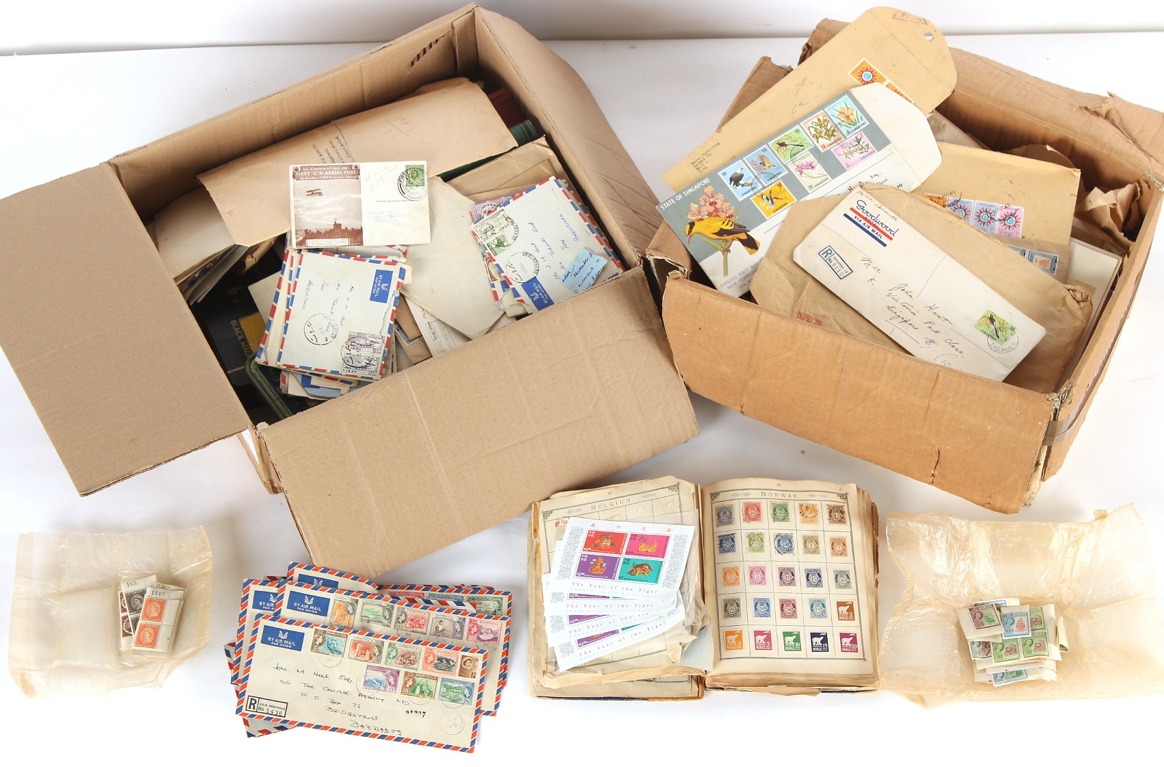 Property of a deceased estate - stamps, philatelic & postal history interest - World: A good sorting lot in two boxes with much East Asia, including two 'New Ideal' albums, a 'Movaleaf' album, and a battered 'Lincoln', loose stamps and covers, noted GB 1911 Windsor flight card, Norway 1893-1908 Posthorn values to 60 ore mint, St Vincent 1955-63 1c to $2.50 mint pairs, and $1 to $2.50 on cover, and North Borneo 1961 1c to $2 (four of each), $5 and $10 mint, mixed condition.