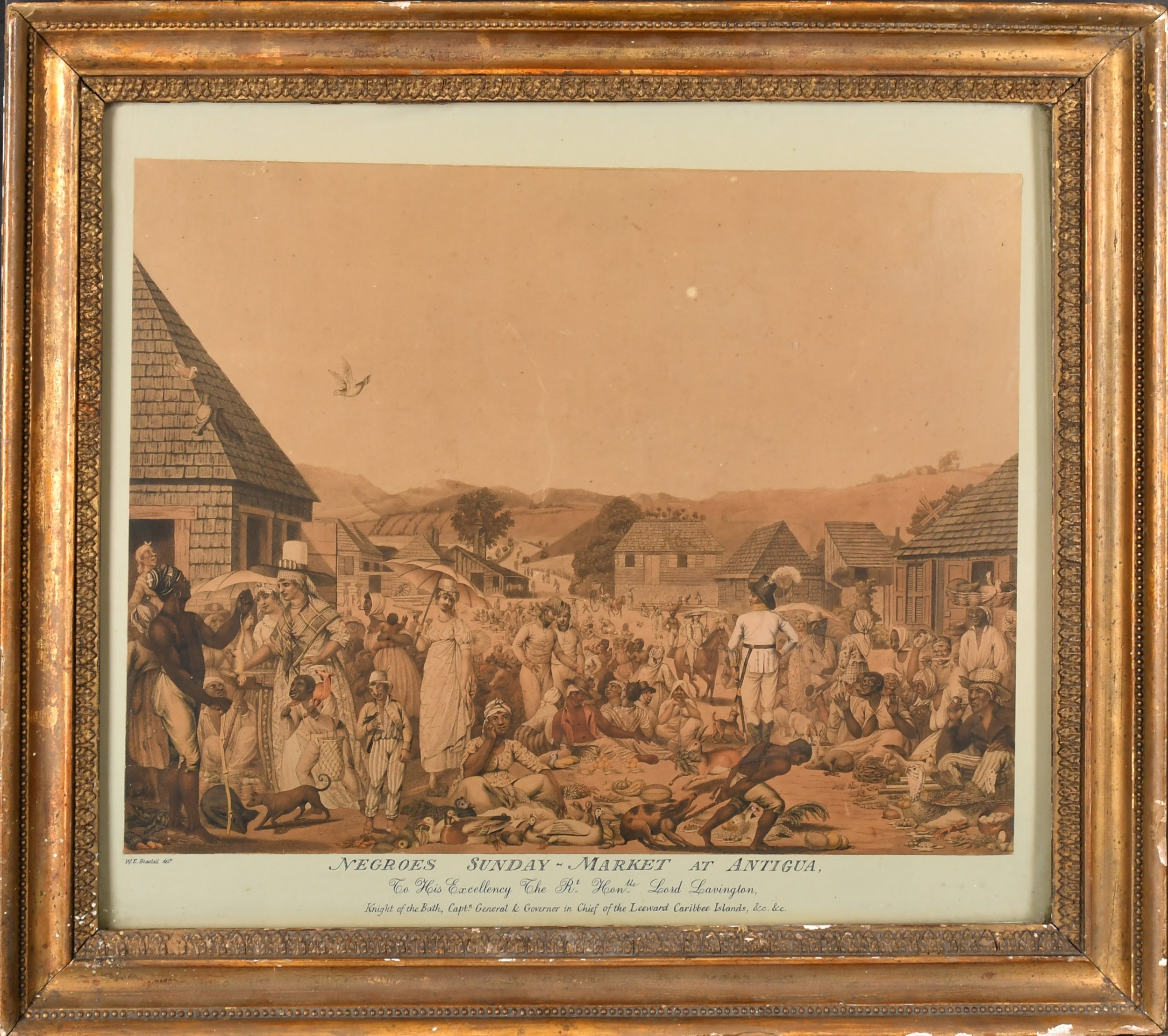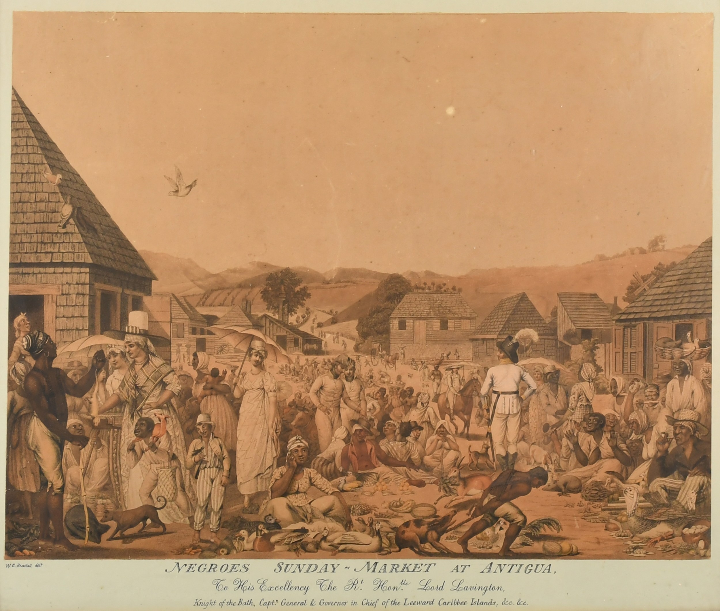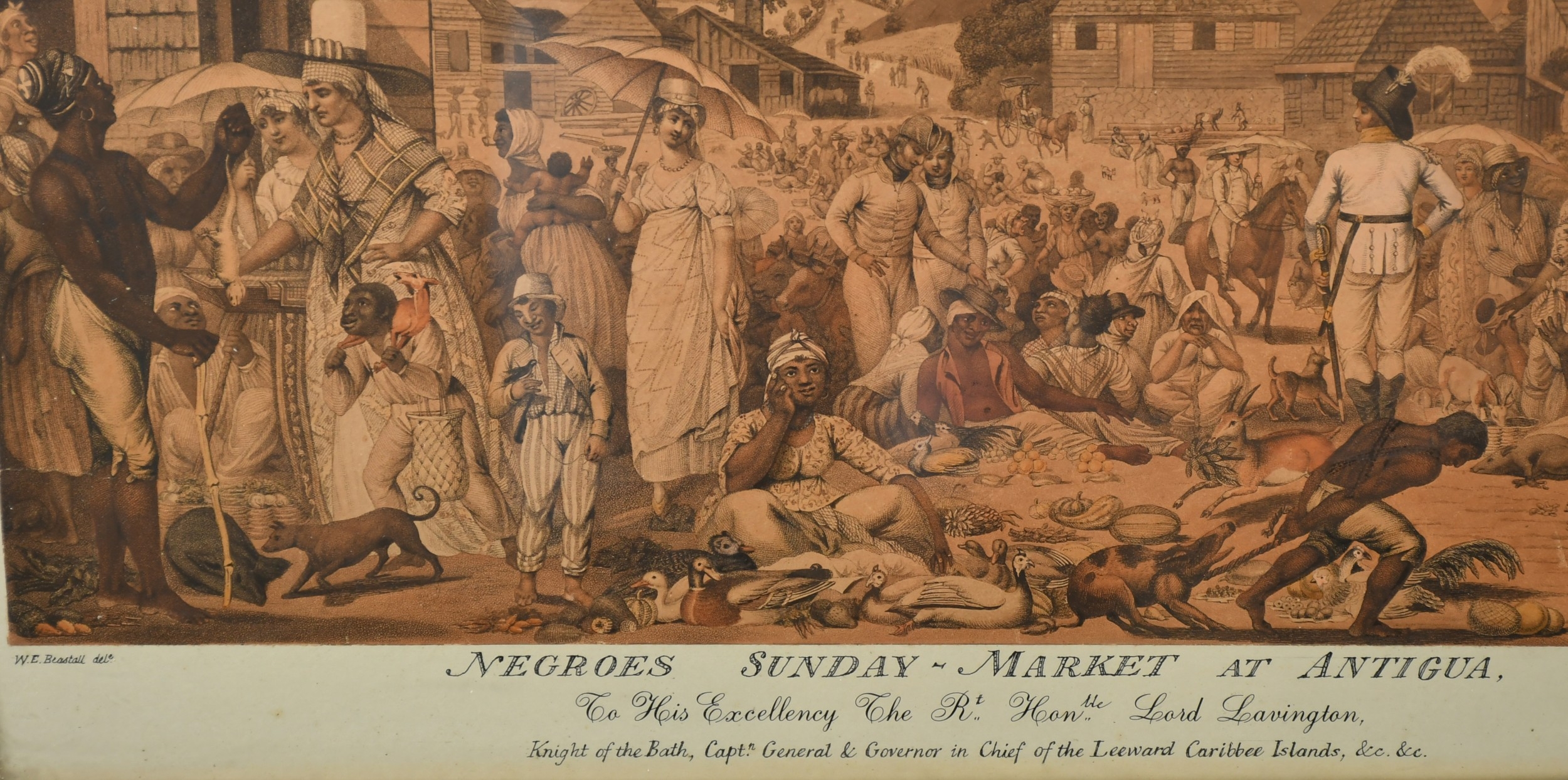 W E Beastall (18th-19th Century) British. "Negroes Sunday-Market at Antigua", Aquatint (cut to image with later inscription on the mount), 13" x 16.75" (33 x 42.5cm)