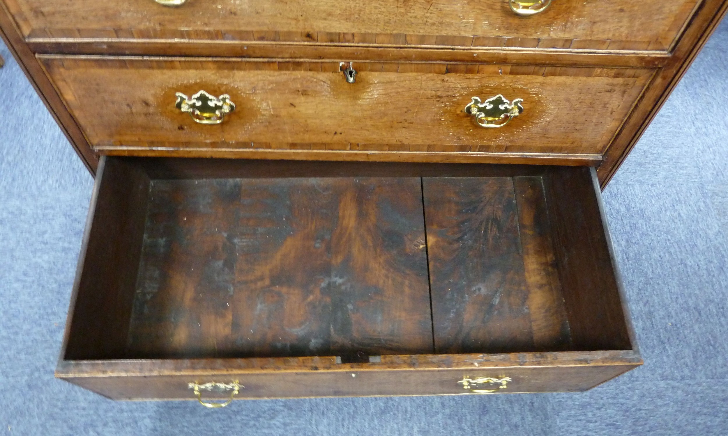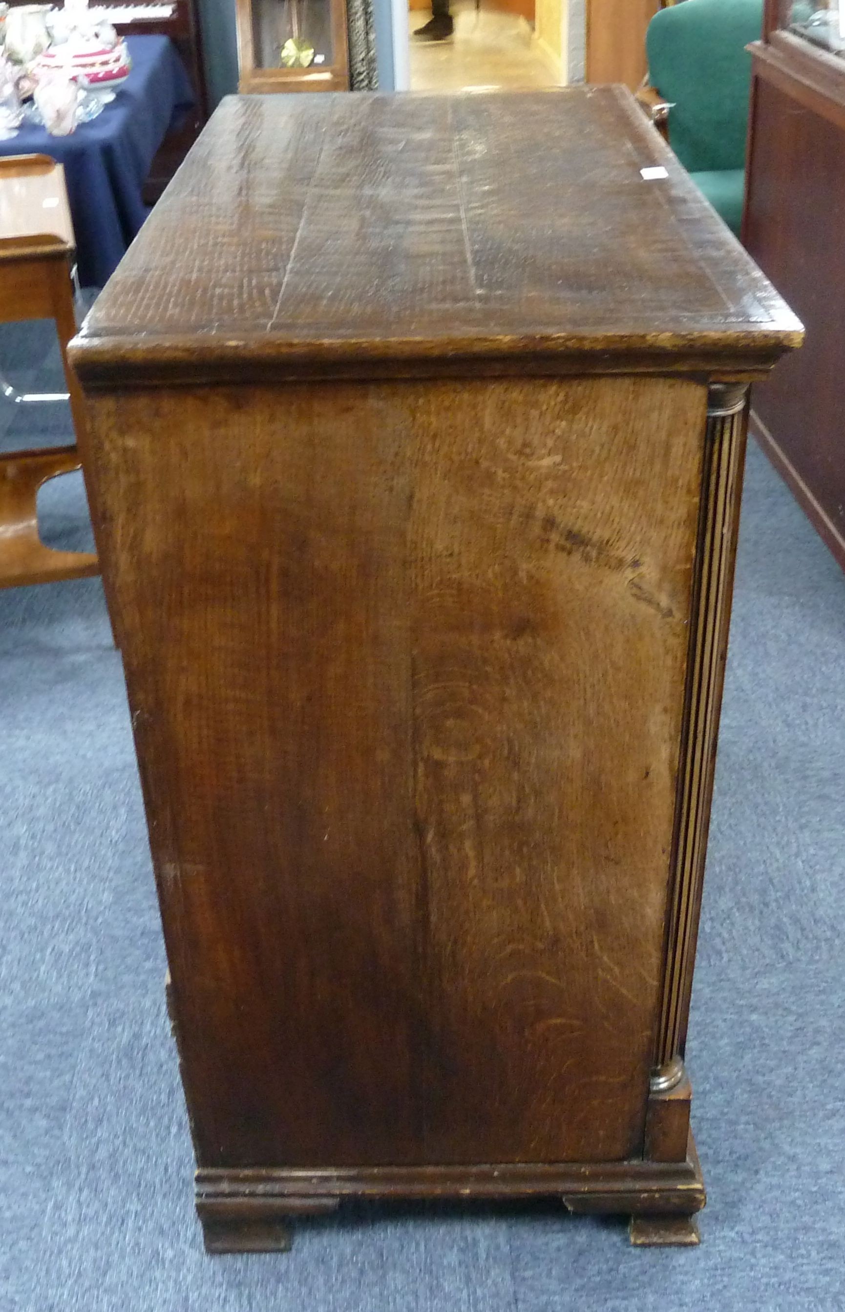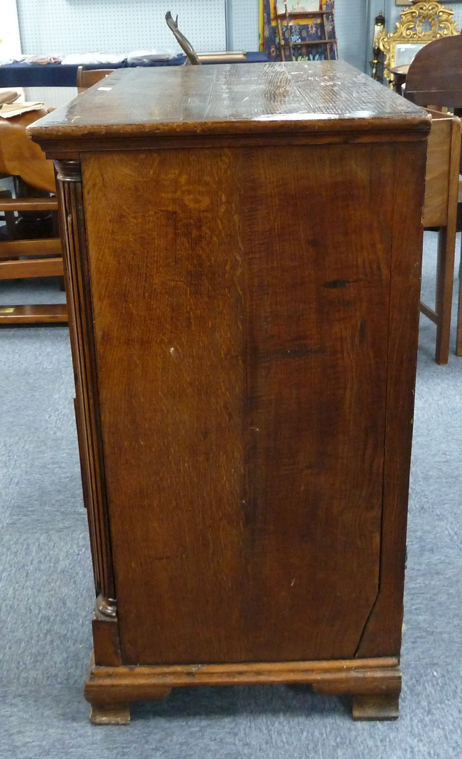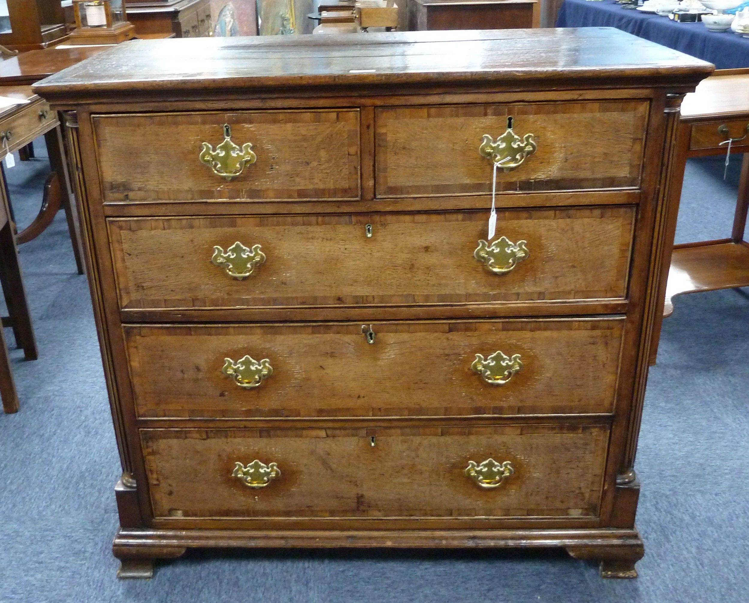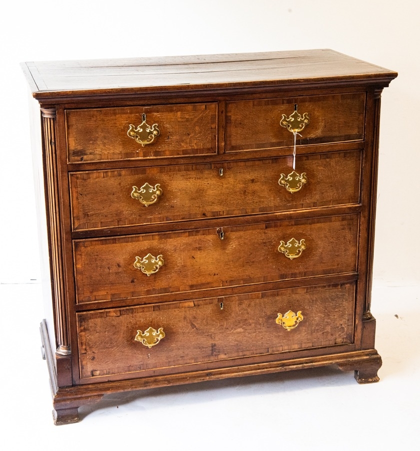 GEORGE III OAK AND MAHOGANY CROSSBANDED CHEST OF DRAWERS, the oblong top above two short and three long drawers, fitted with swan neck brass handles, flanked by fluted quarter columns to the fore corners, and raised on ogee bracket feet, 38 ½” (97.7cm) high, 40 ¼” x 20 ½” (102.2cm x 52cm)