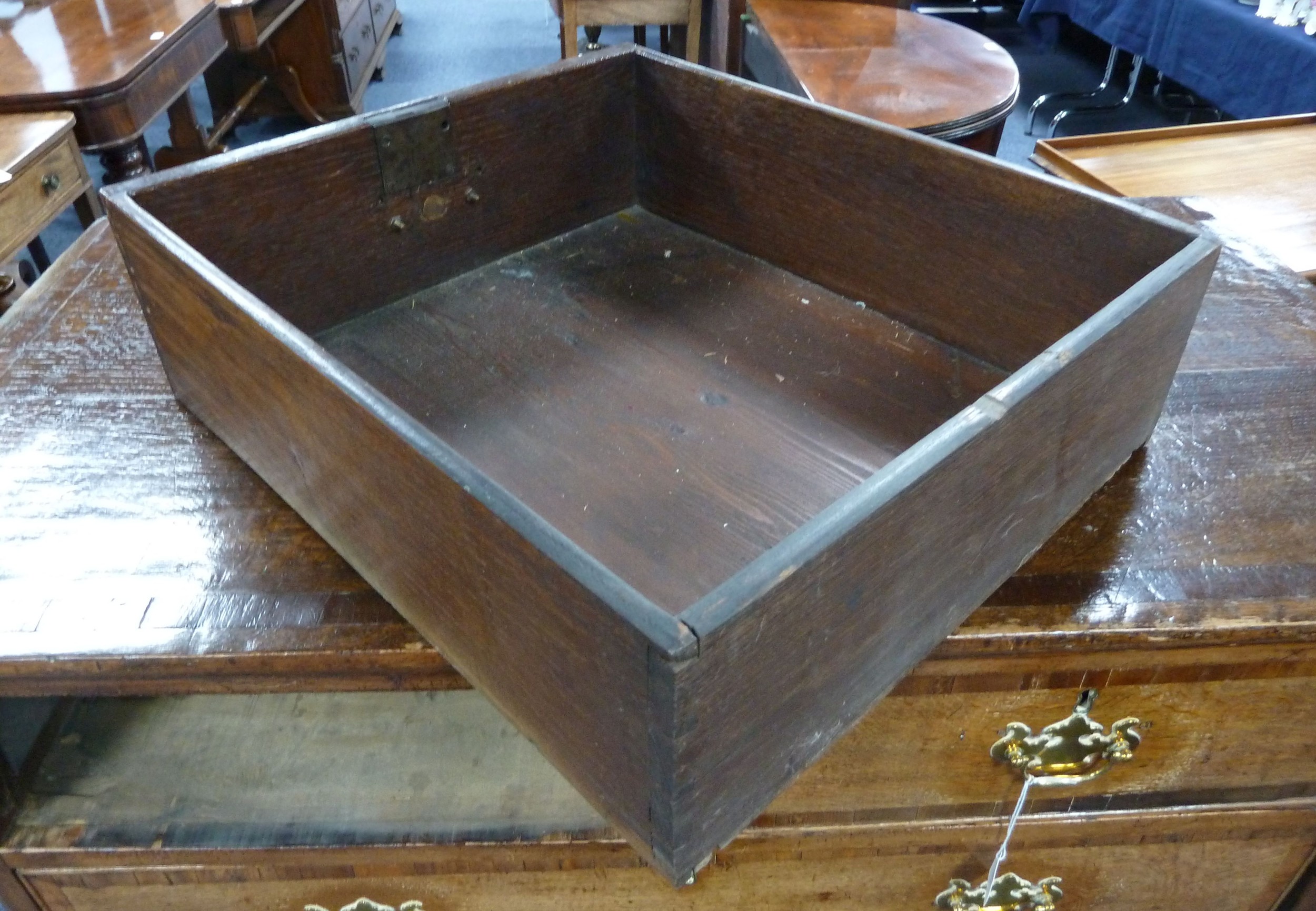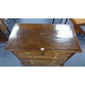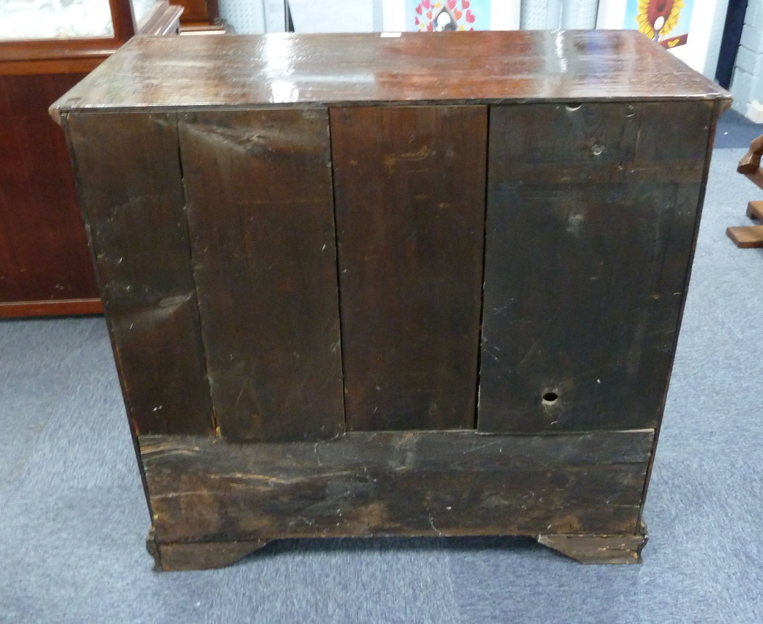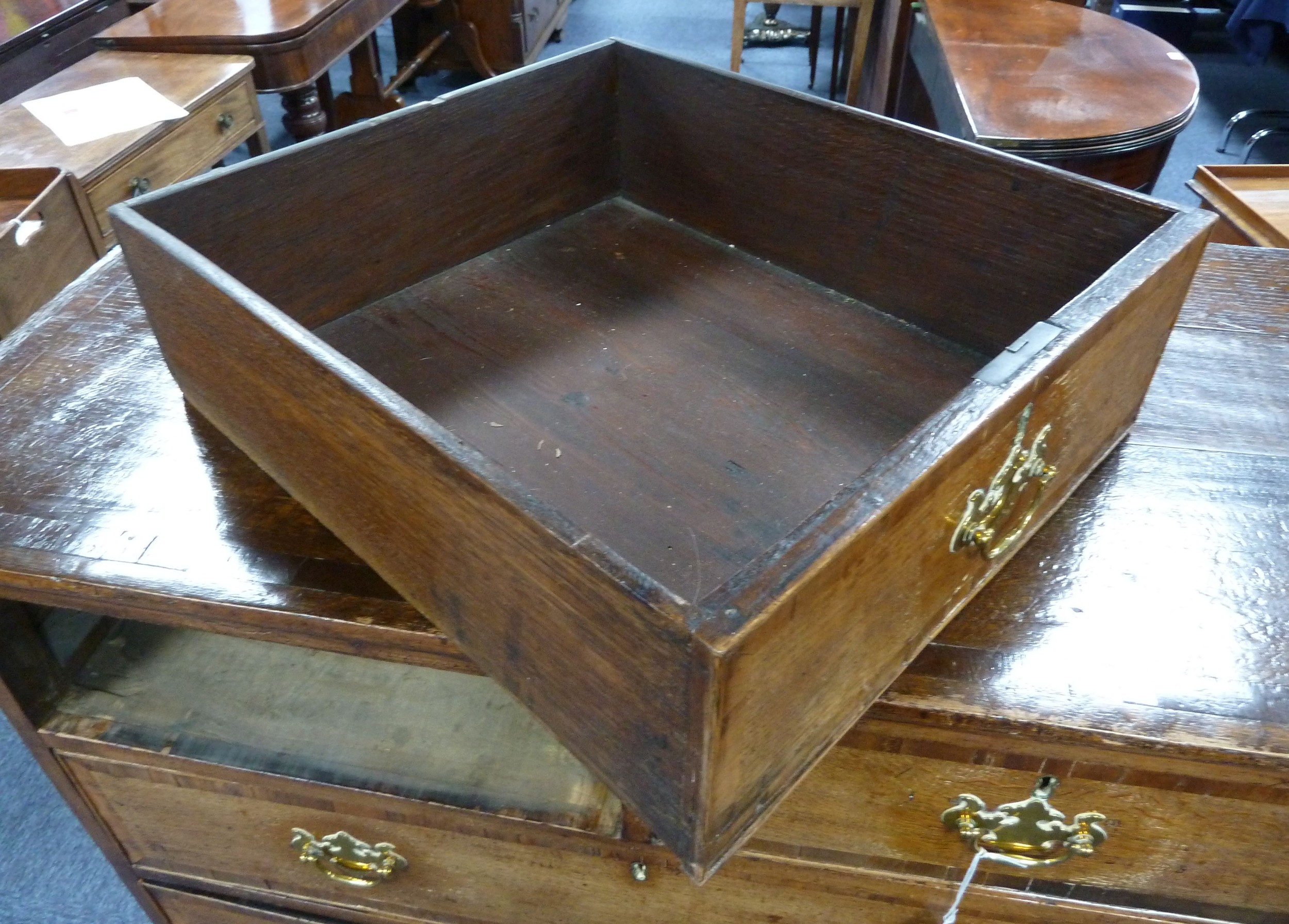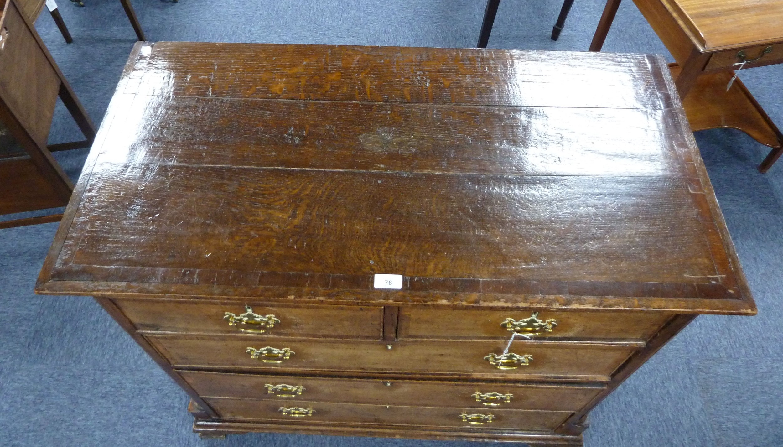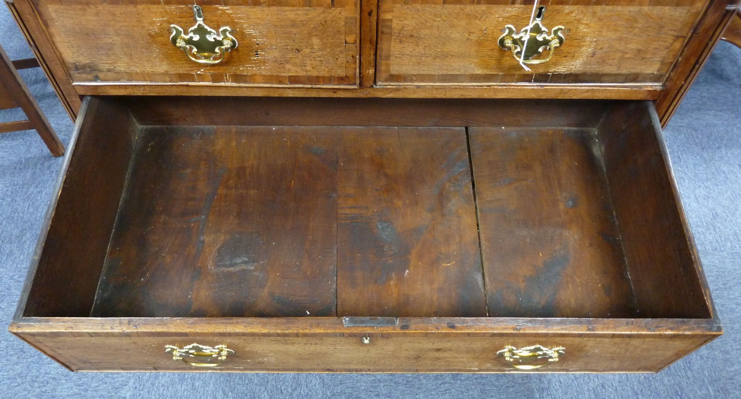 GEORGE III OAK AND MAHOGANY CROSSBANDED CHEST OF DRAWERS, the oblong top above two short and three long drawers, fitted with swan neck brass handles, flanked by fluted quarter columns to the fore corners, and raised on ogee bracket feet, 38 ½” (97.7cm) high, 40 ¼” x 20 ½” (102.2cm x 52cm)