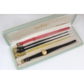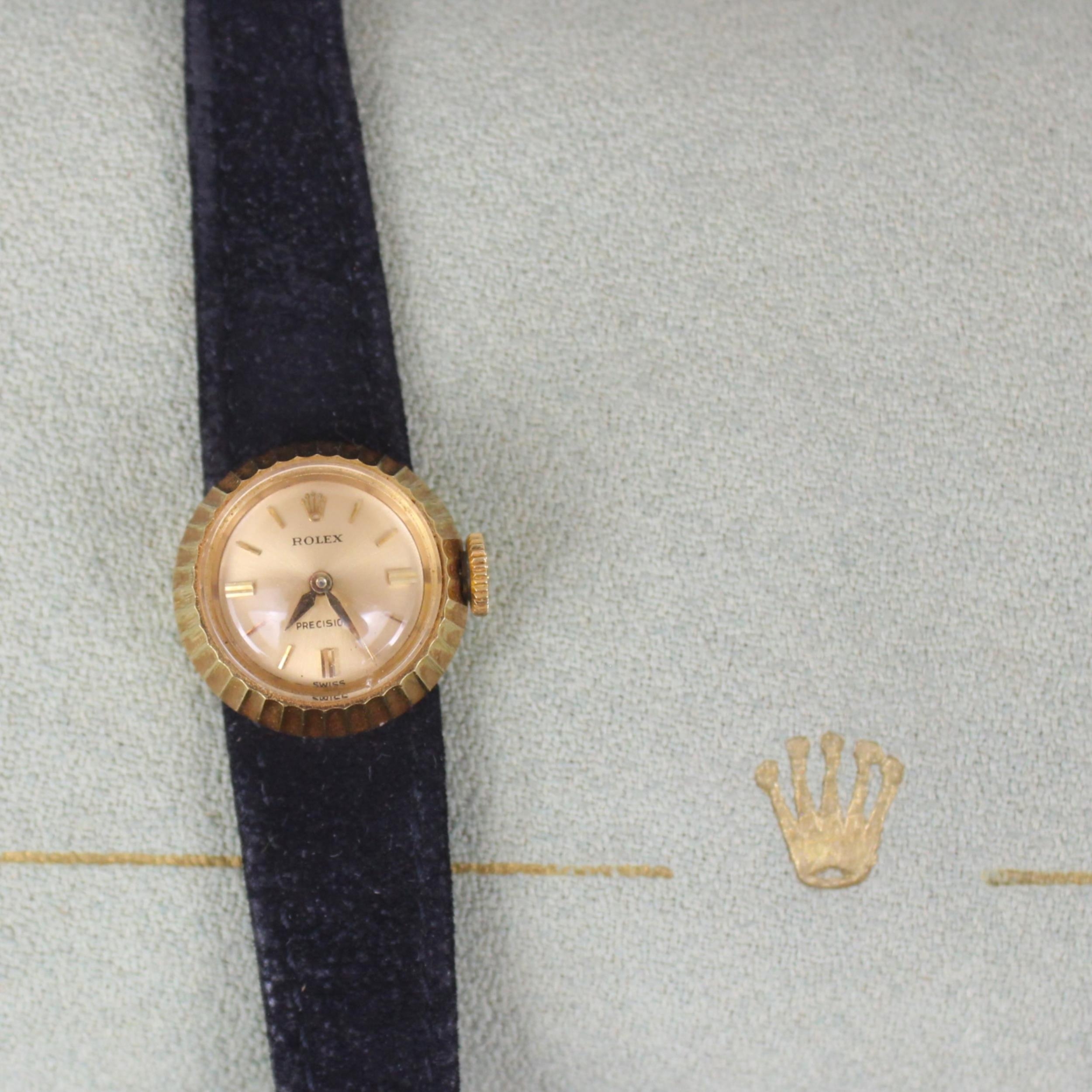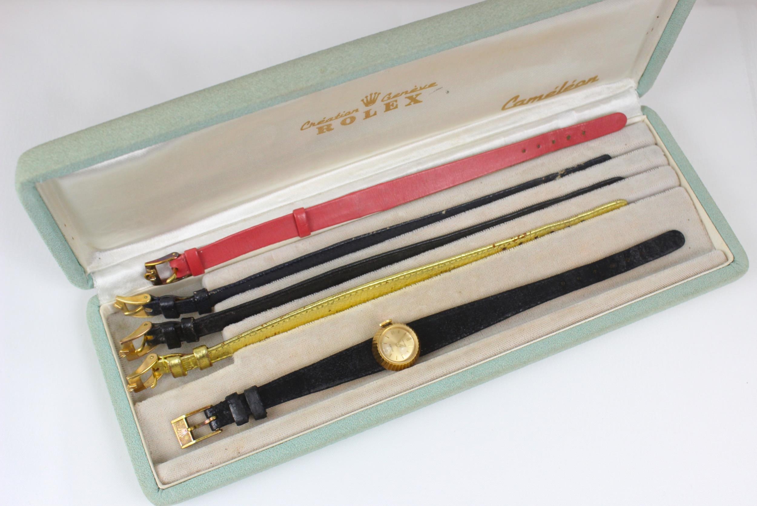 A ladies Rolex Precision Chameleon yellow metal wristwatch, the circular gold coloured dial with baton markers and fluted case, 1.8cm wide (including crown) stamped 'Modele depose 598288' upon a Rolex of Geneva suede strap, within a Rolex 'Cameleon' box with three further interchangable 'Cameleon' Rolex straps and one Omega strap
