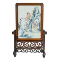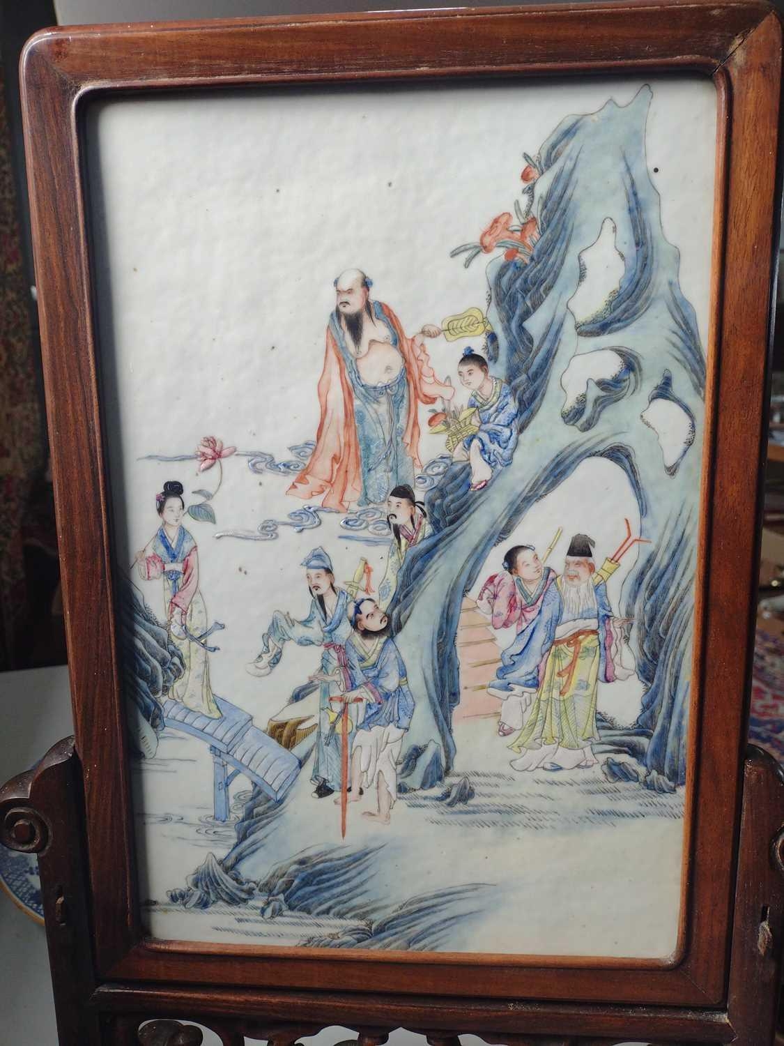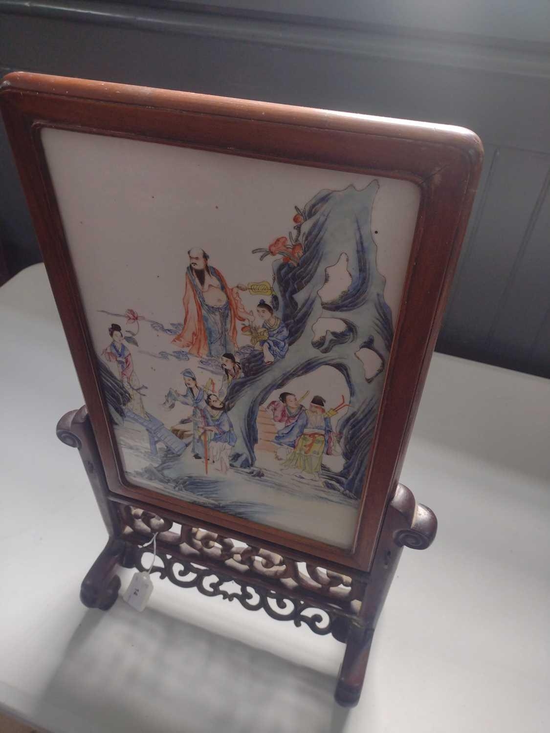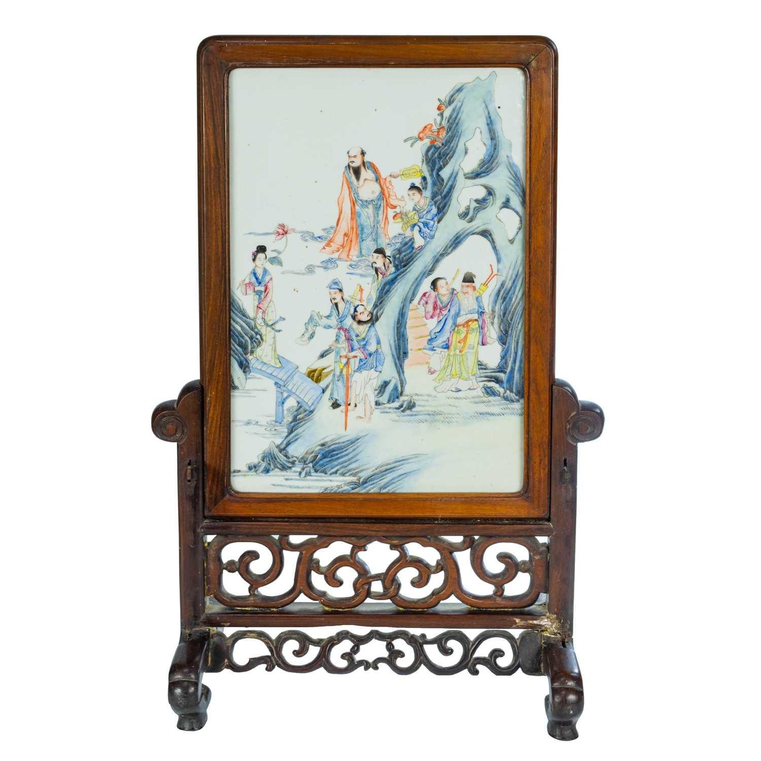 A Chinese famille rose porcelain and hardwood framed table screen, 19th century. Decorated with a buddha, four sages and three female figures, height 59cm, width 38cm, size of plaque 37 x 24cm.