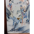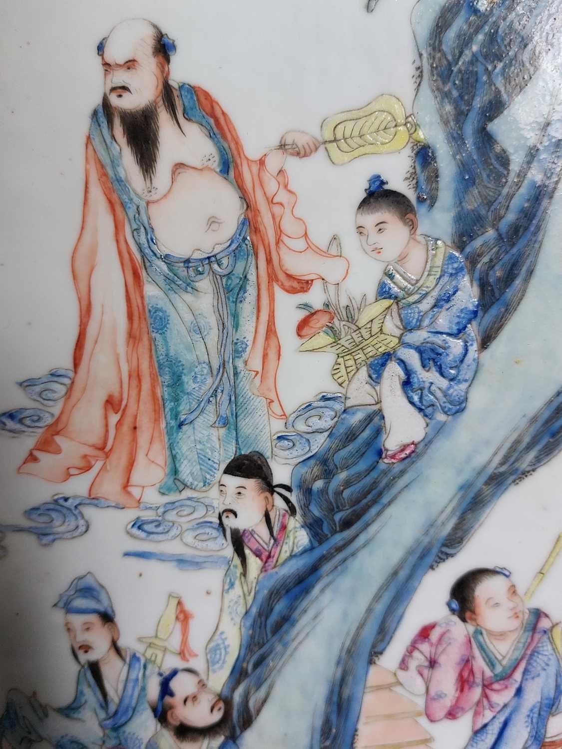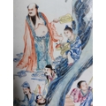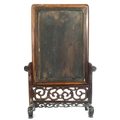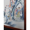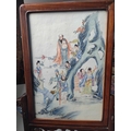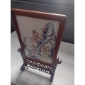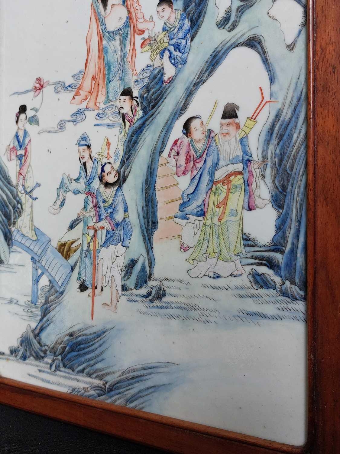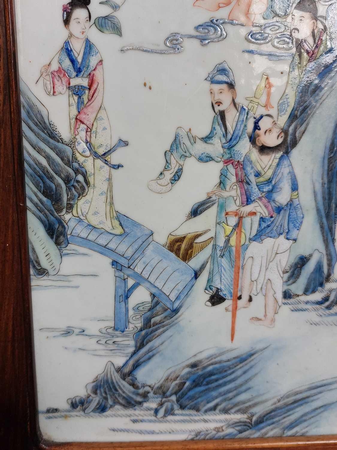 A Chinese famille rose porcelain and hardwood framed table screen, 19th century. Decorated with a buddha, four sages and three female figures, height 59cm, width 38cm, size of plaque 37 x 24cm.