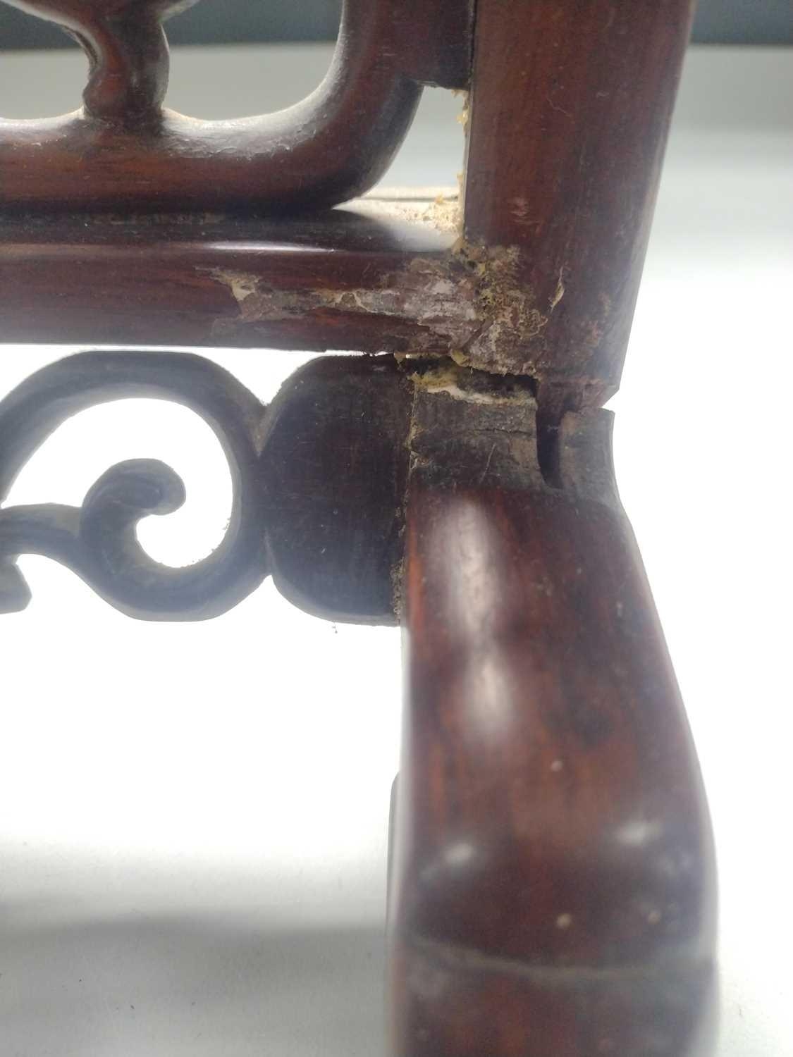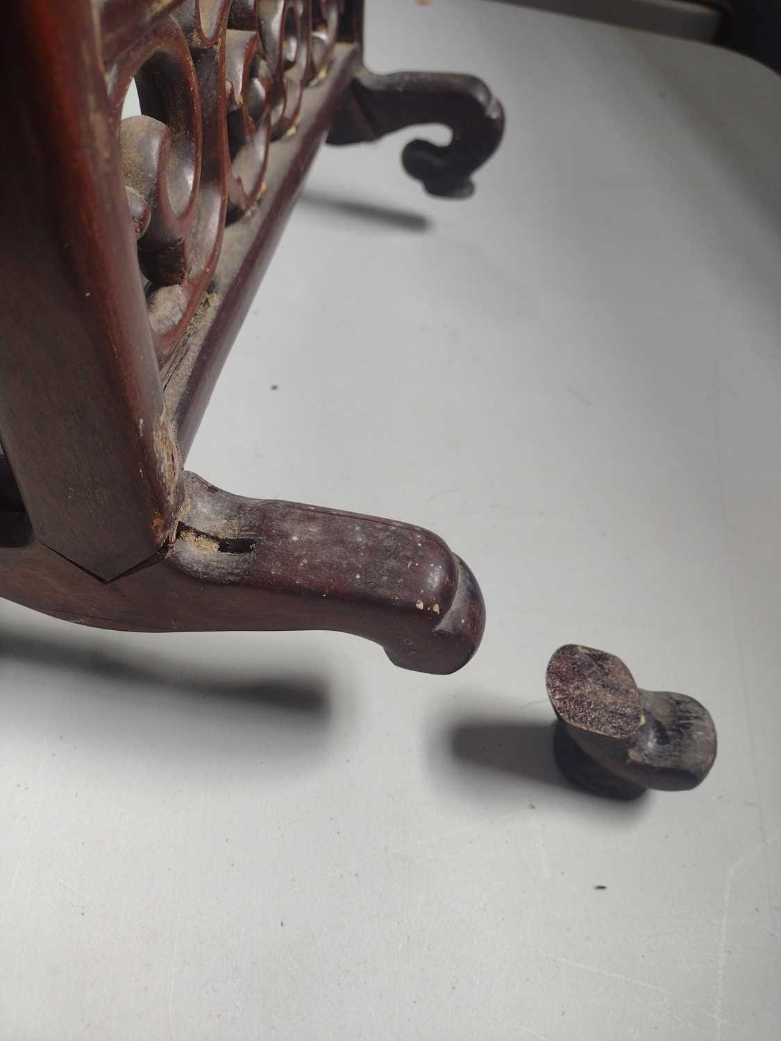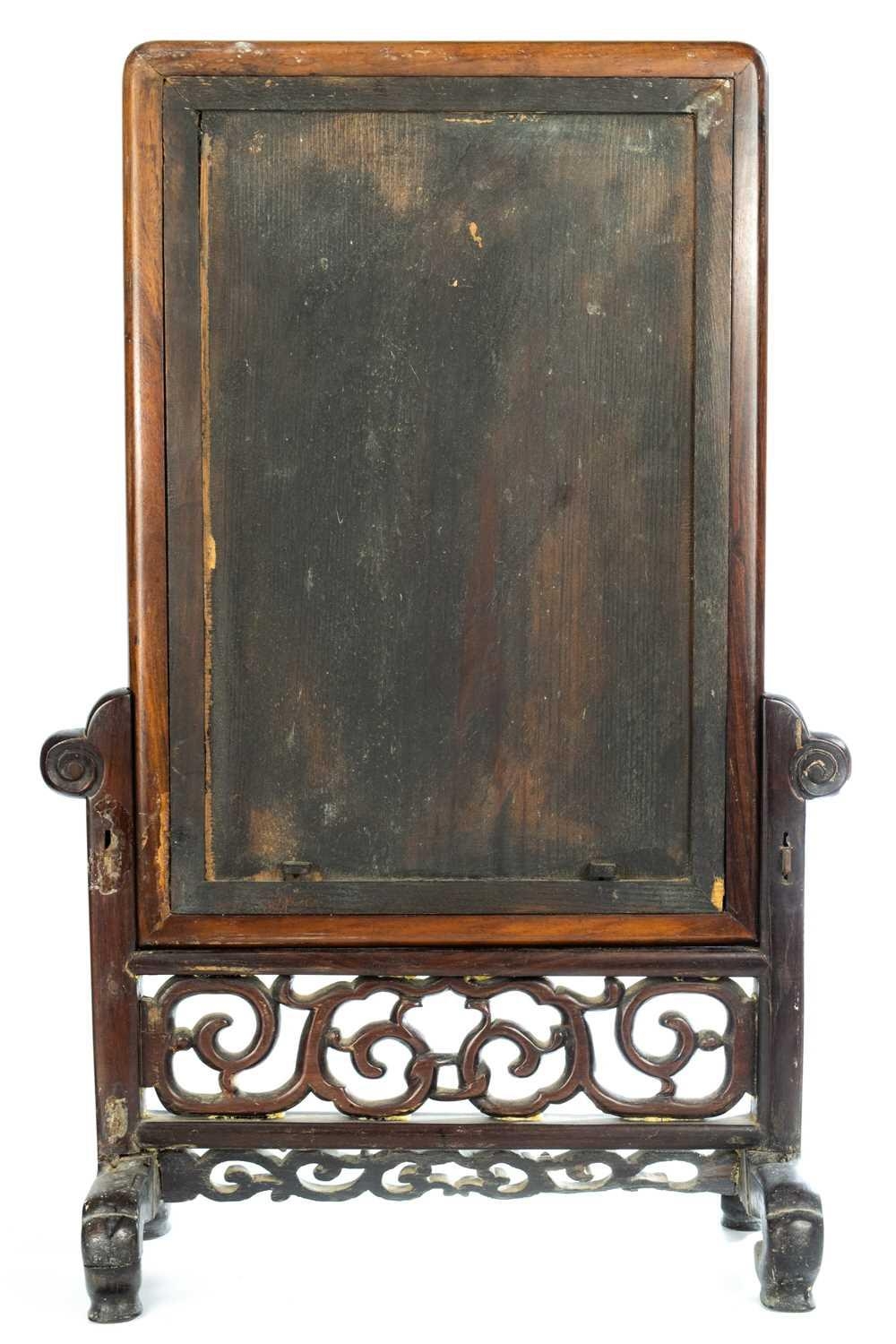 One foot requires regluing. Some signs of previous treated worm to the frame. Lower right hand-side showing frailty where the screen matches with the base, but still standing firm. Some natural pitting to the porcelain.