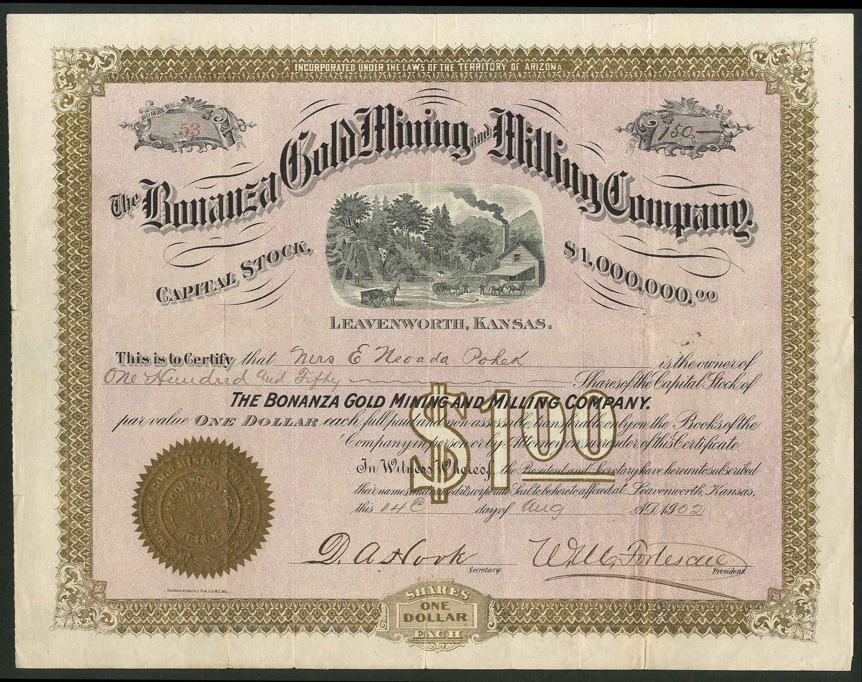 U.S.A.: Bonanza Gold Mining and Milling Company, Arizona, $1 shares, Leavenworth, Kansas 19[02], #53, mine in centre, gold and black with mauve underprint. Property in the Casa Grande Mining District, Pinal County, Arizona. Folds, VF.