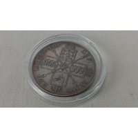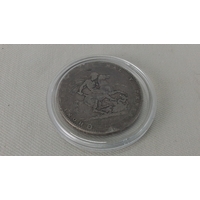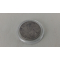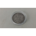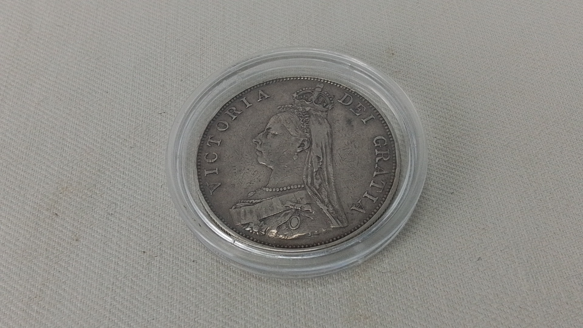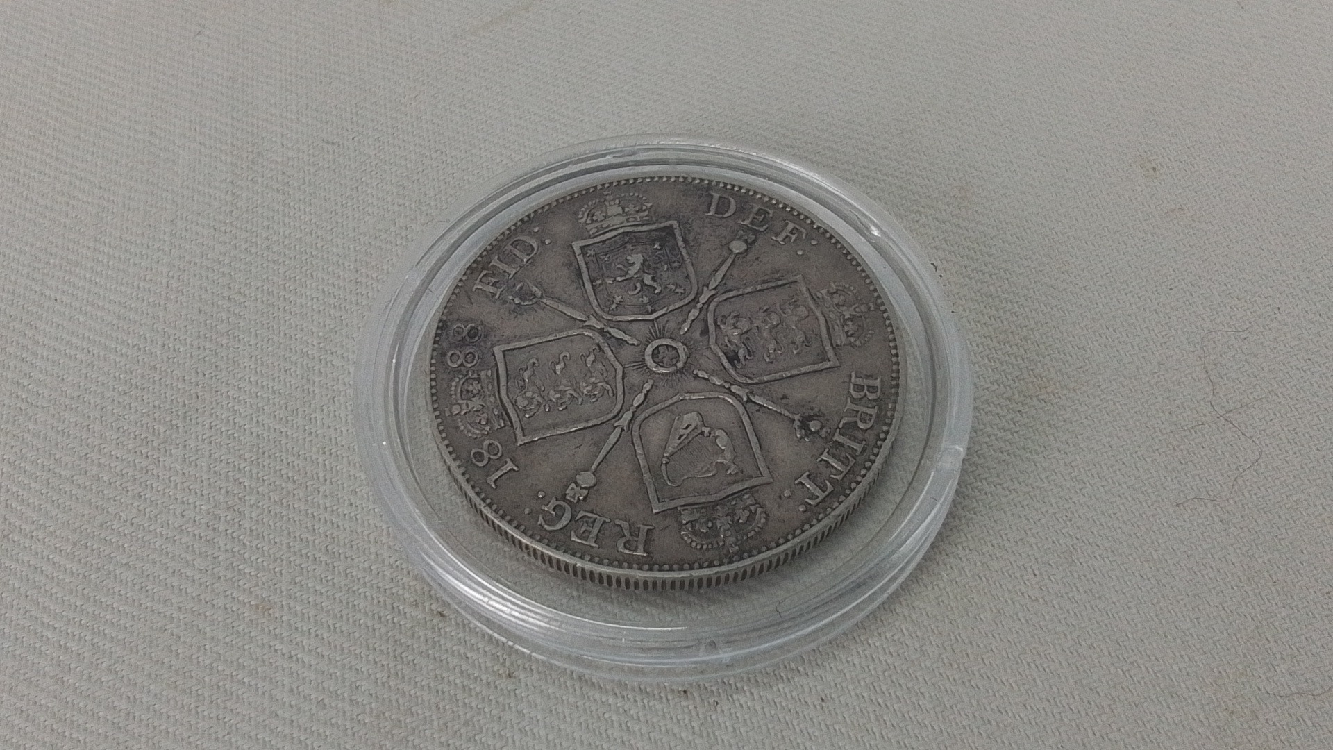 British Silver Double Florin coin of Queen Victoria, dated 1888, in a clear protective capsule; obverse with Victoria portrait, reverse with cruciform shields and crowned emblems within legend.