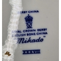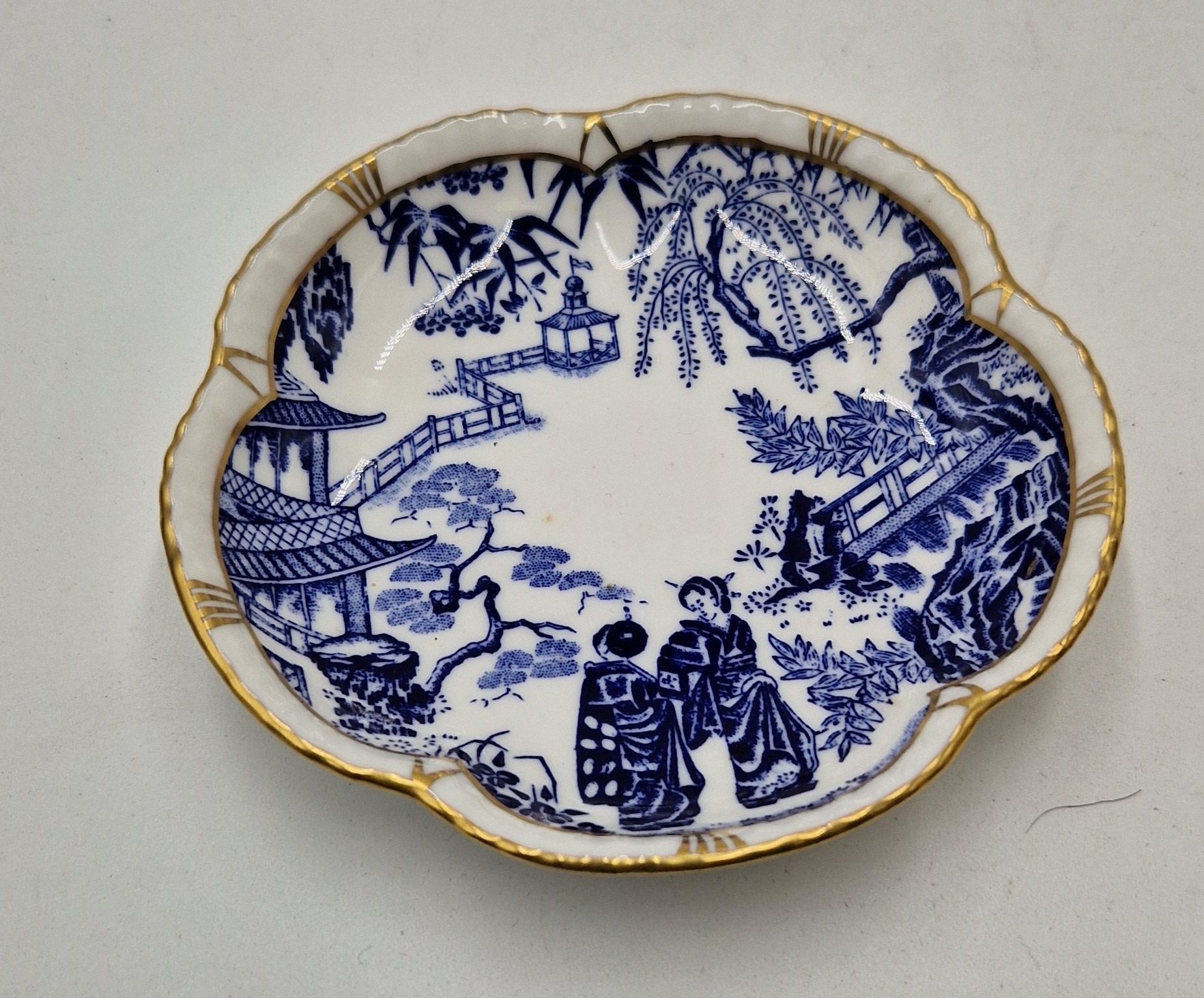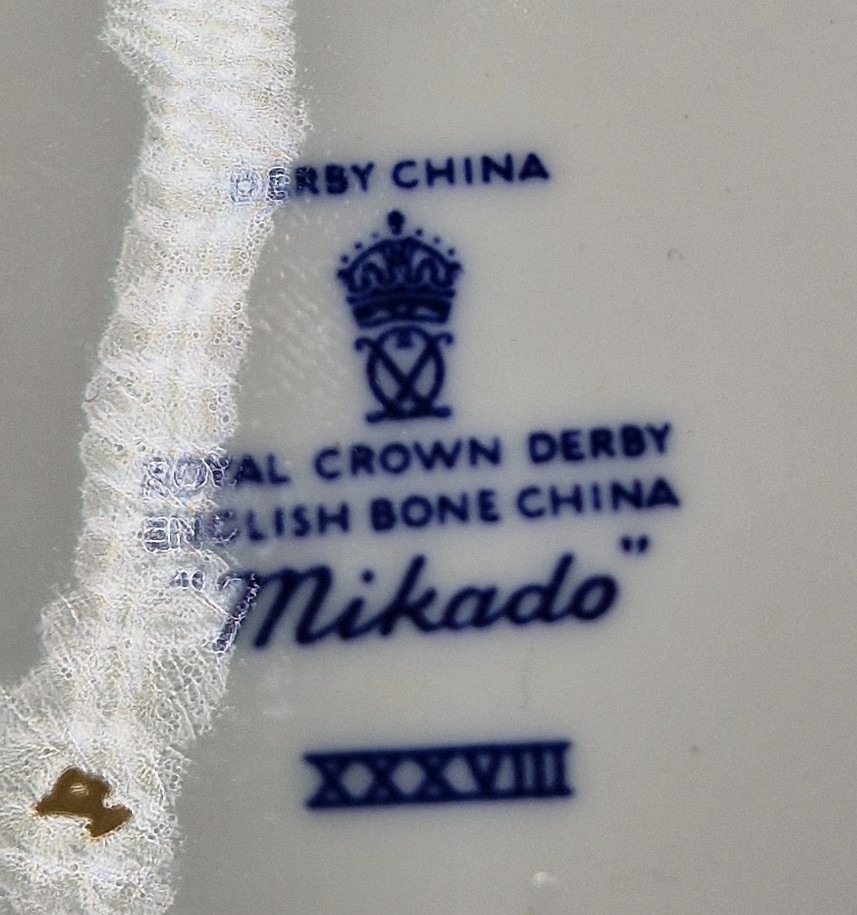 ROYAL CROWN DERBY CHINA 11.5cm Dia BLUE / WHITE PIN DISH IN THE MIKADO DESIGN DEPICTING JAPANESE MOTIFS,FIGURINES BY A PAGODA With INTRICATE GILDED HIGHLIGHTS