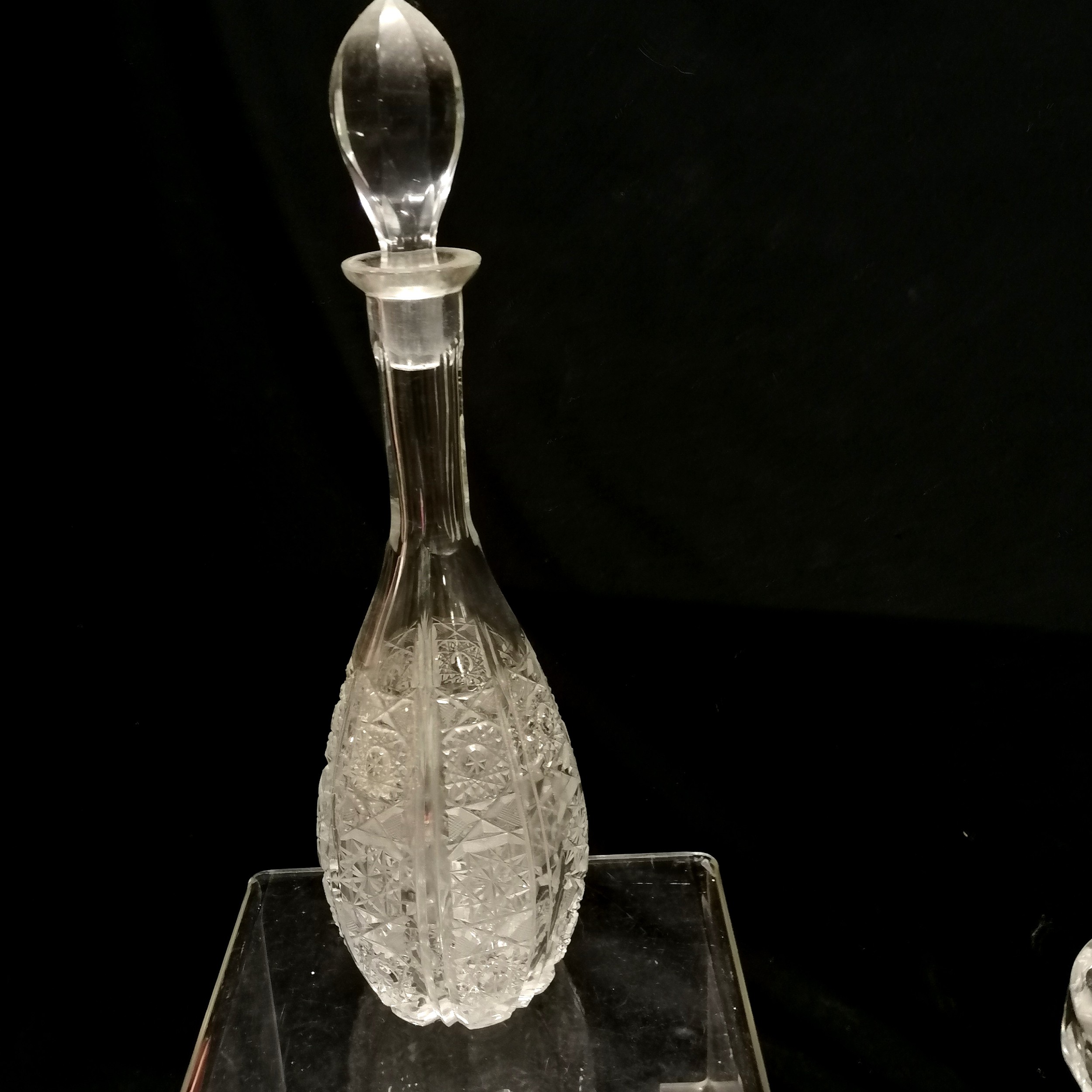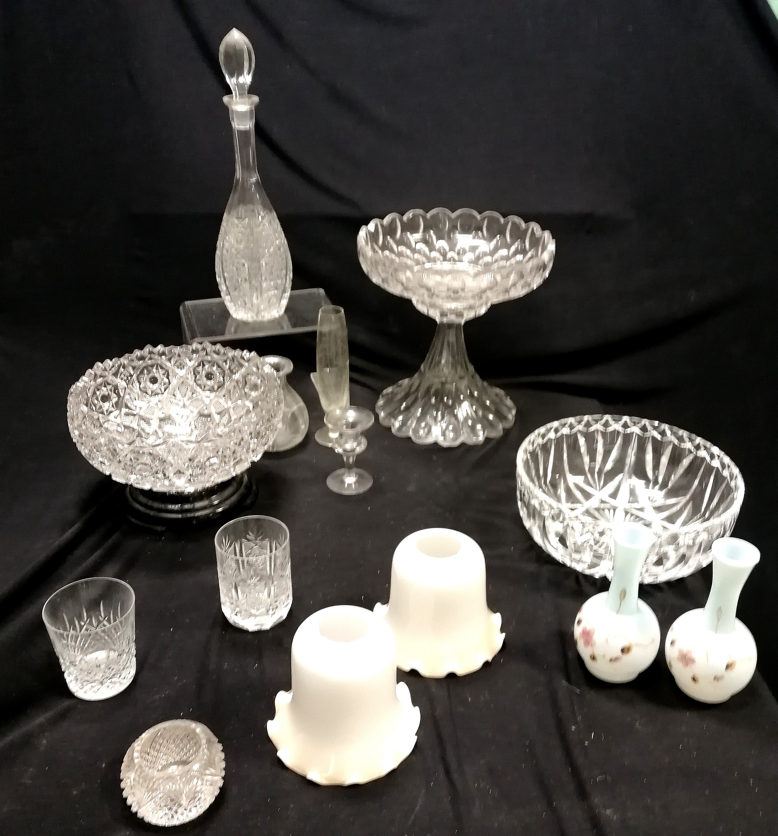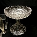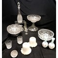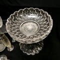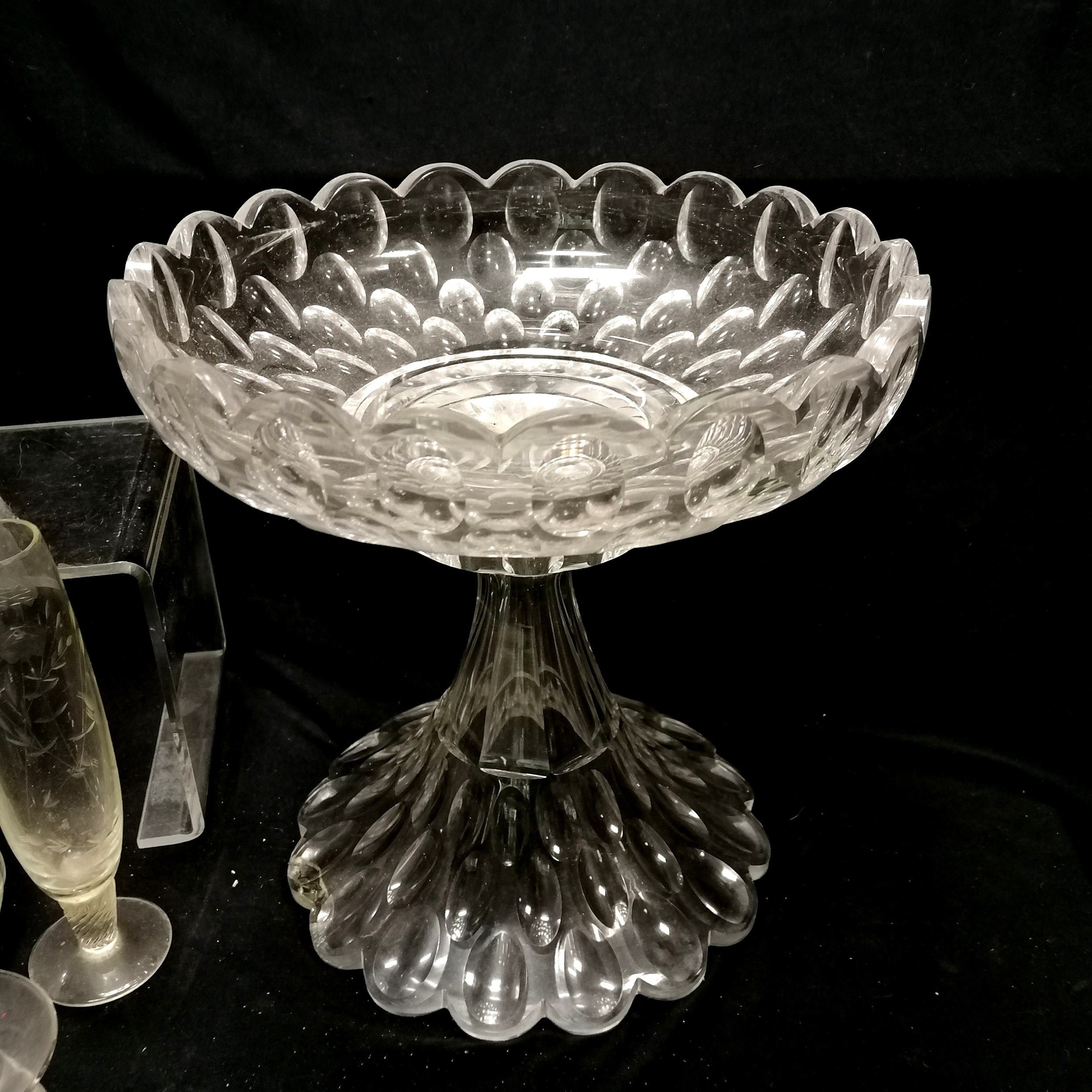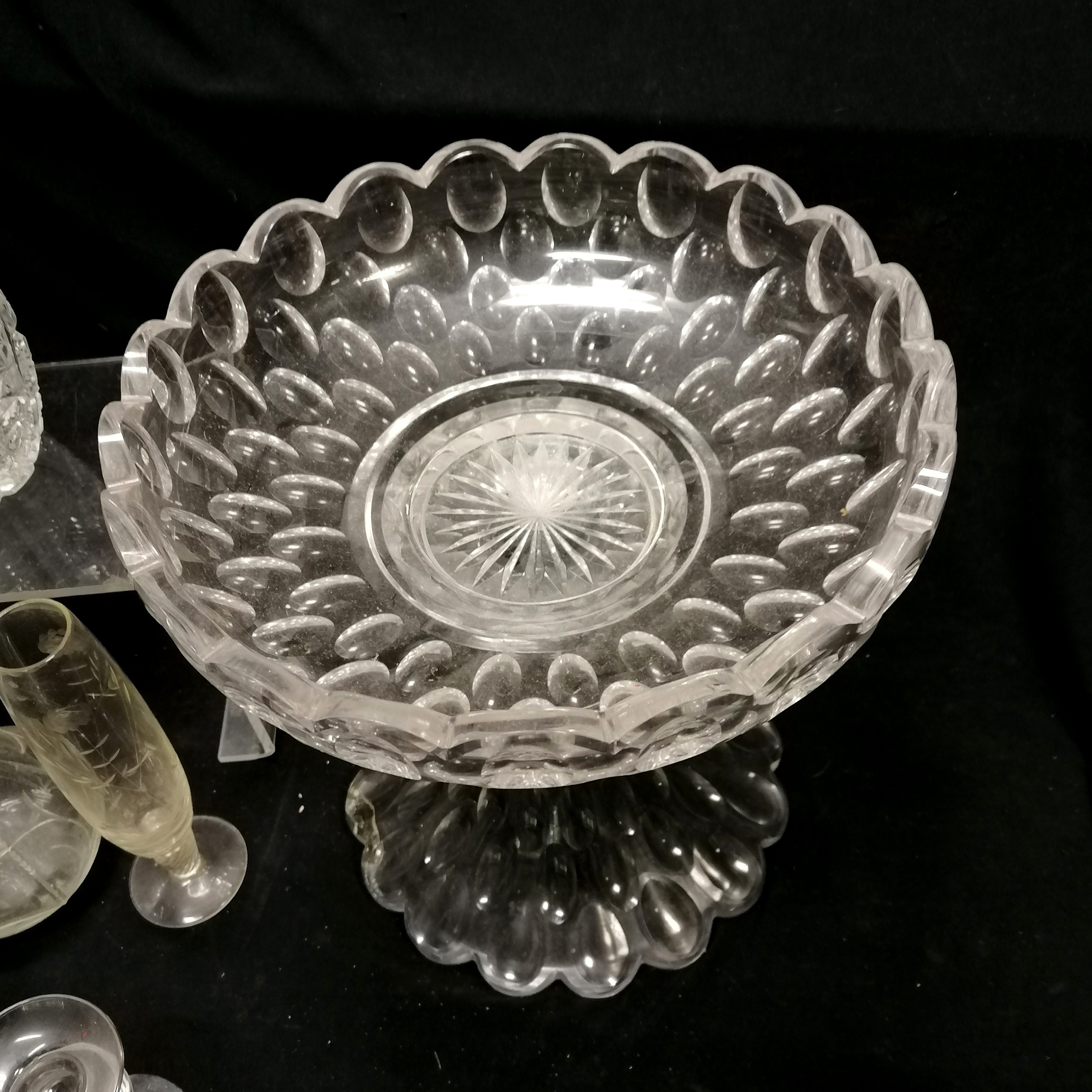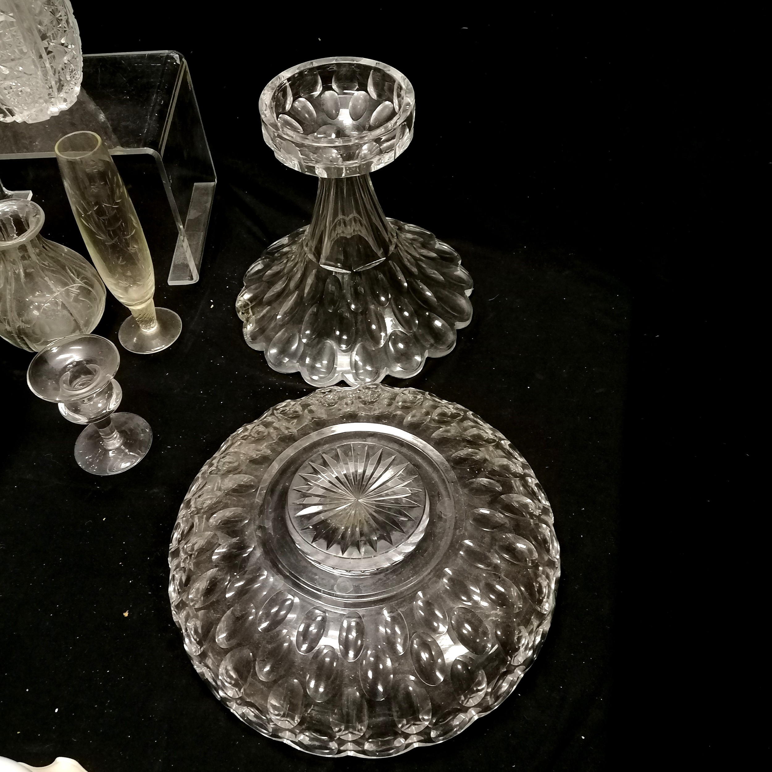 Qty of glassware inc antique Irish (?) 2 part tazza / centrepiece with deep cut detail (28cm diameter x 28cm high & has chip to base),