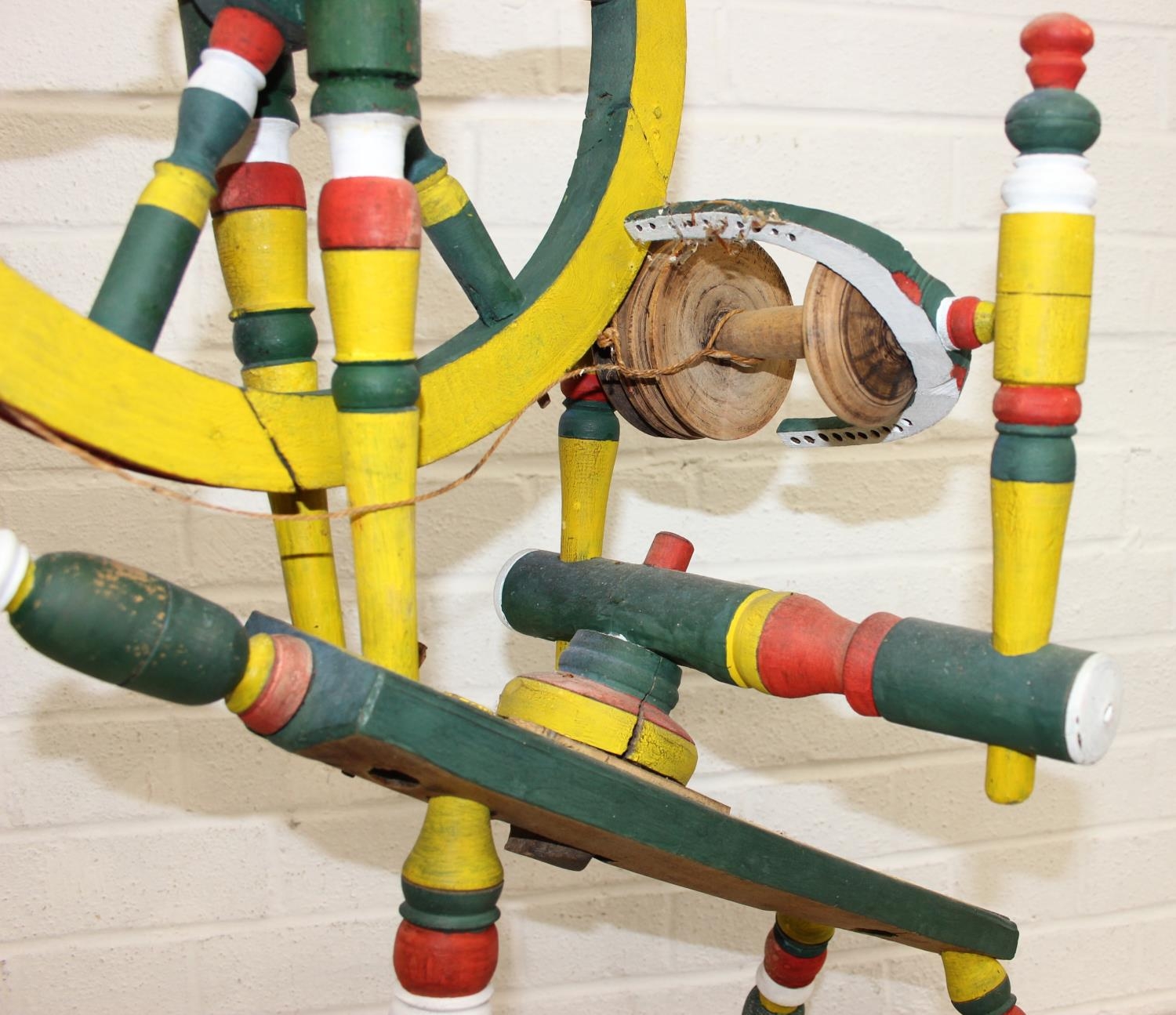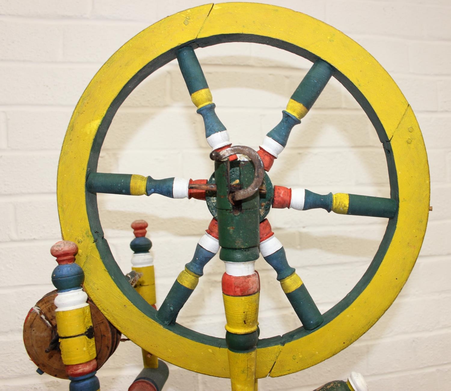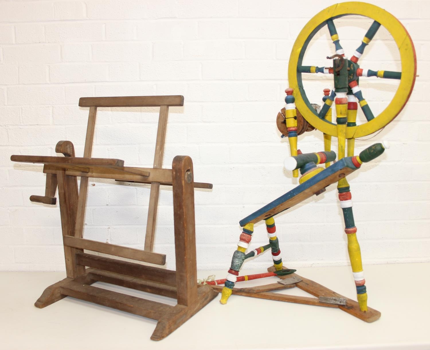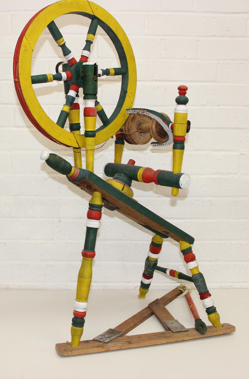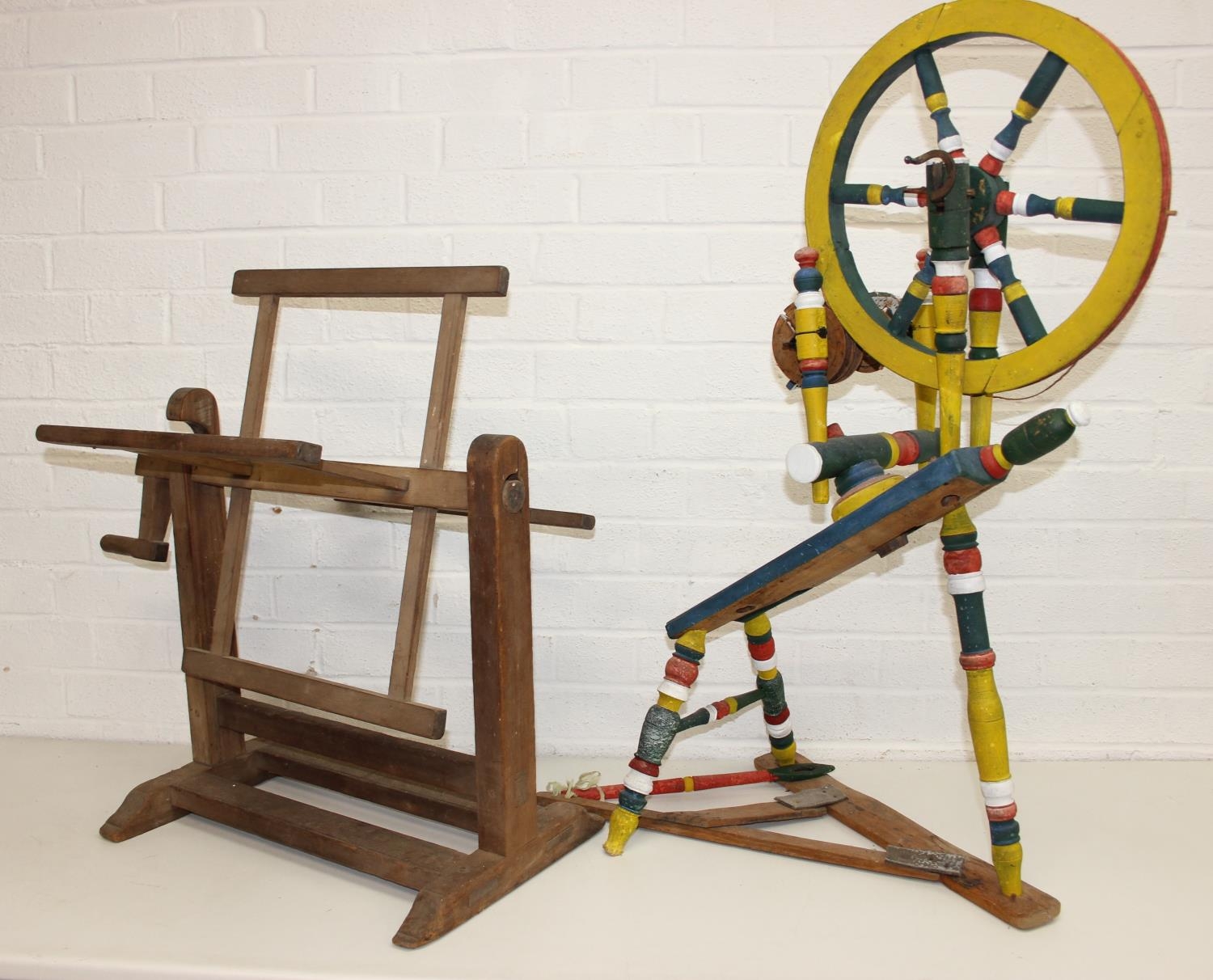 Vintage spinning wheel painted in a barge ware style, and antique wool winder in pine, the wool winder 64cm x 49cm x 67cm [2]