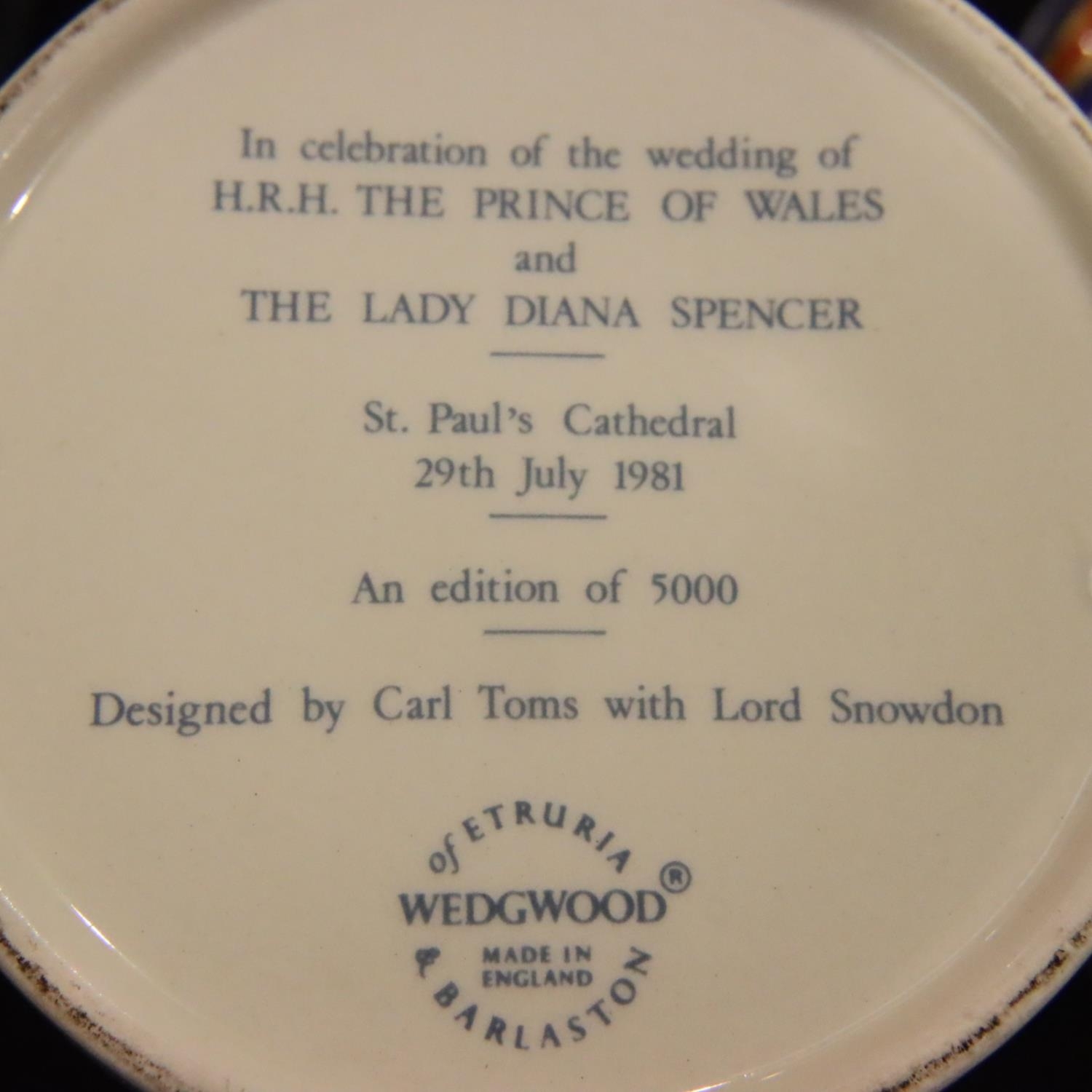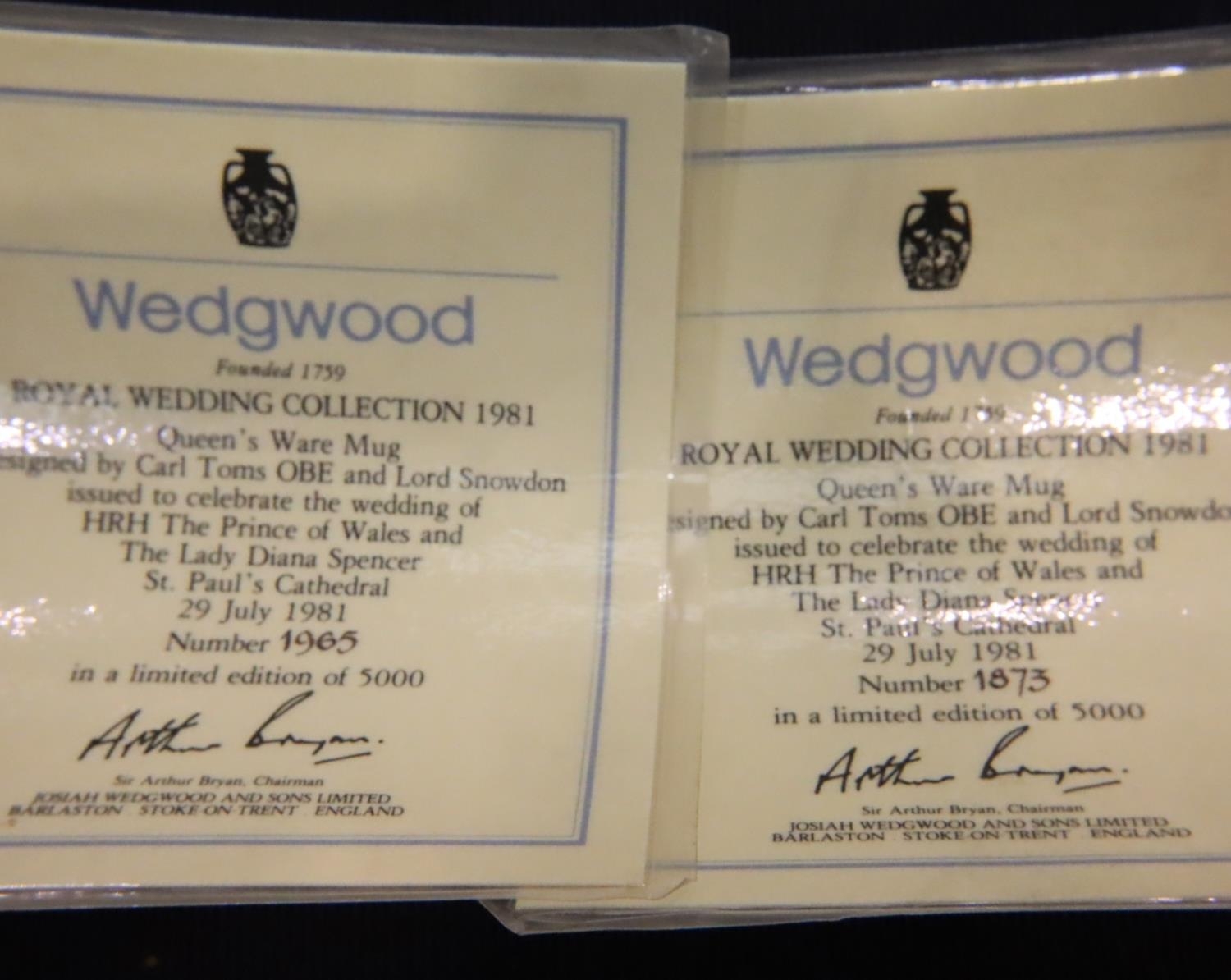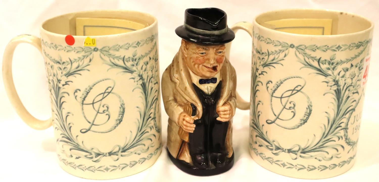 Two Wedgwood Royal Wedding 1981 Queens ware mugs, each limited edition of 5000, these being 1872 and 1965, each with C.O.A, together with a Royal Doulton Winston Churchill character jug. P&P Group 3 (£25+VAT for the first lot and £5+VAT for subsequent lots)