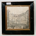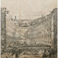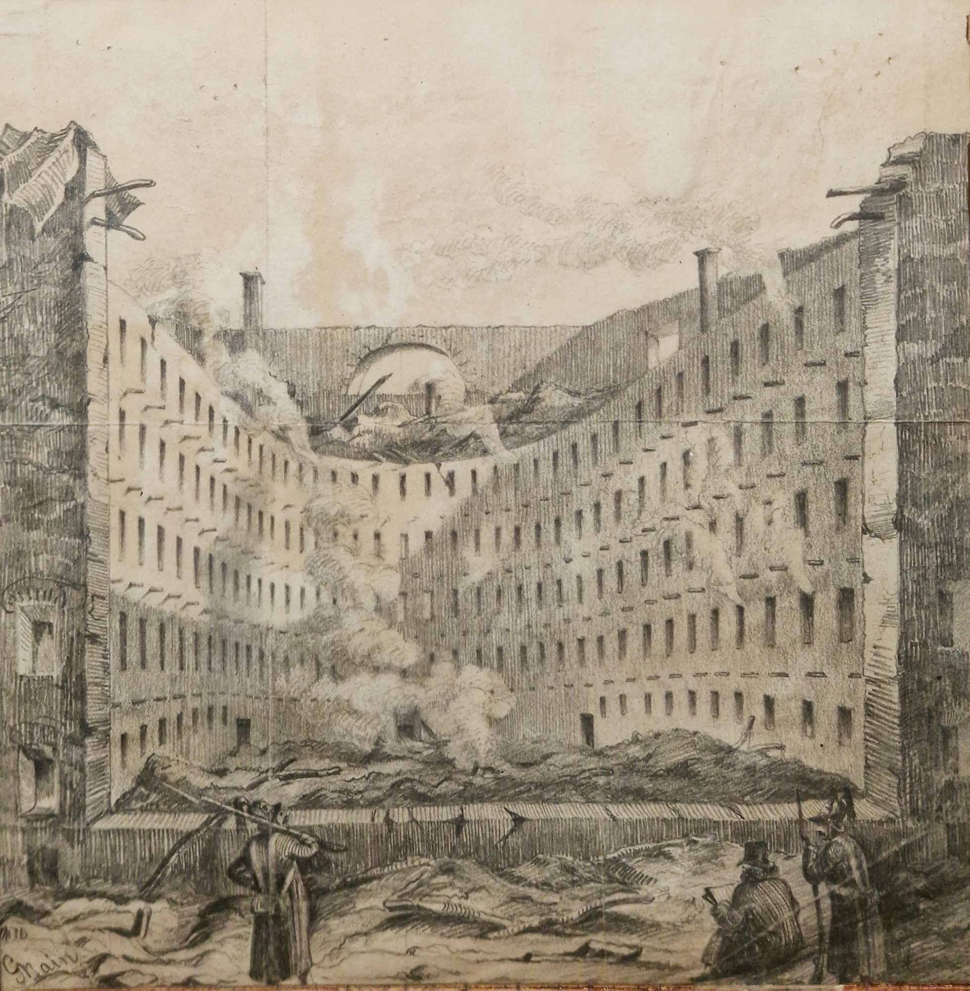 Sketch showing the remains of the Russian Imperial Theatre (Bolshoi Theatre) after a fire in 1853 after an engraving published in the Illustrated London News, signed lower left, framed and glazed, image size 17.5cm x 17.5cm