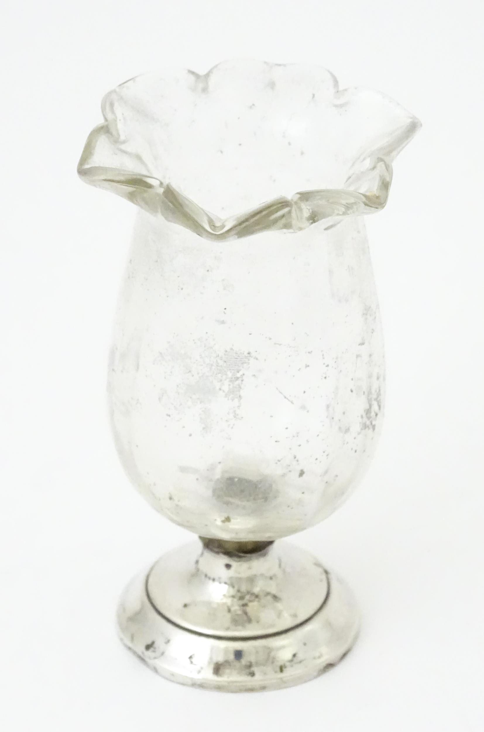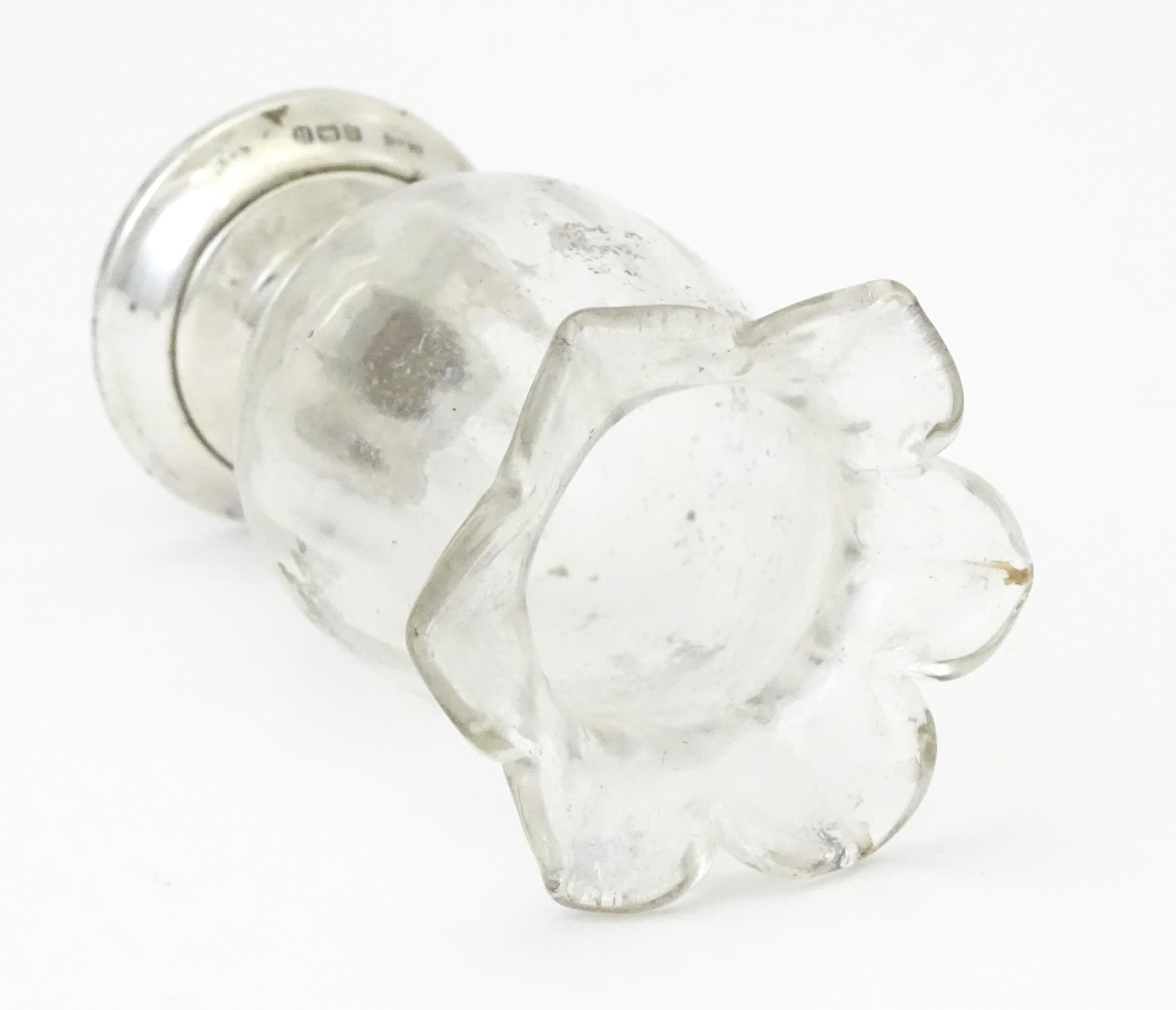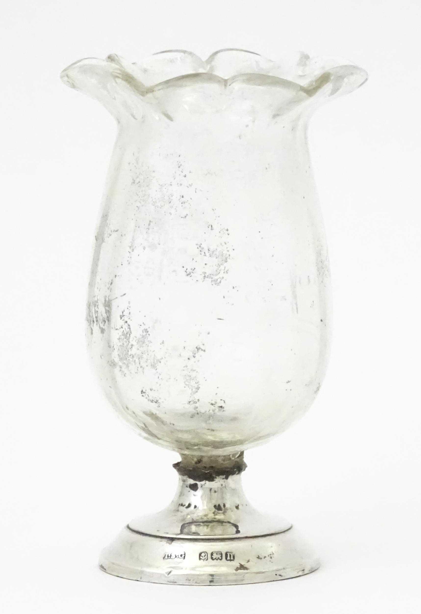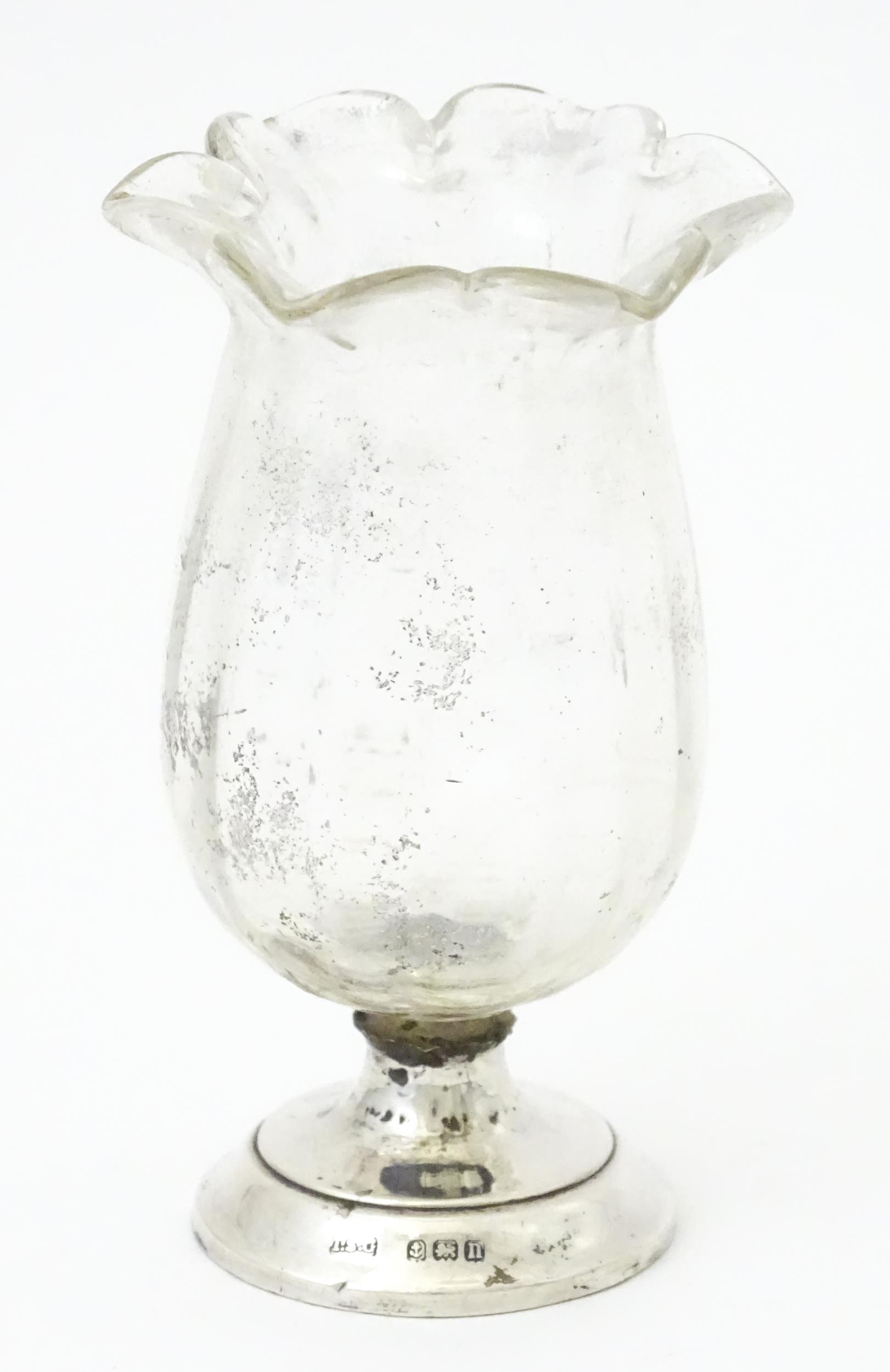 A glass vase with silver base hallmarked Birmingham 1912, maker I S Greenberg & Co. Approx. 3 1/4" high