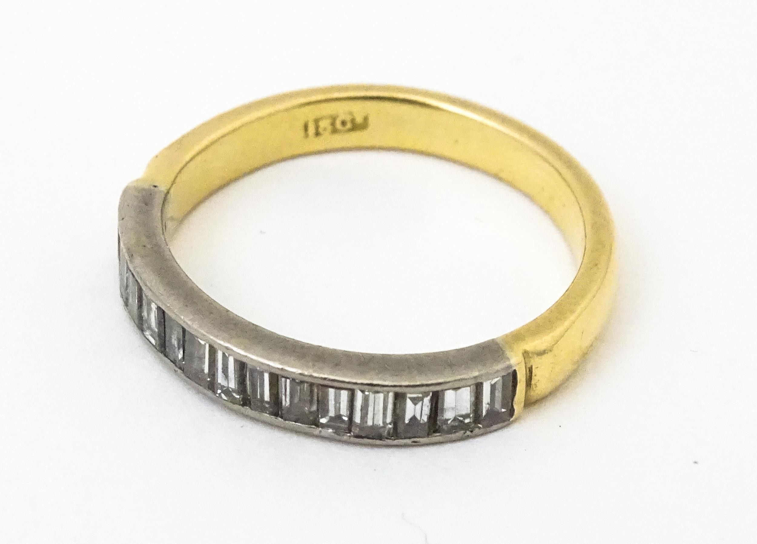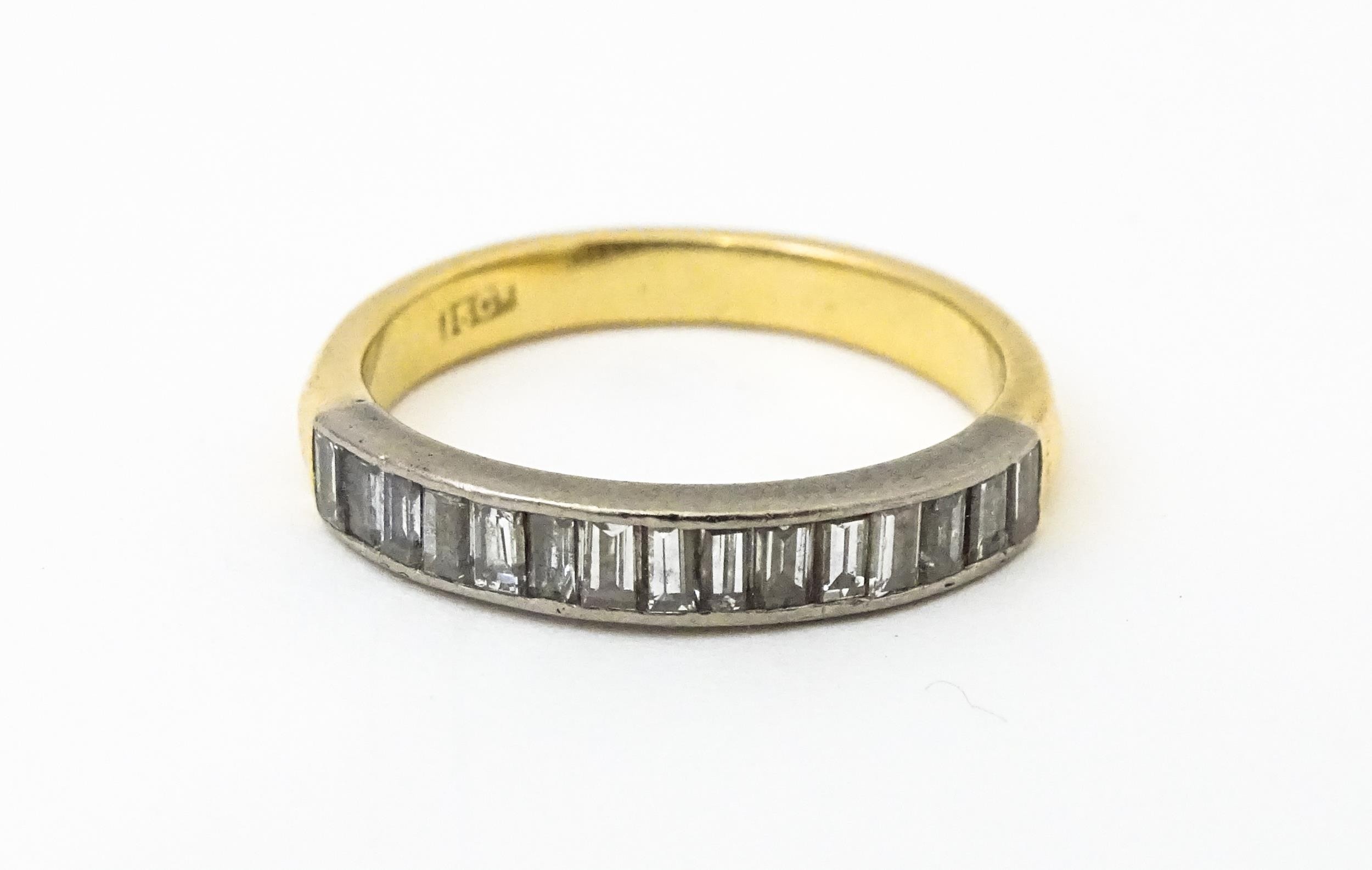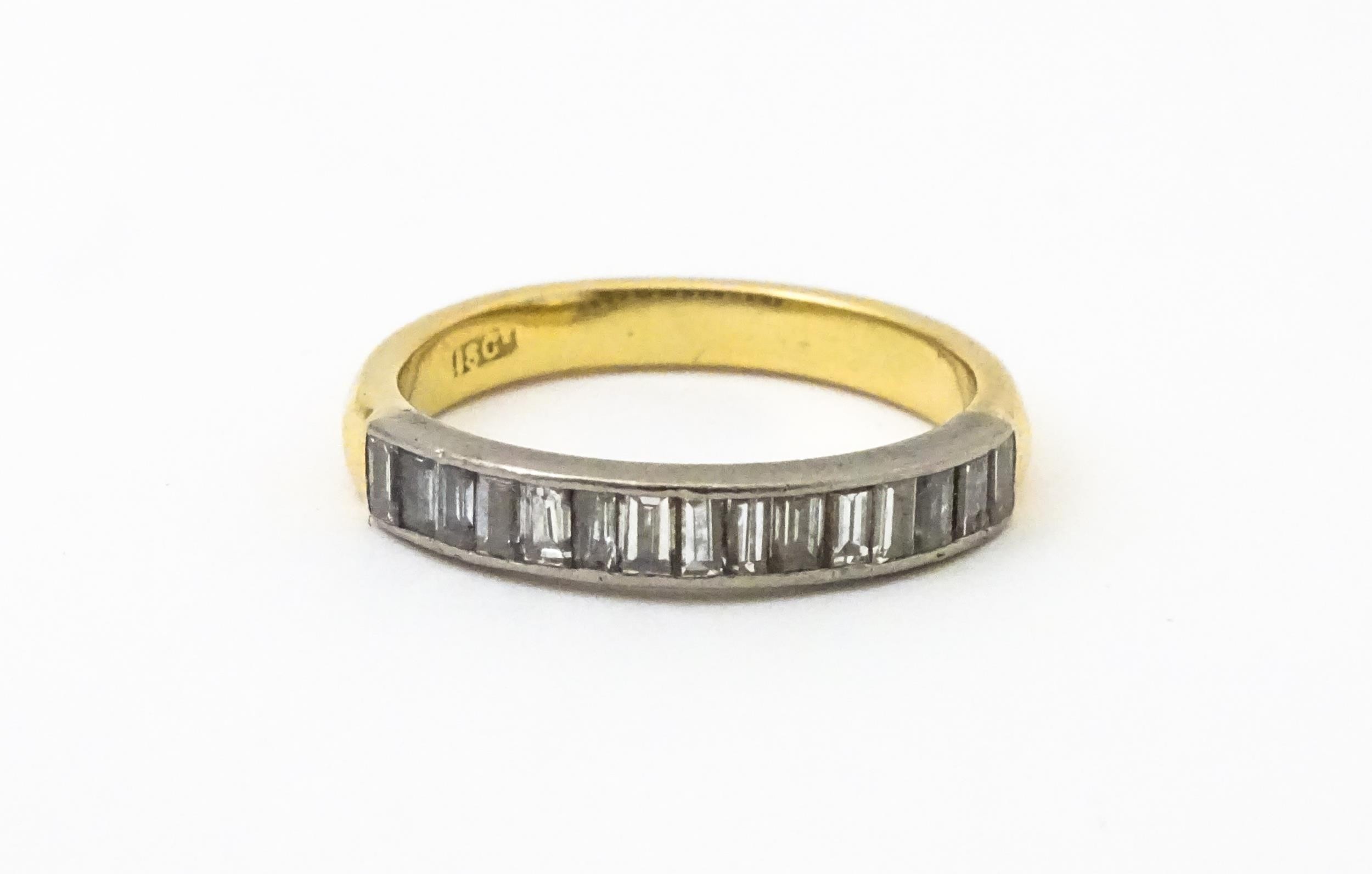 An 18ct gold half eternity ring set with 15 baguette cut diamonds. Ring size approx. M 1/2