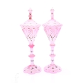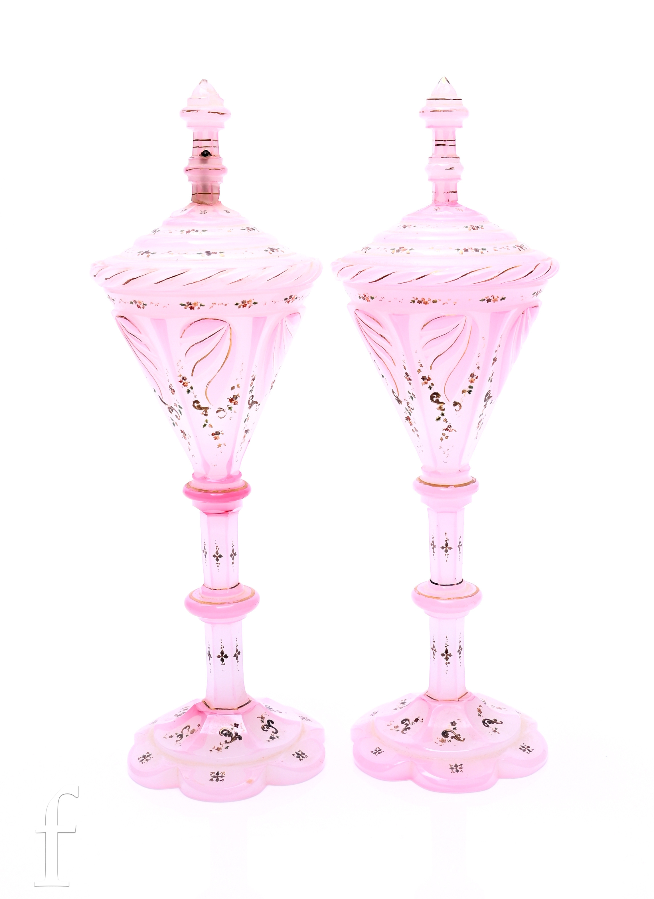 A pair of 19th Century Bohemian pedestal cups and covers, the conical bowl with a stepped cover and finial top, raised to a slice cut ringed stem, above a faceted petal edged foot, the whole cased in pale pink over opal and flash cut with gilded and enamelled highlights, height 33cm, one with damage to the finial. (2)