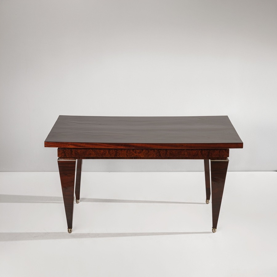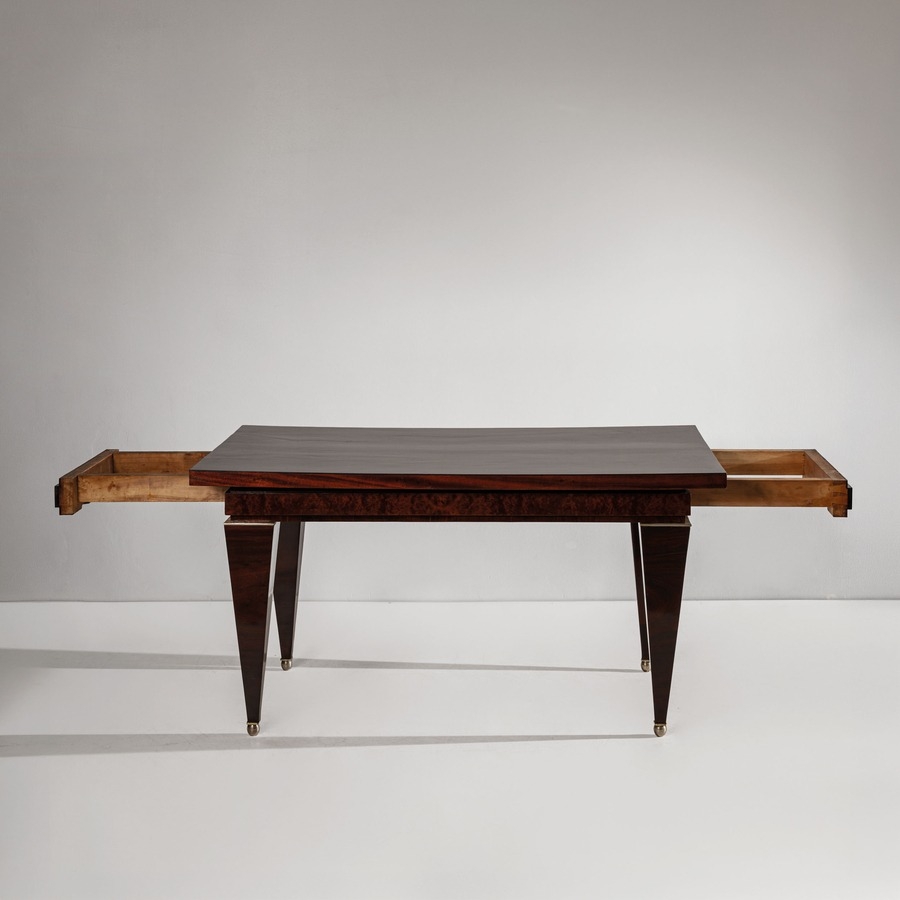 Tavolo allungabile. Legno di mogano, radica di tuja, ottone nichelato. Italia anni '20. Perizia Gio Ponti Archives