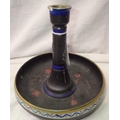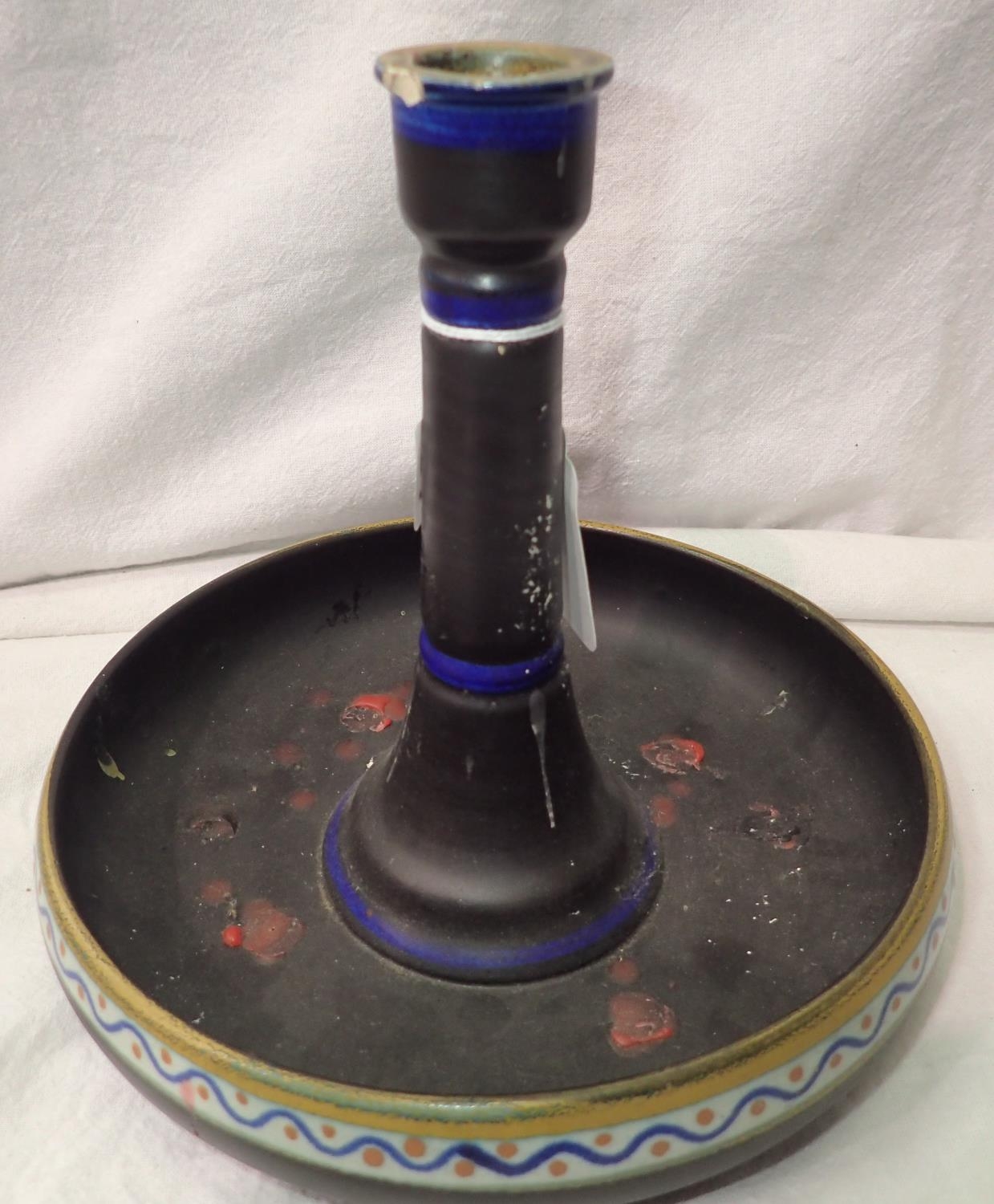 Gouda candlestick with incorporated drip tray, approximate H: 23 cm, chip to top. P&P Group 2 (£18+VAT for the first lot and £3+VAT for subsequent lots)