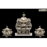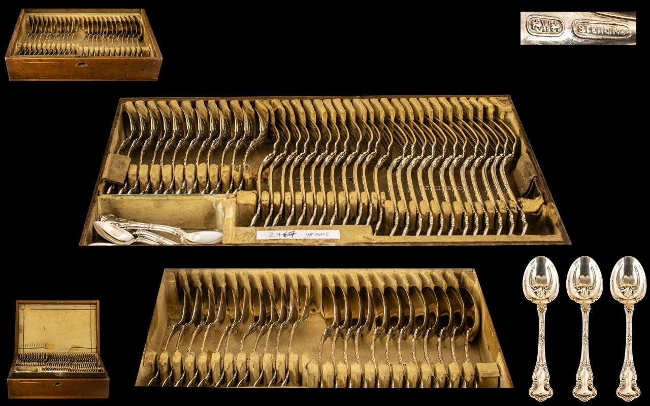 American 19th Century Superb Quality - Junior Rococo Pattern Sterling Silver ( 71 ) Piece Canteen of Cutlery with Original Wooden Display Box. c.1885. Contents - 12 Large Table Forks, 12 Dessert Forks, 12 Tea-Spoons, 12 Coffee Spoons, 12 Large Table Spoons, 11 Dessert Spoons ( Junior Rococo Pattern ) All Pieces In Wonderful Condition, Makers Mark for Wendell Manufacturing Company, Chicago, IL, Top American Silversmiths. Silver Weight 80 ozs, Marked Sterling to All Pieces.