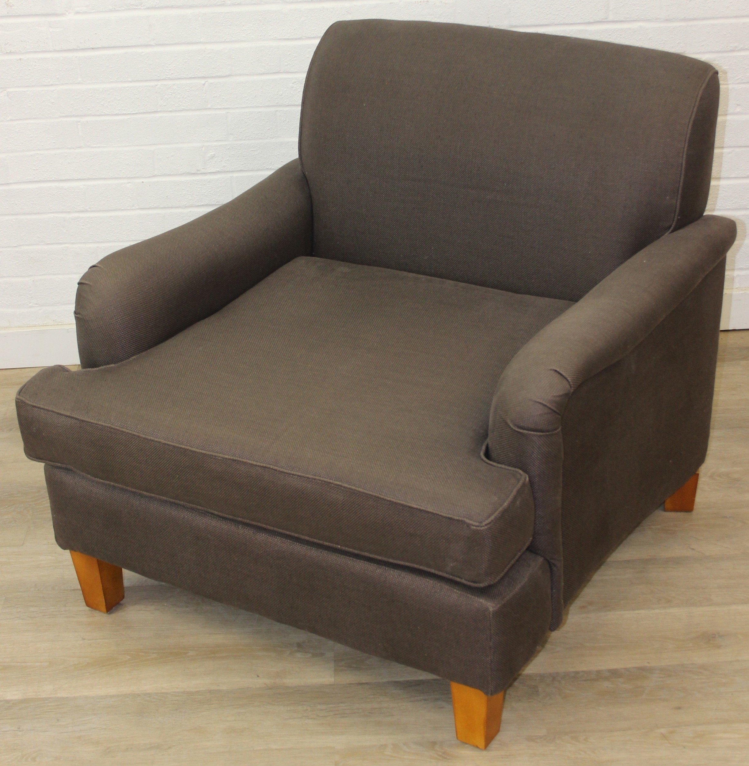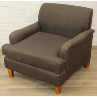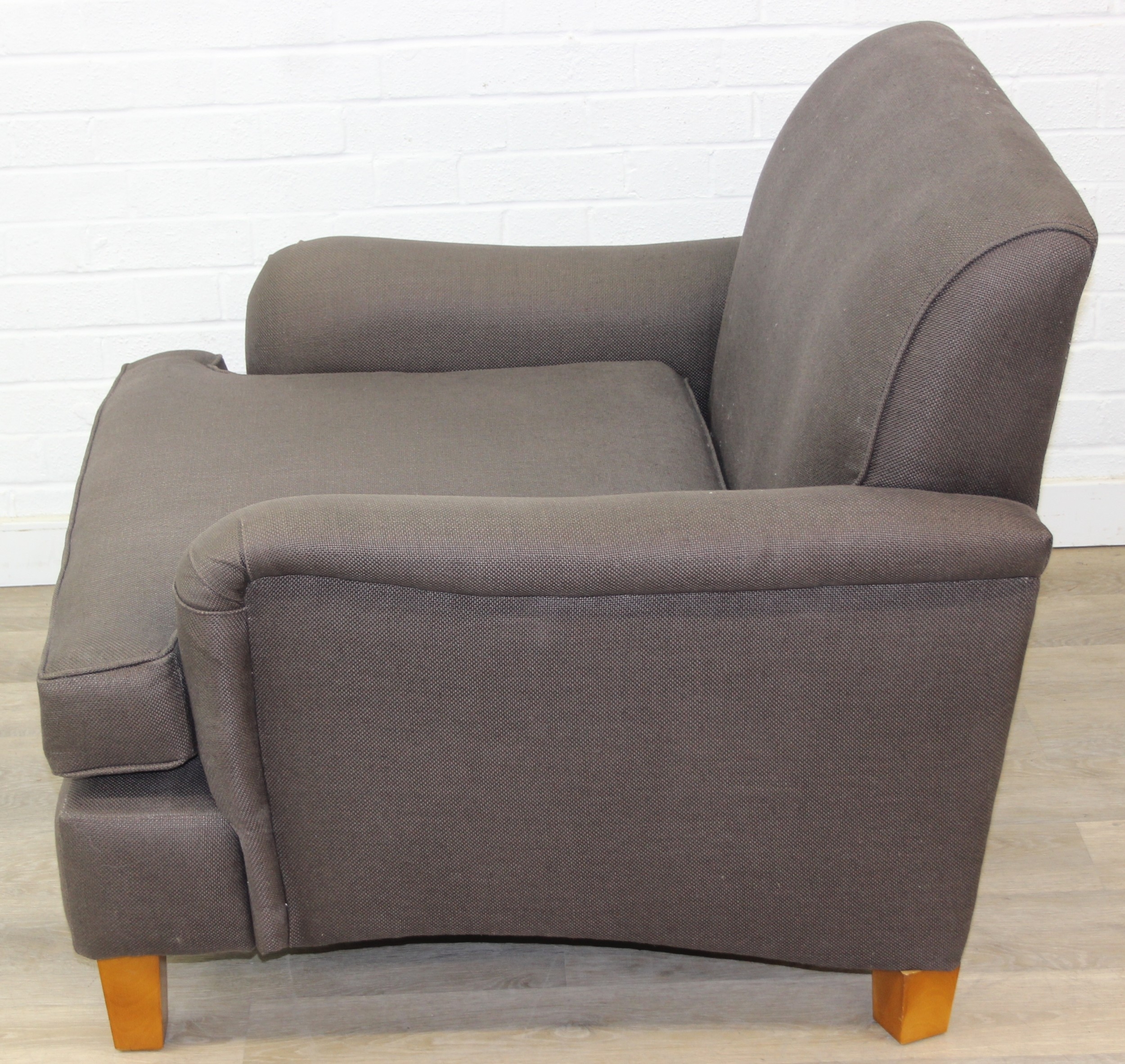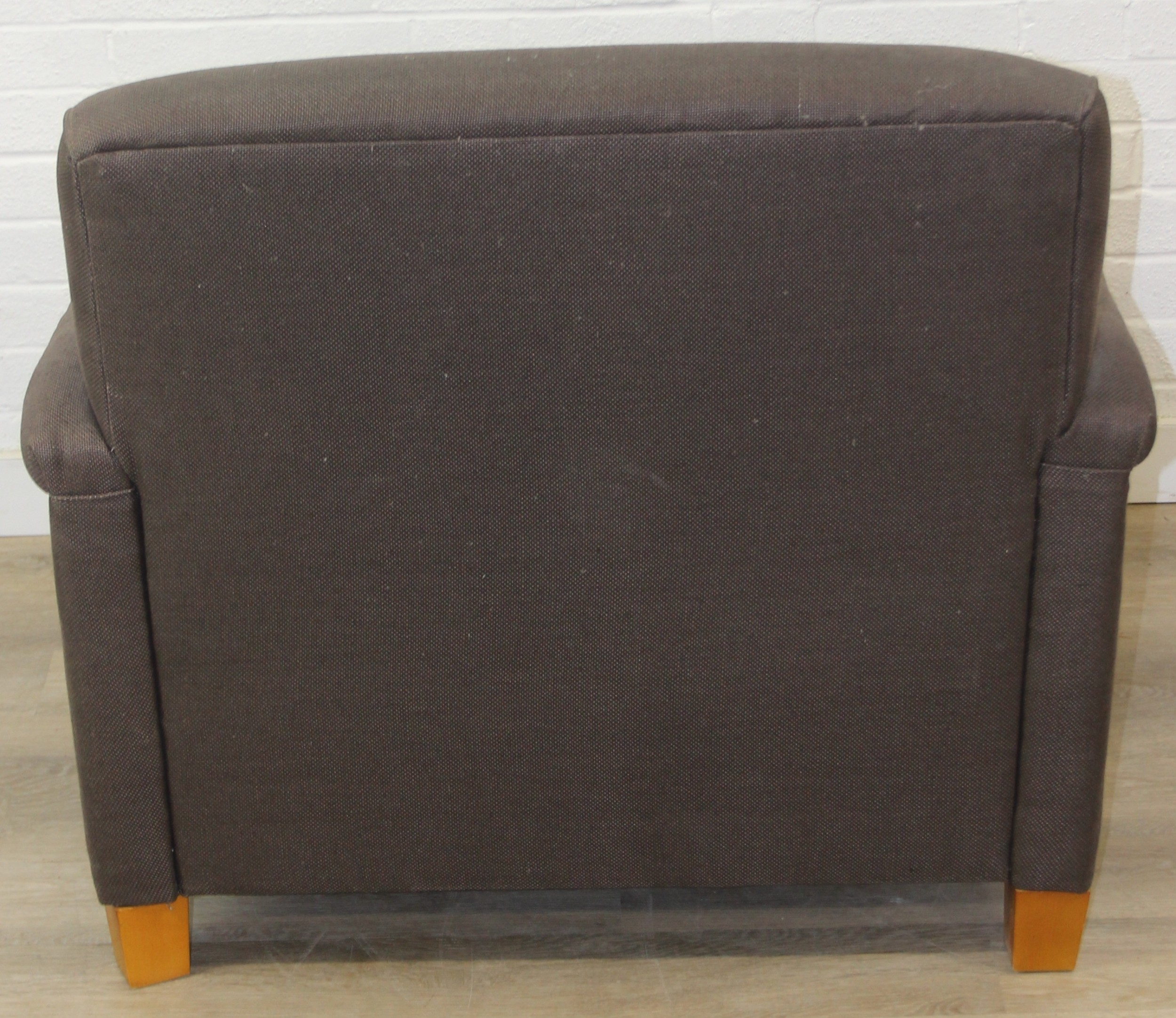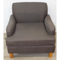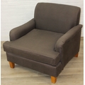 Low chocolate brown armchair in hessian type material, 90cm wide x 75cm tall, one of two in the sale