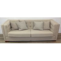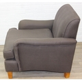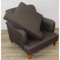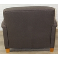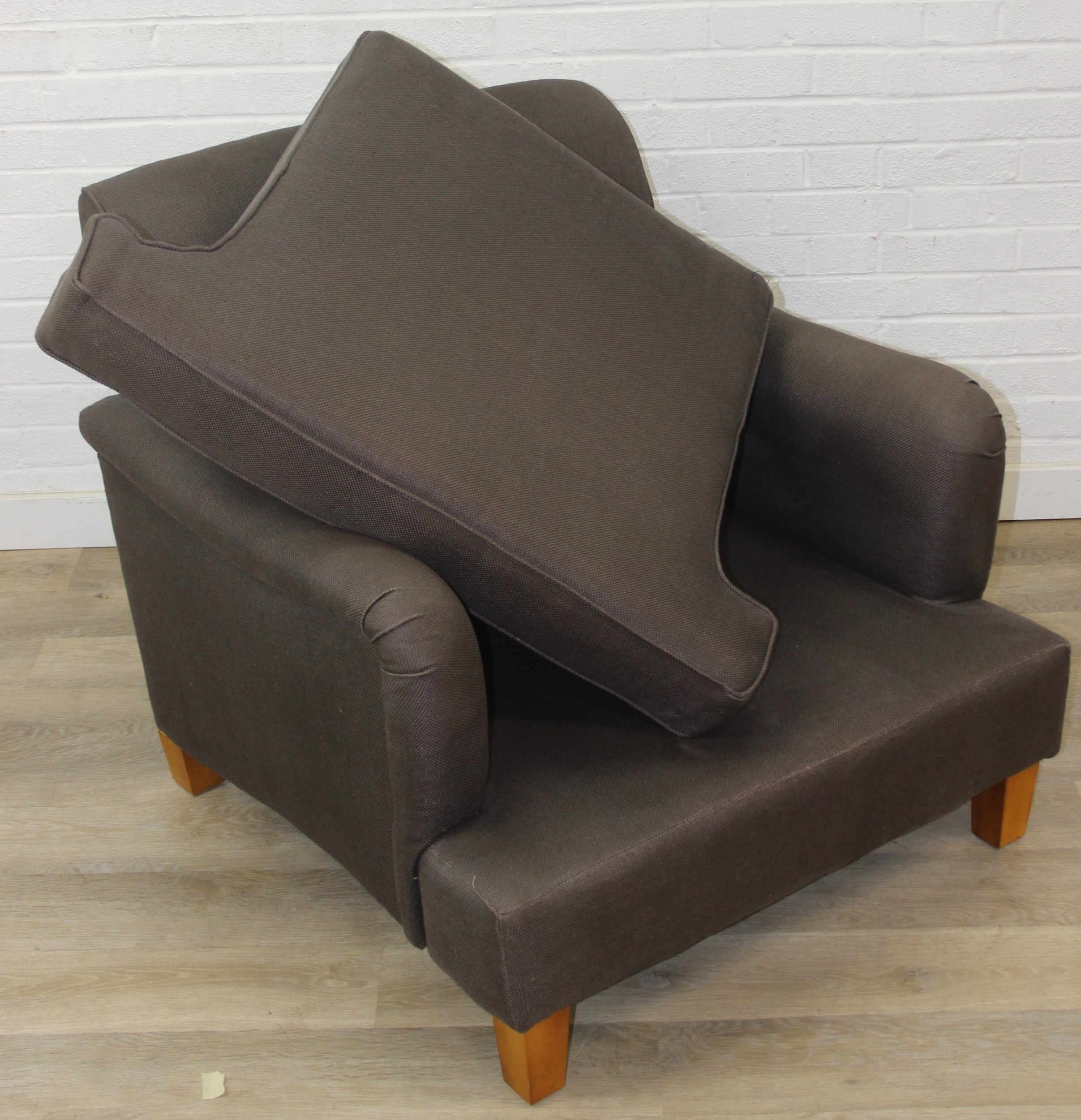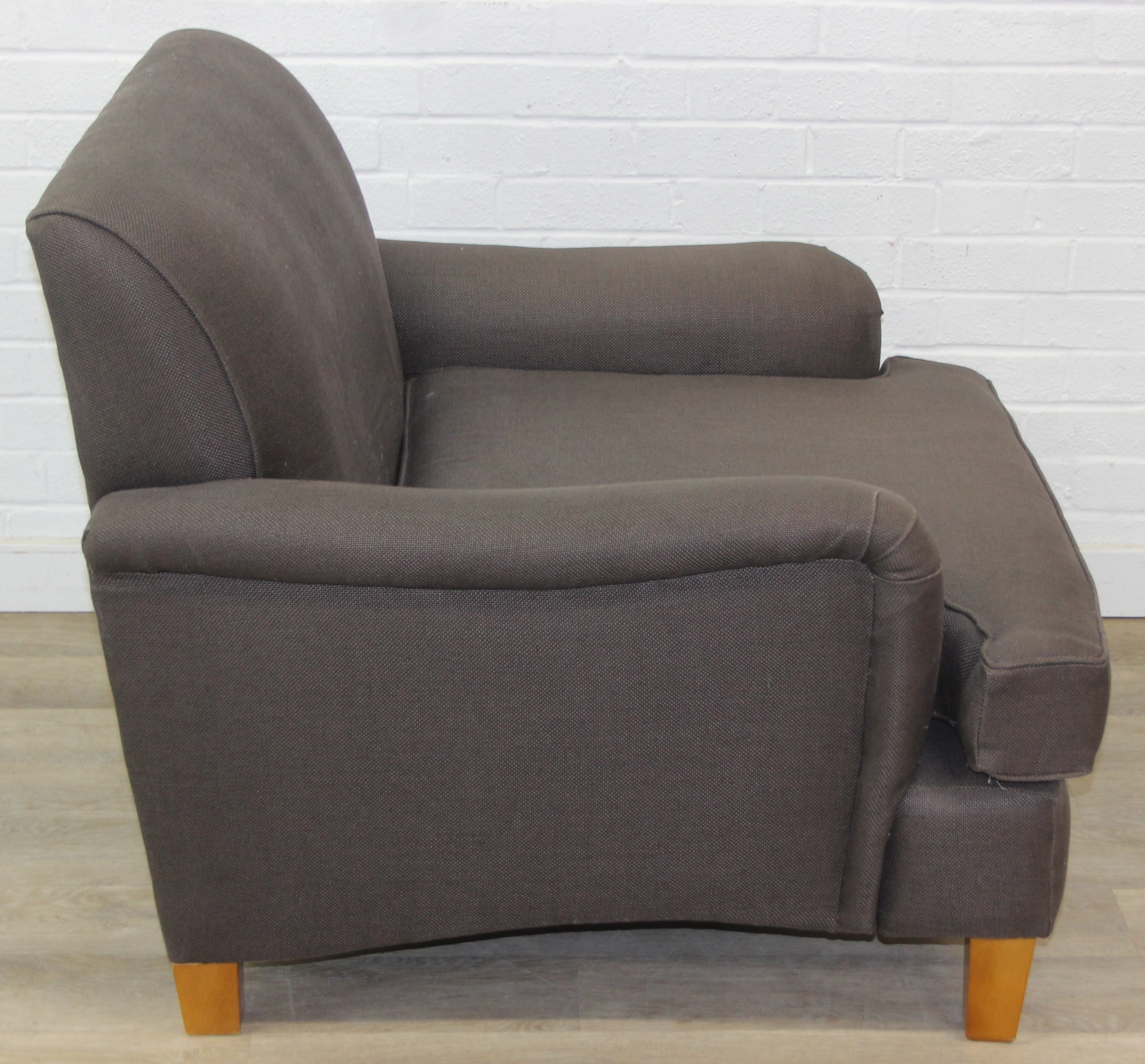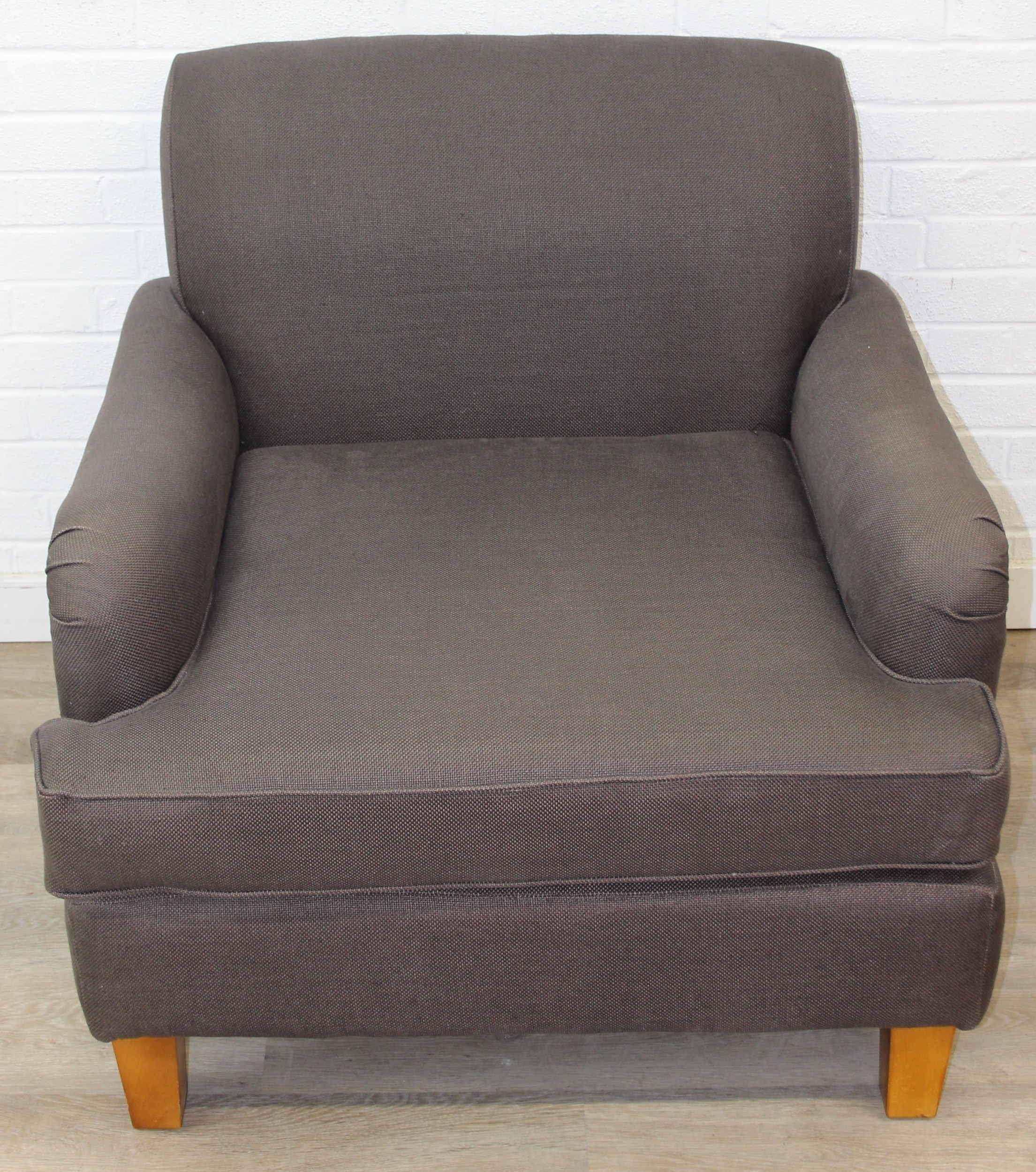 Low chocolate brown armchair in hessian type material, 90cm wide x 75cm tall, one of two in the sale