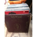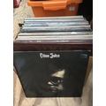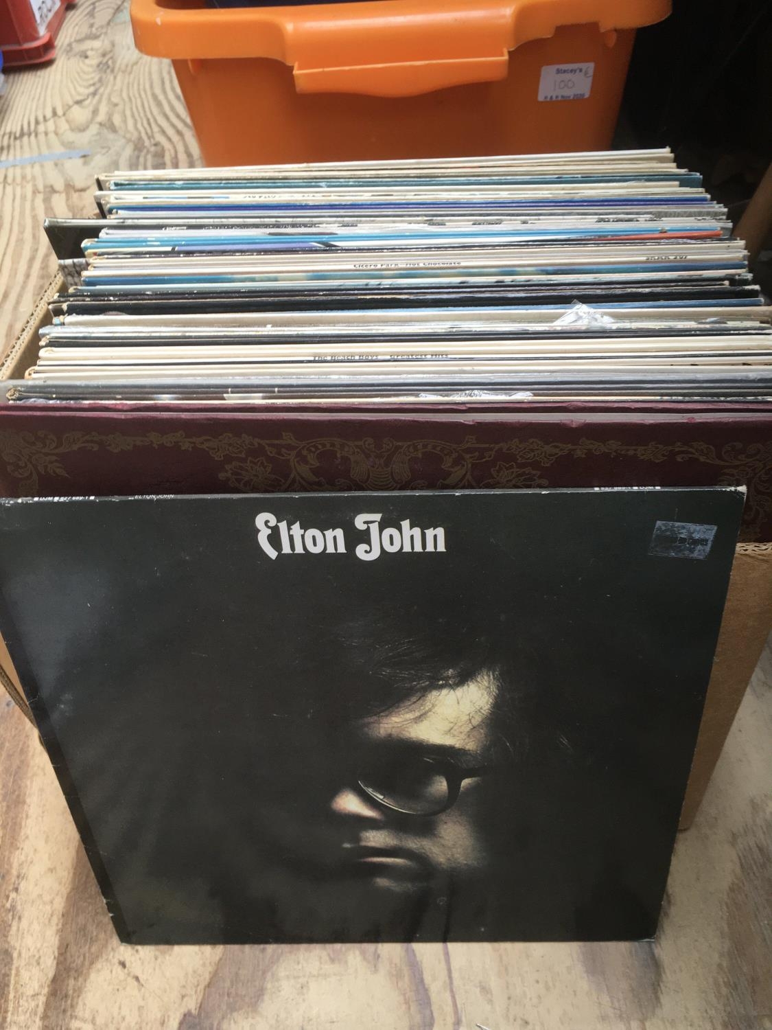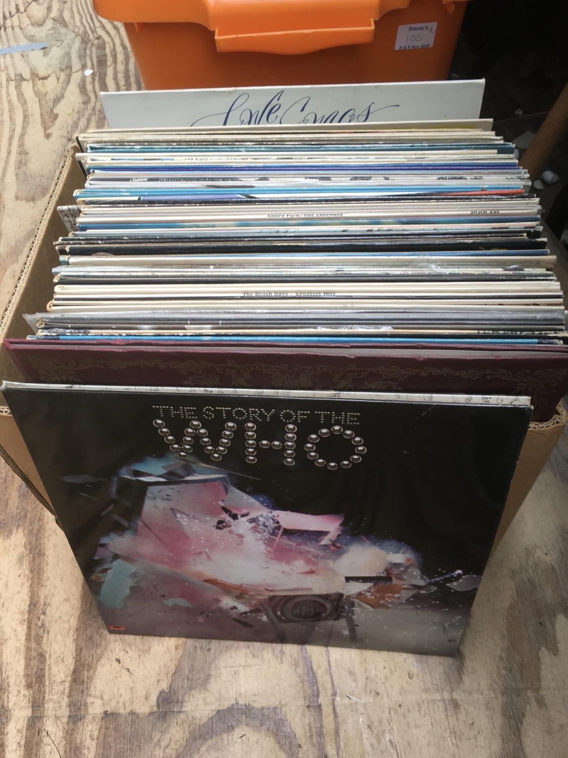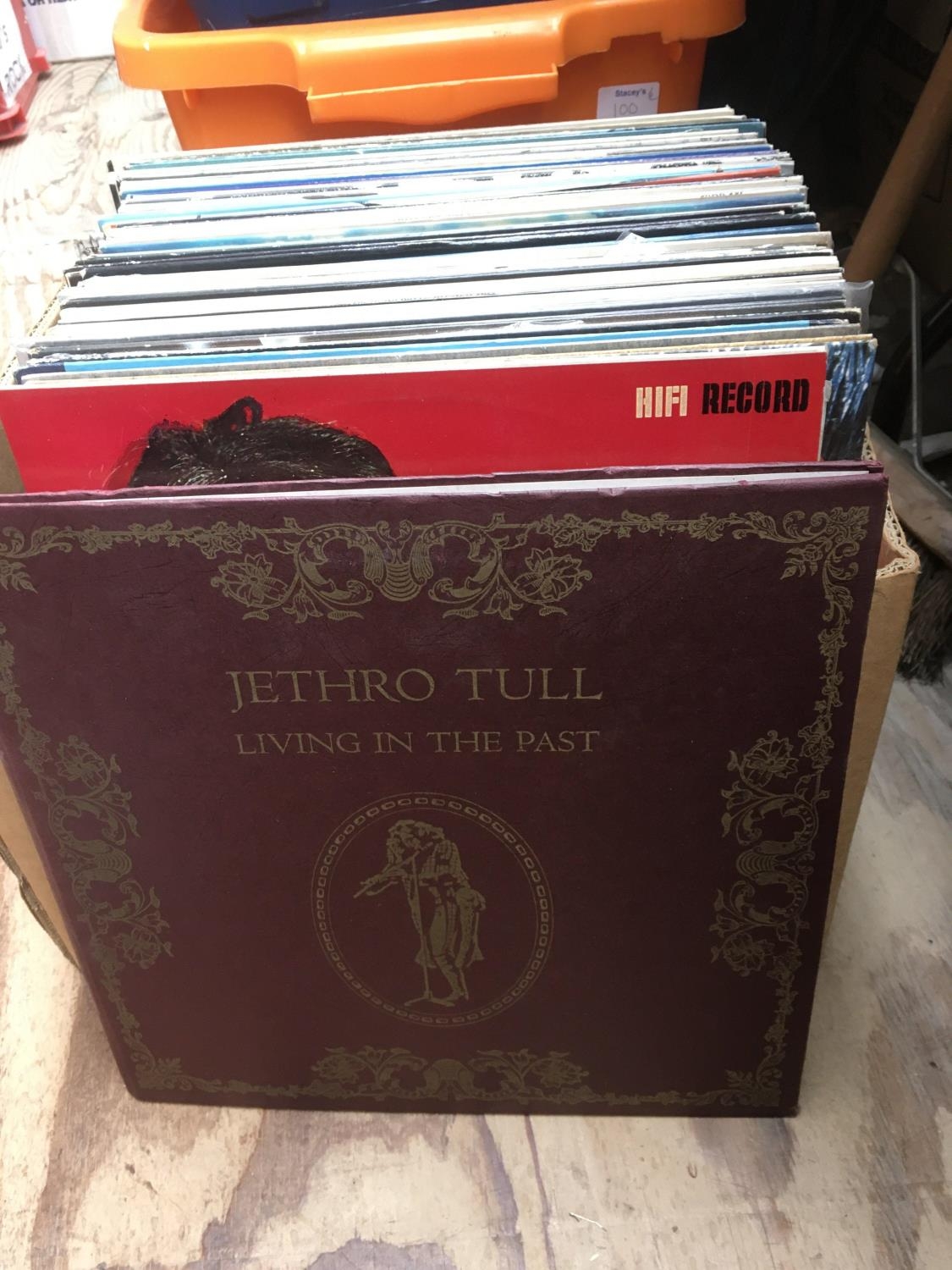 A box of LPs by various artists including Jethro Tull, David Bowie, John Lennon and others.