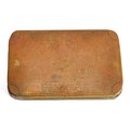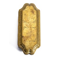 The hinged rectangular cover chased with figures at a table and inscribed in Dutch, distress