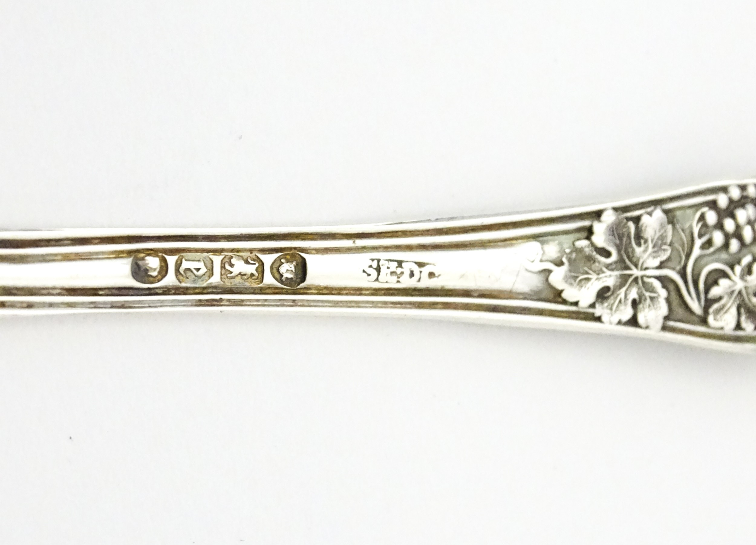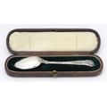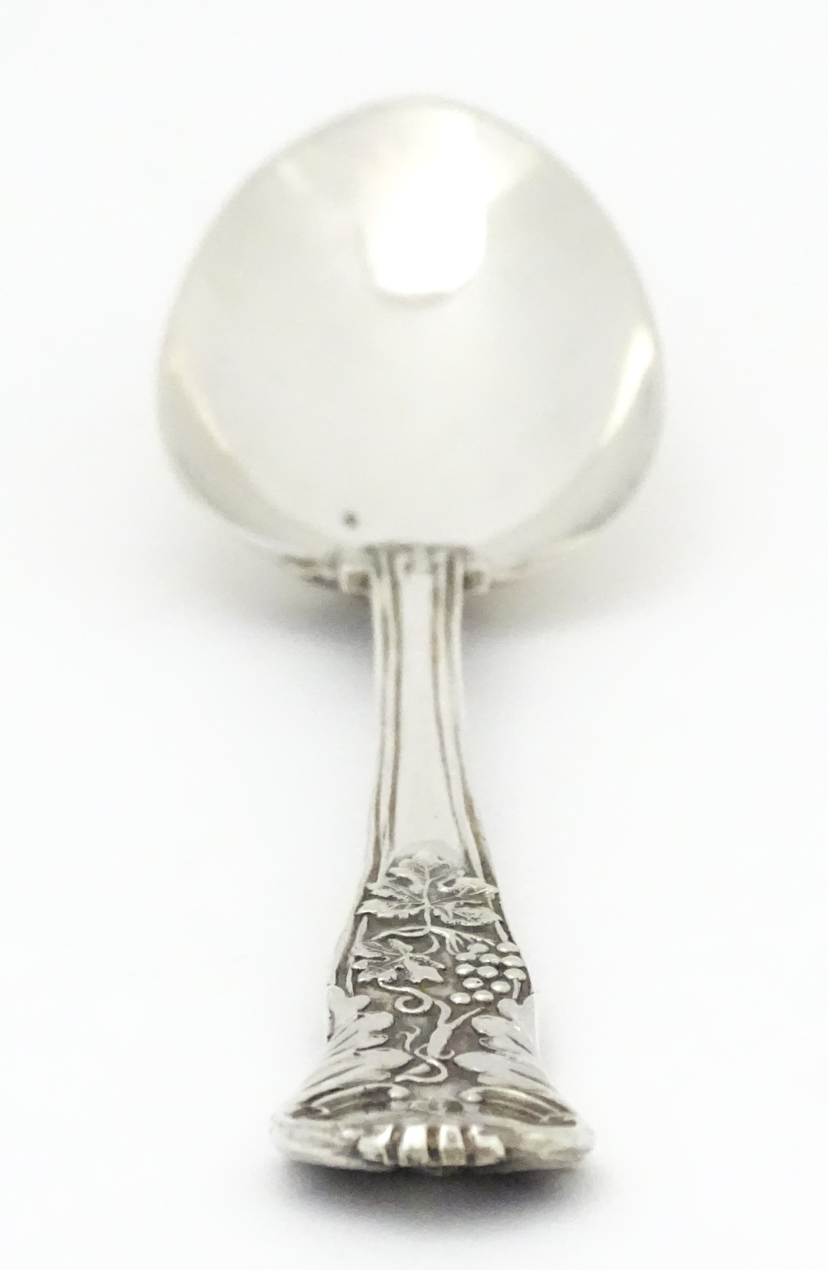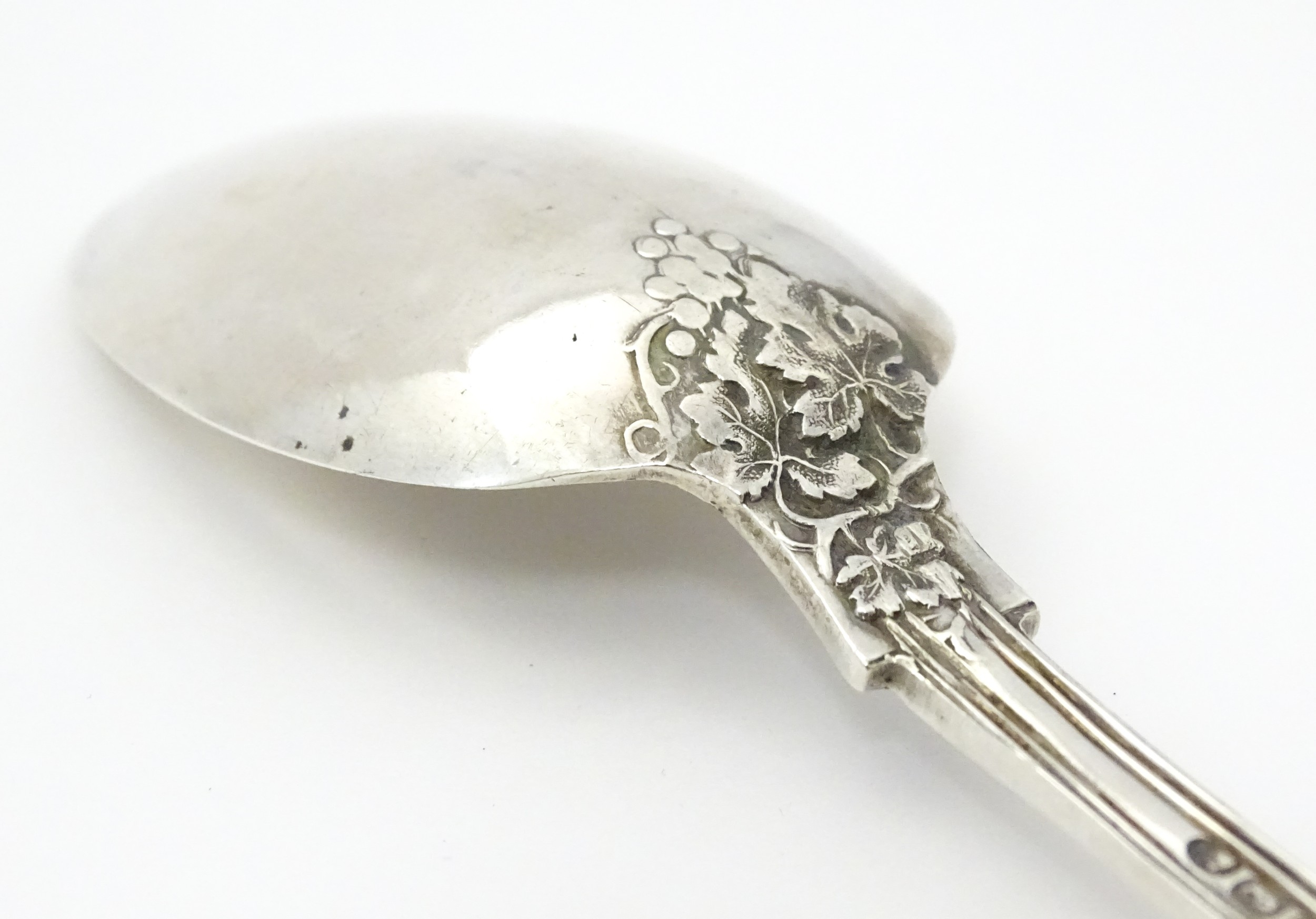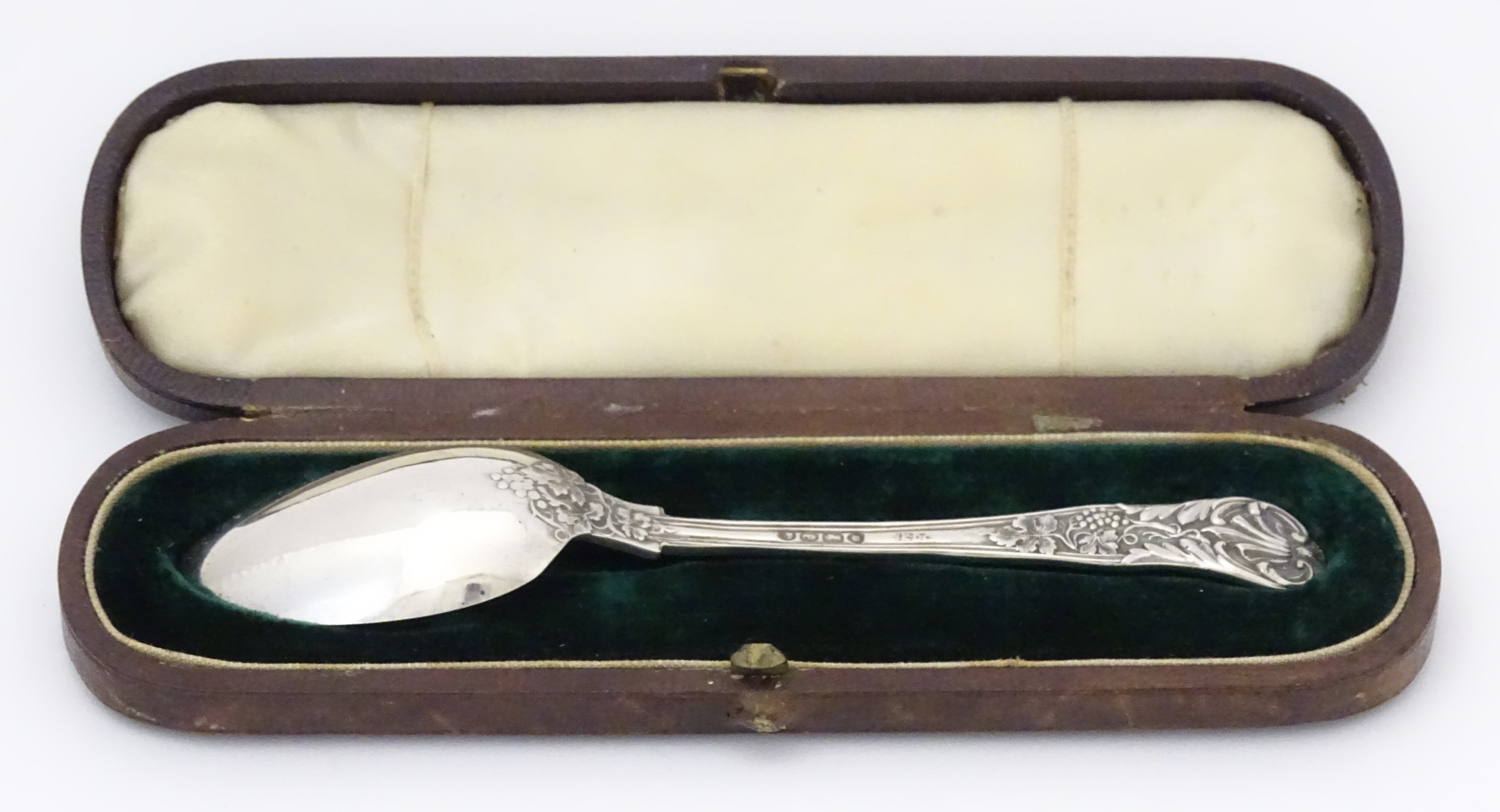 A cased Victorian silver Christening spoon with fruiting vine decoration, hallmarked London 1879, maker Samuel Hayne & Dudley Cater. Approx. 6 1/4" long