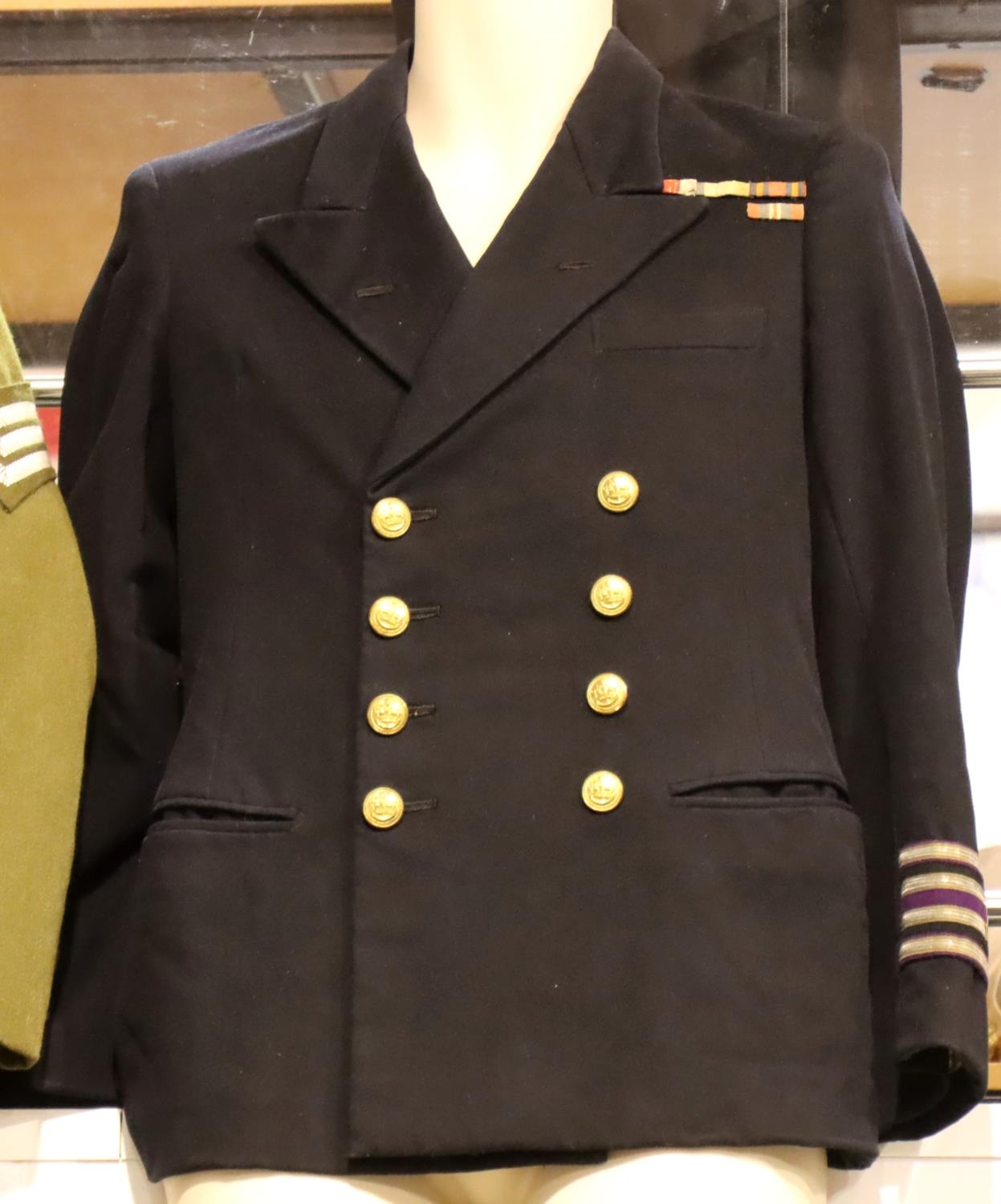 Merchant Navy Masters tunic with embroidered cuff ranks, WWII ribbons and trousers. P&P Group 3 (£25+VAT for the first lot and £5+VAT for subsequent lots)
