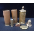 A TRENCH ART SHELL-CASE MONEY BOX with brass finial 23cm high, three other shell cases, a small model cannon, bell and snuff box (7)