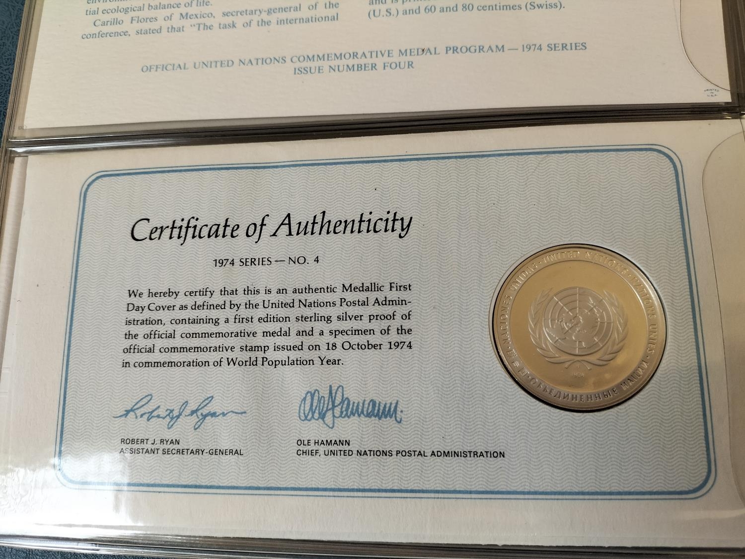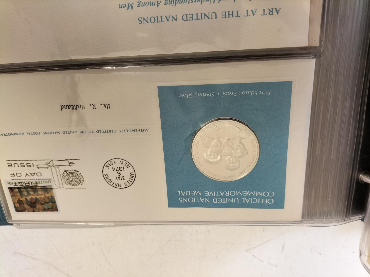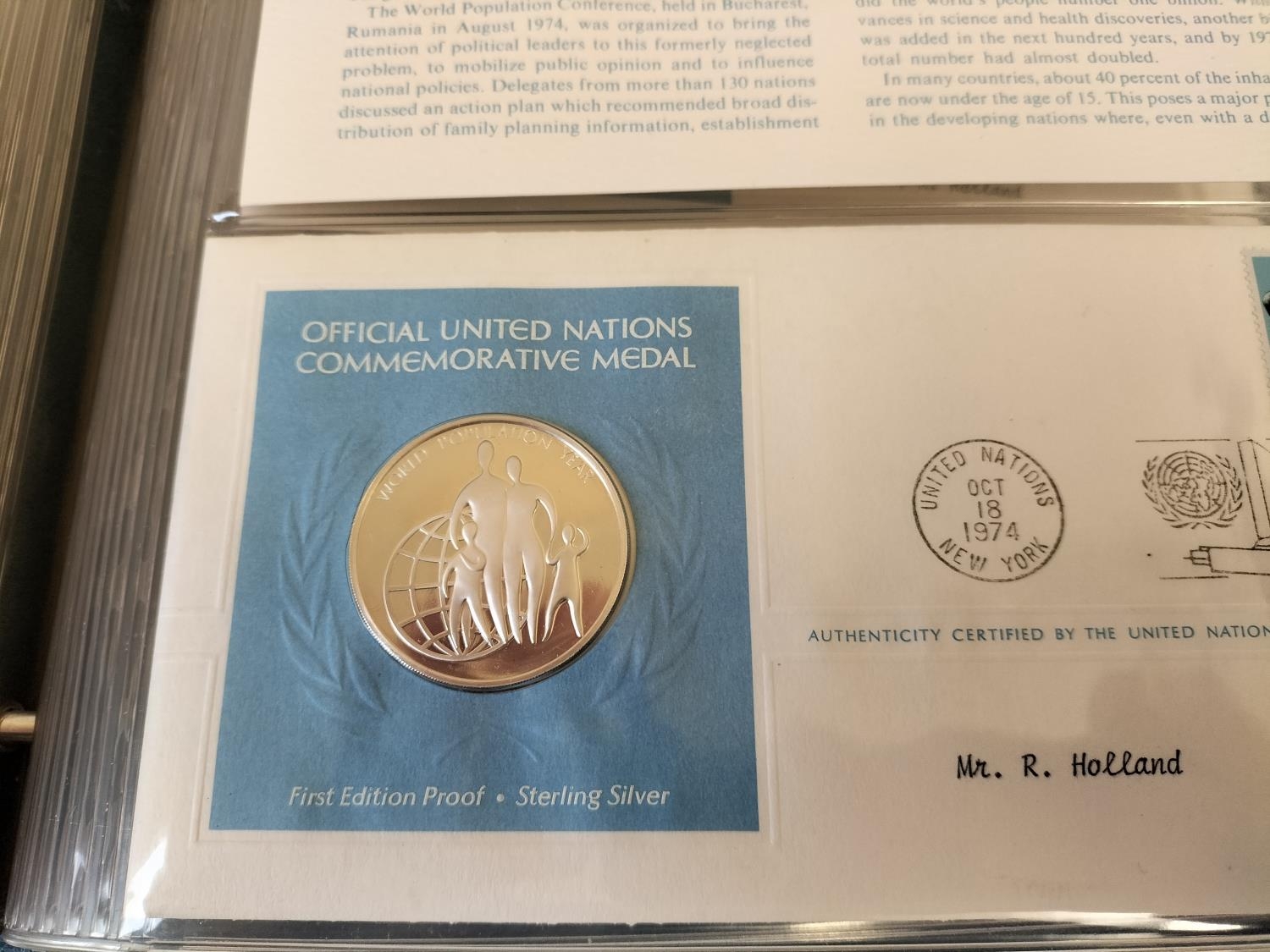 1974 Official United Nations Medallic First Day Covers containing 5 x First Edition Sterling Silver Proof Crown Size Medals.