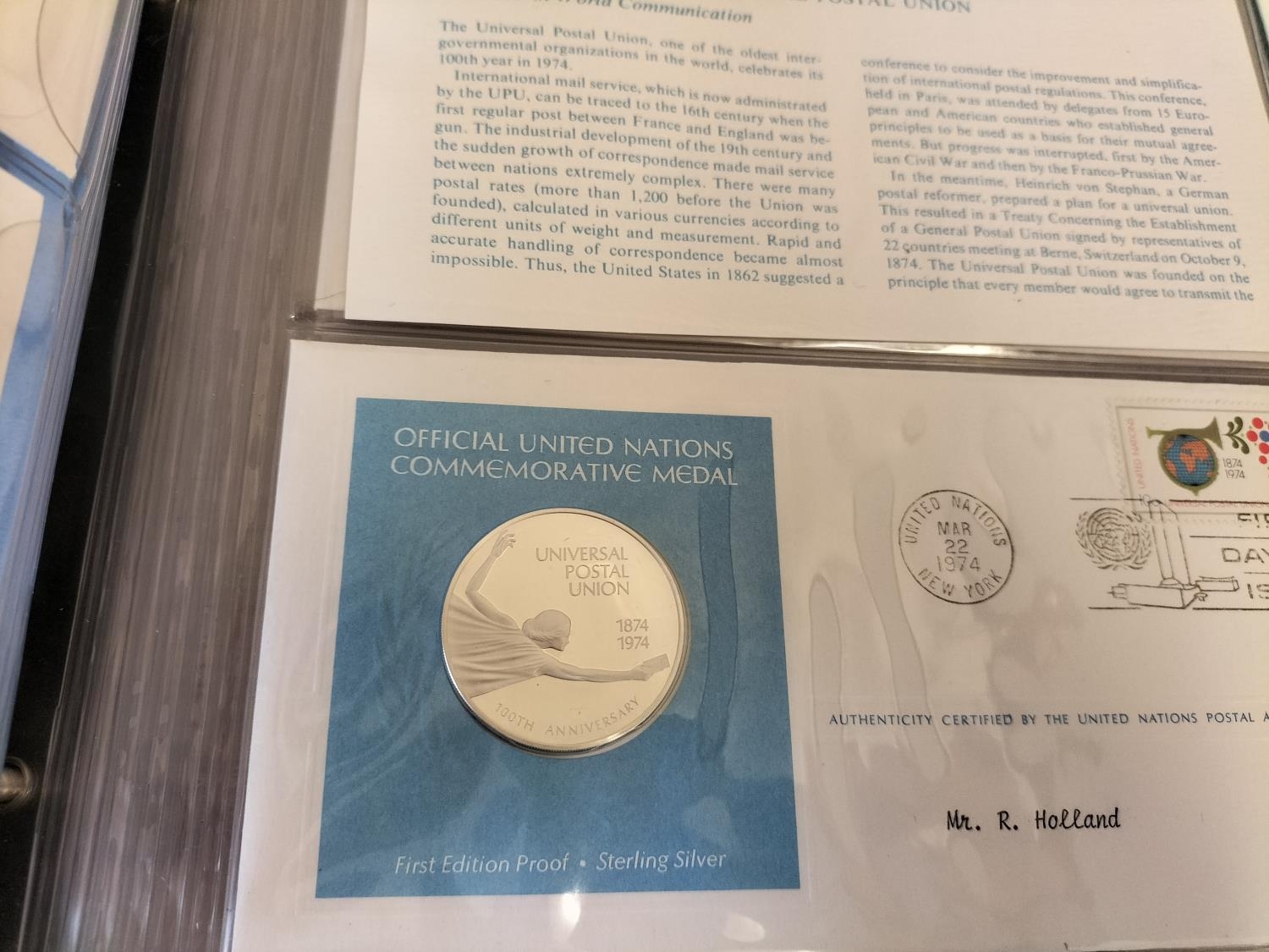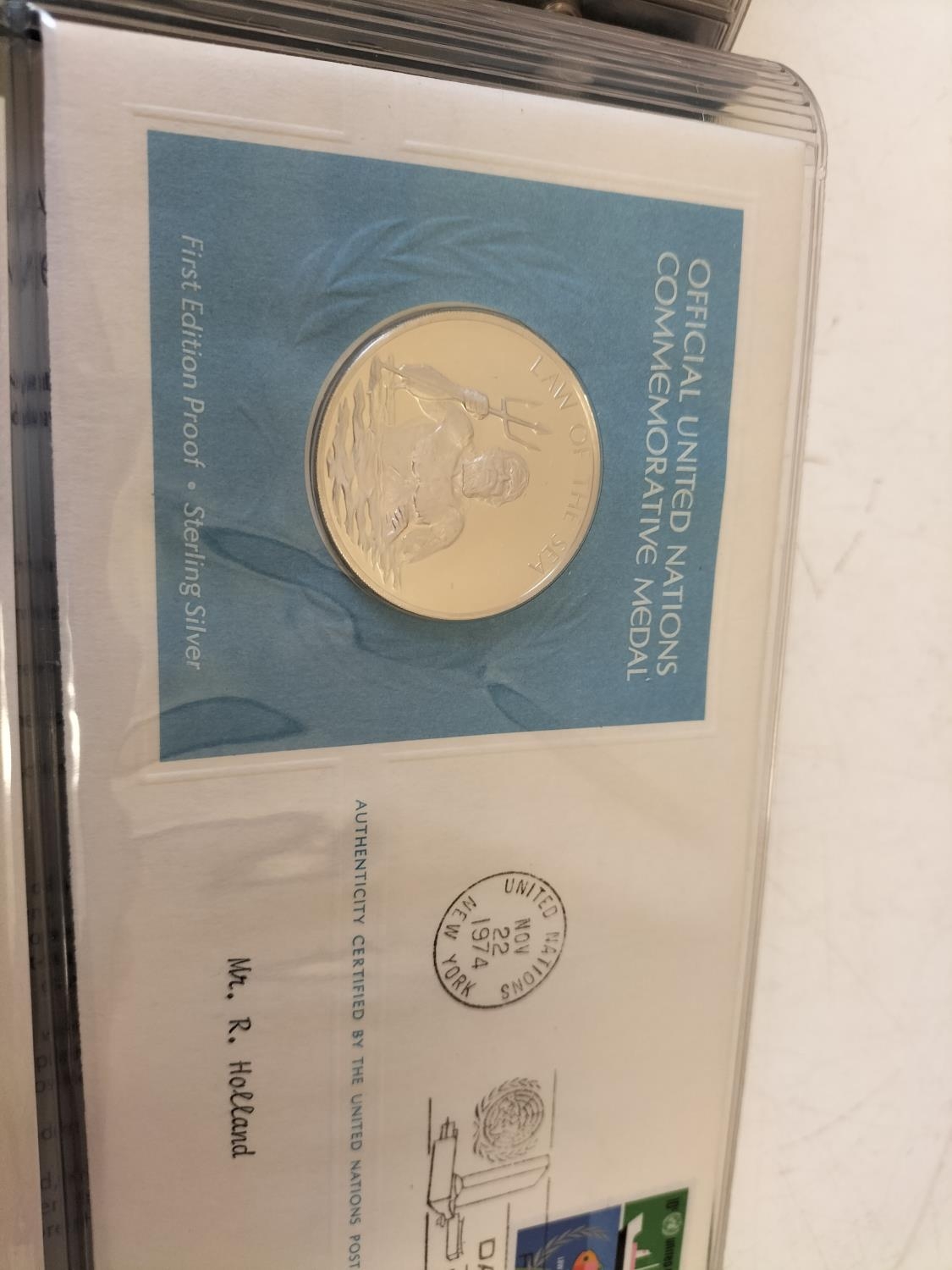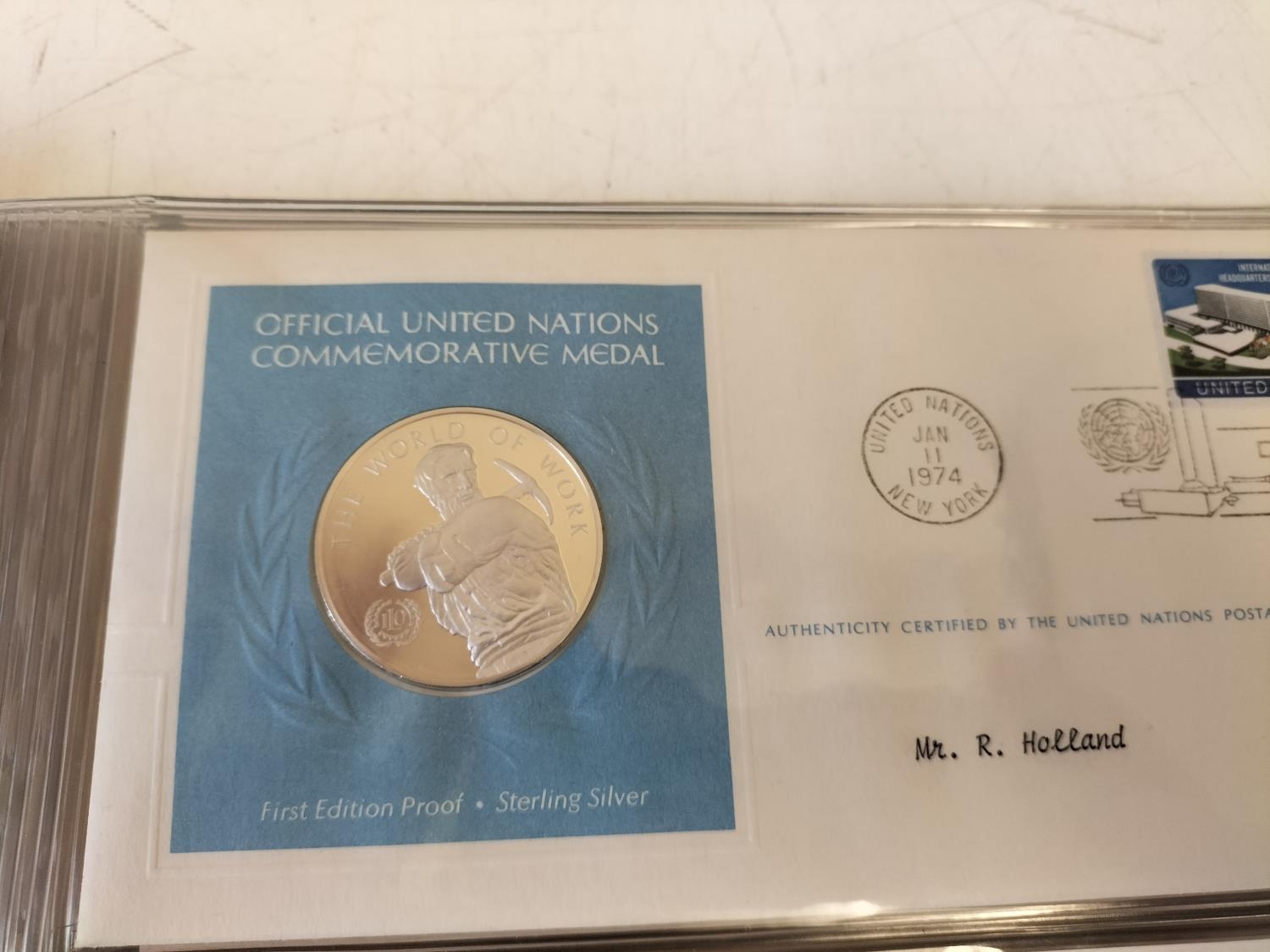 1974 Official United Nations Medallic First Day Covers containing 5 x First Edition Sterling Silver Proof Crown Size Medals.