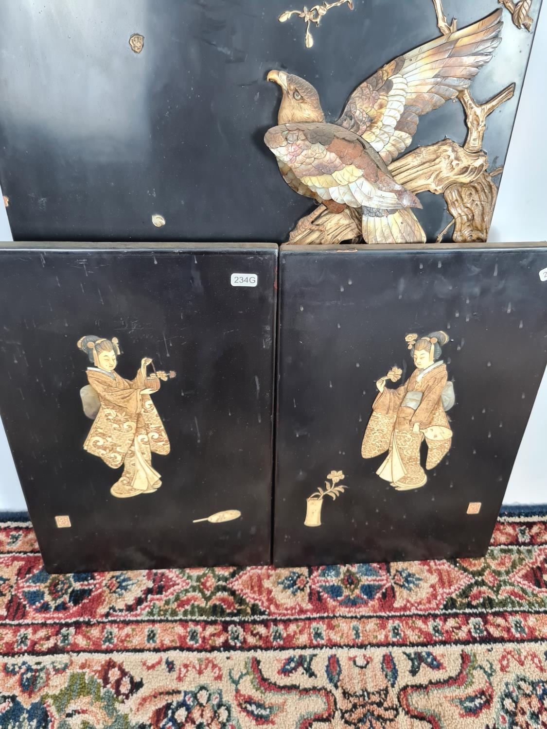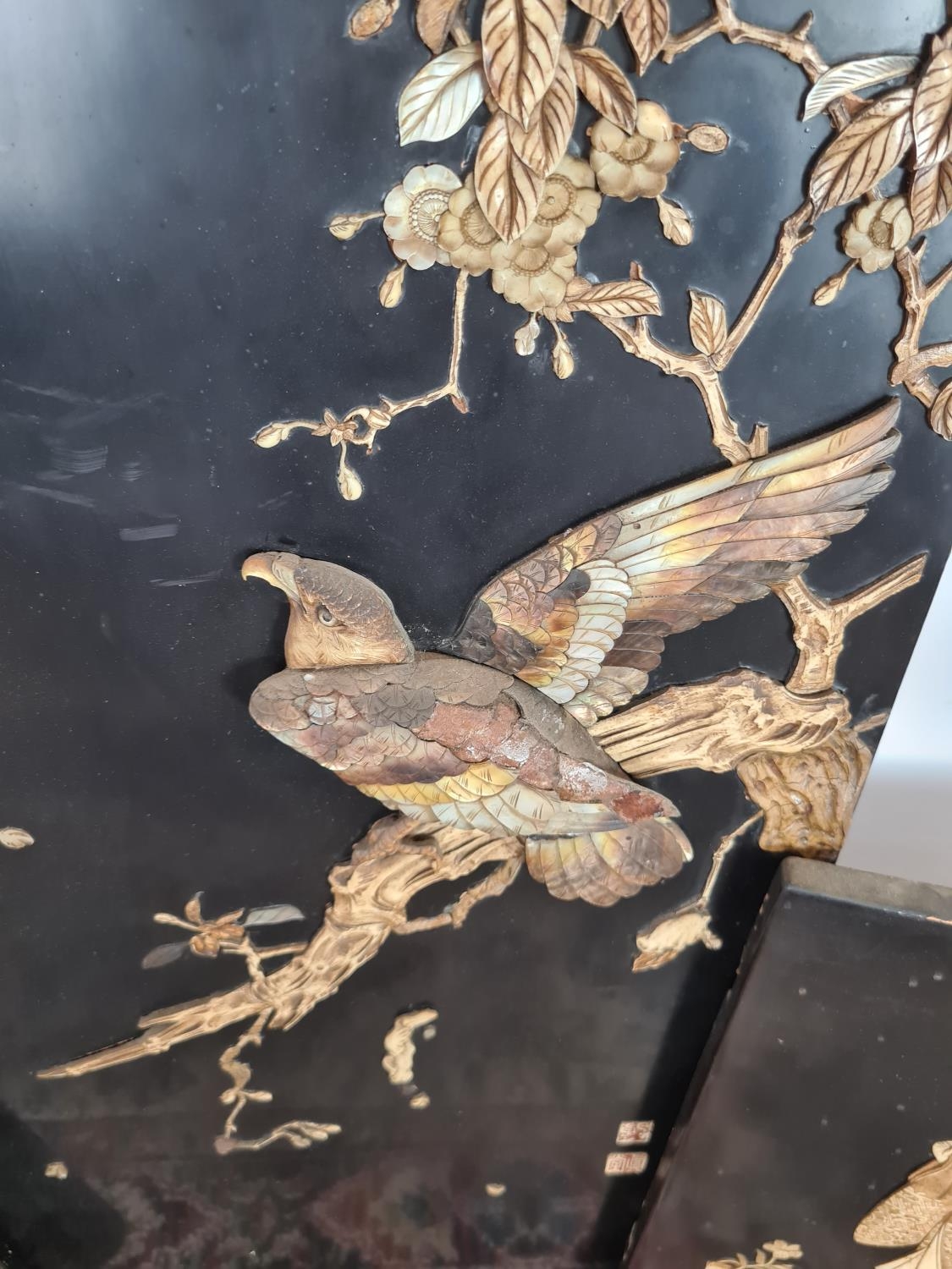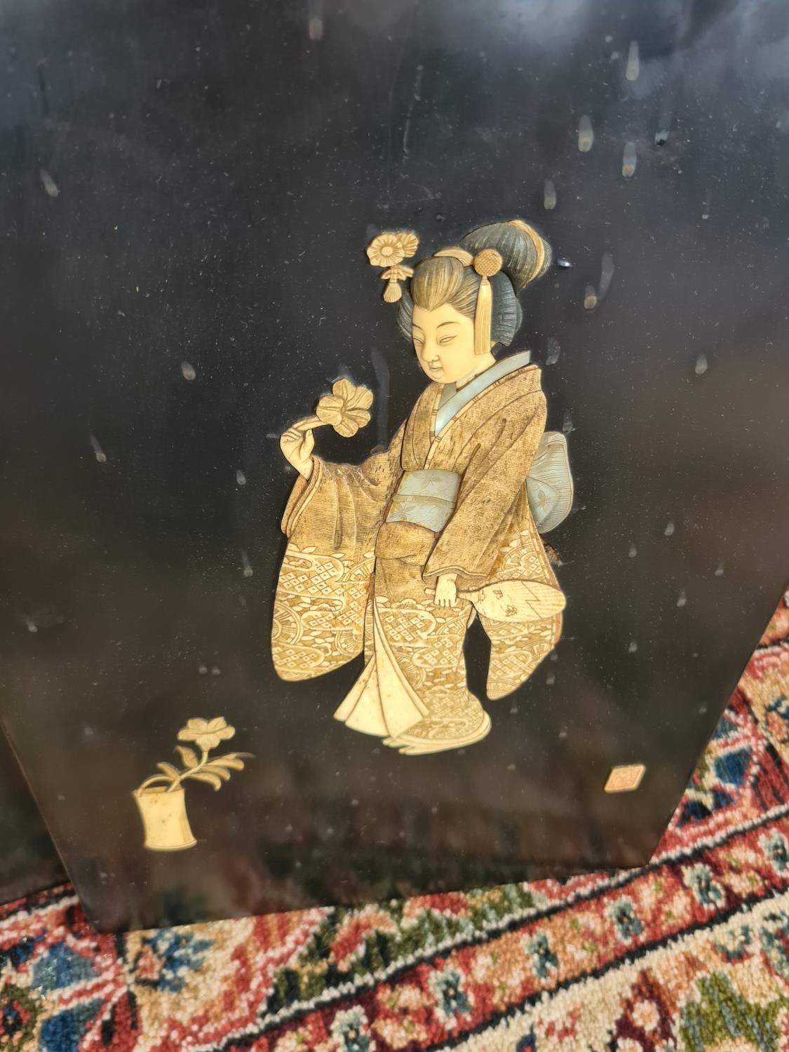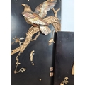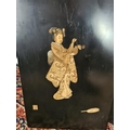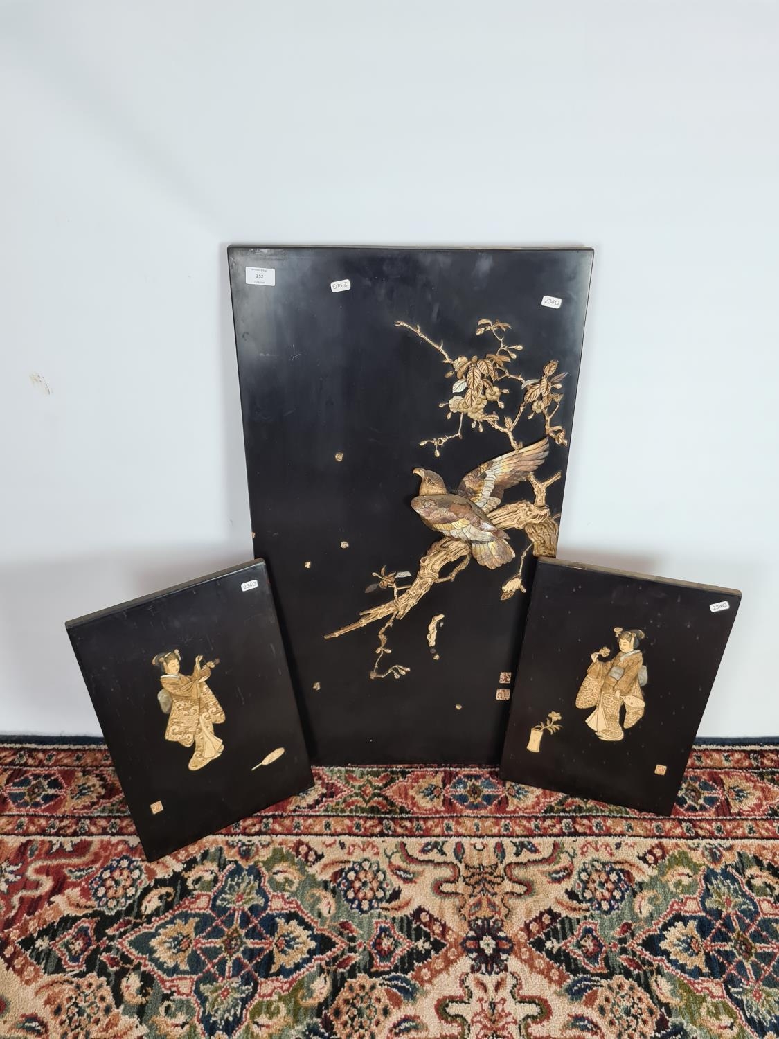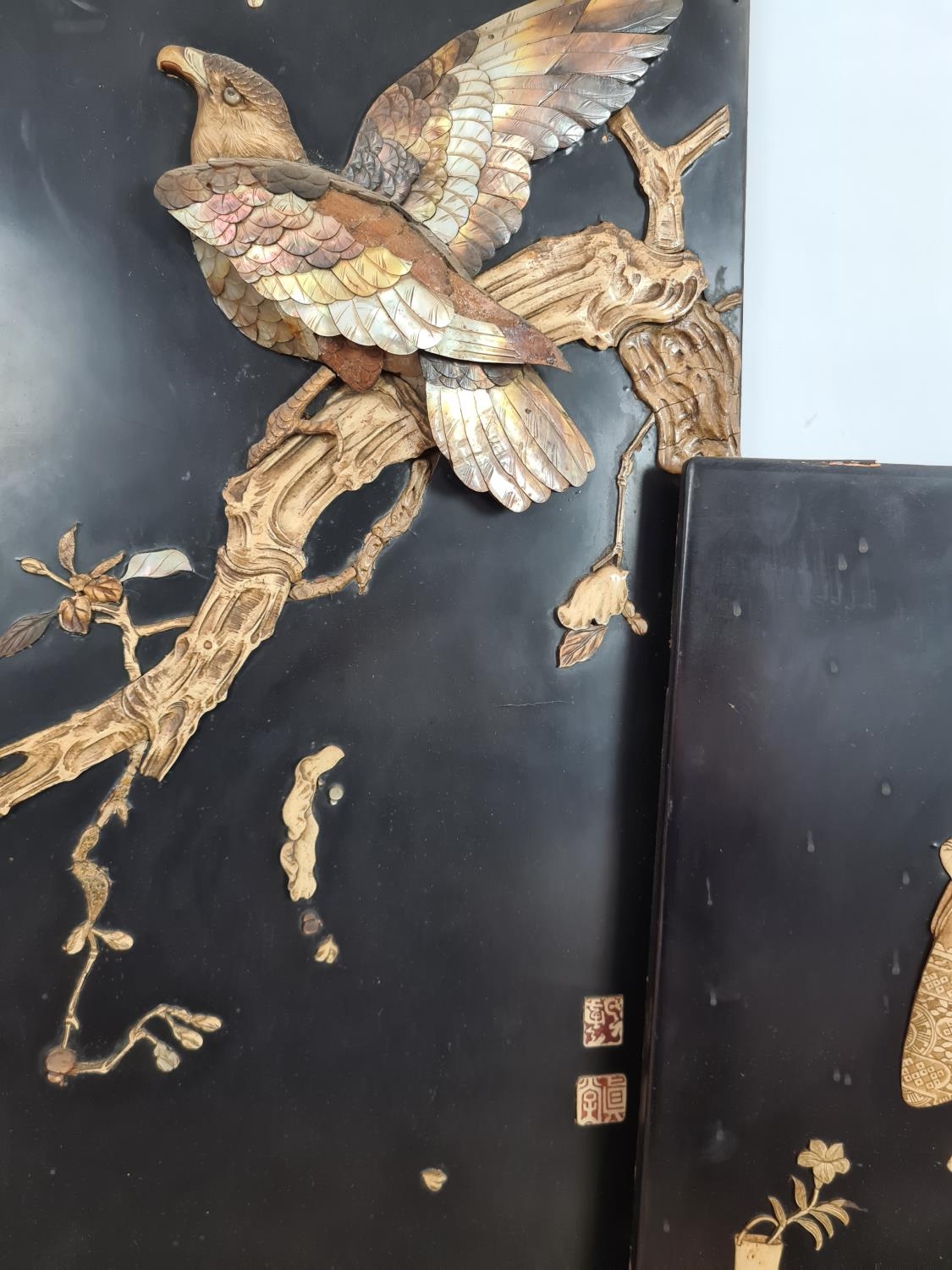 Three 19th century Japan lacquered panels with mother of pearl and ivory artwork depicting birds and geisha girls - two monogrammed bottom right and one lower left