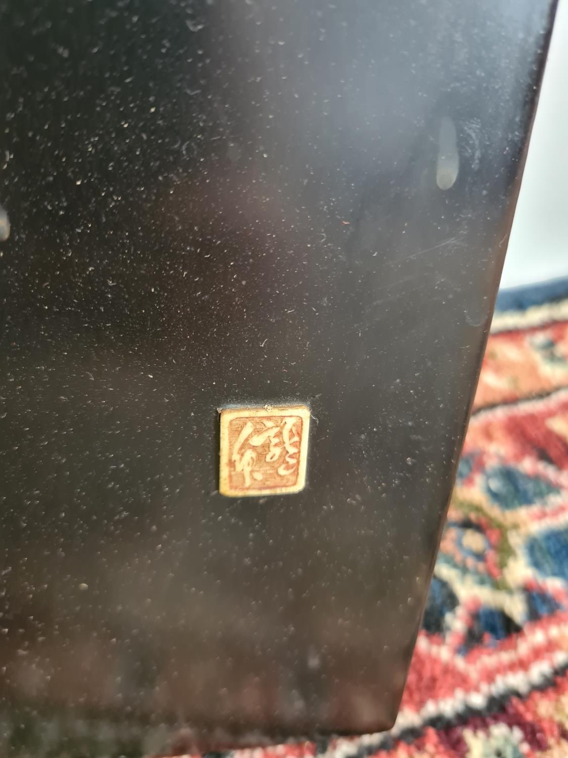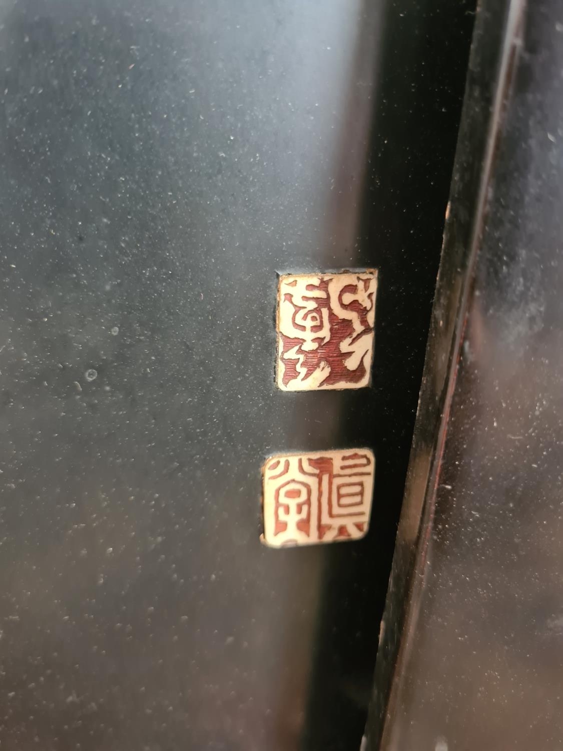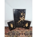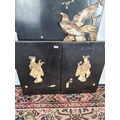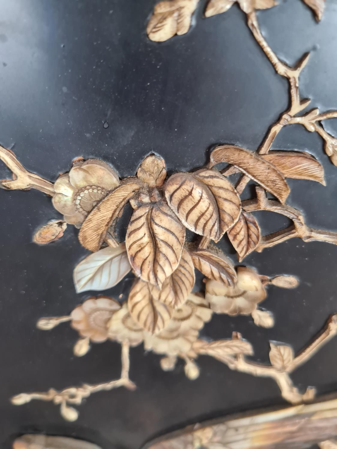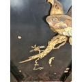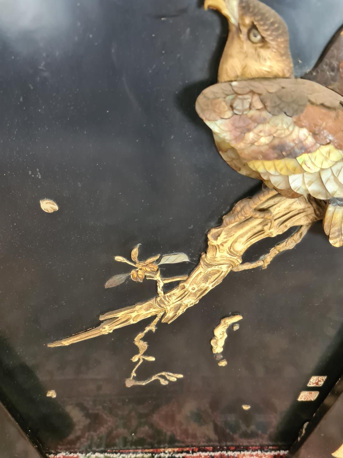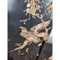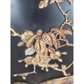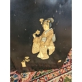 Three 19th century Japan lacquered panels with mother of pearl and ivory artwork depicting birds and geisha girls - two monogrammed bottom right and one lower left