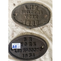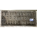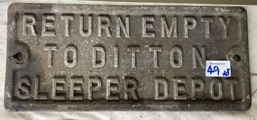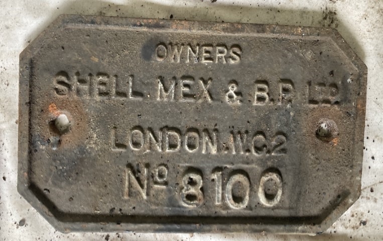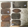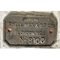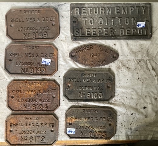 A collection of cast iron railway wagon owner's plates. Right Shell Merx & BP Ltd two numbered 8149, others numbered 6124, 8179, 8100 & 8075. Together with an owners' MOT (Ministry of Transport) plate dated 1947 and an aluminium plate stating 'Return Empty to Ditton sleeper Depot'. Sizes from 22cm x 10cm to 36cm x 16cm