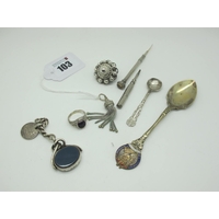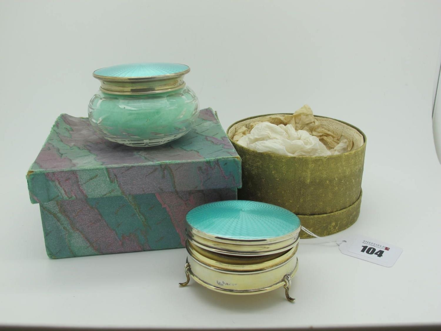 A Hallmarked Silver and Turquoise Enamel Lidded Trinket Box, Alexander Clark, Birmingham 1930, of circular form, with hinged lid (cream plush and gilt lined), on three pad feet, 7.5cm diameter; Together with Matching Glass Powder Bowl, Alexander Clark, Birmingham 1929. (2)
