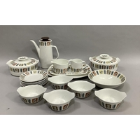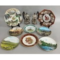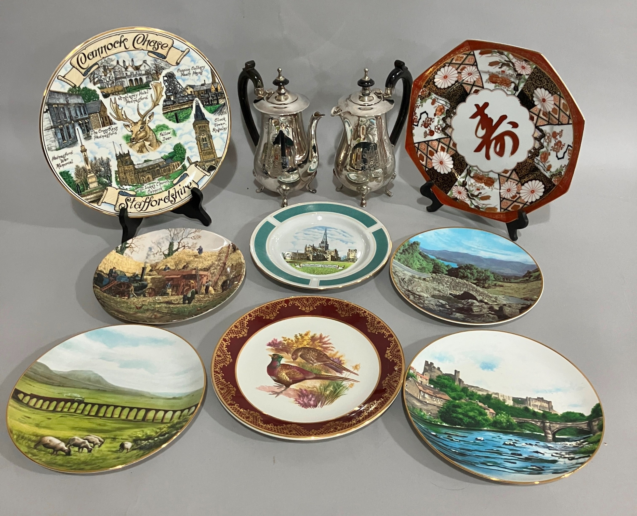 A quantity of decorative wall plates together with a silver plated coffee pot and hot milk jug with ebonised handles on paw feet