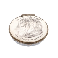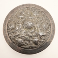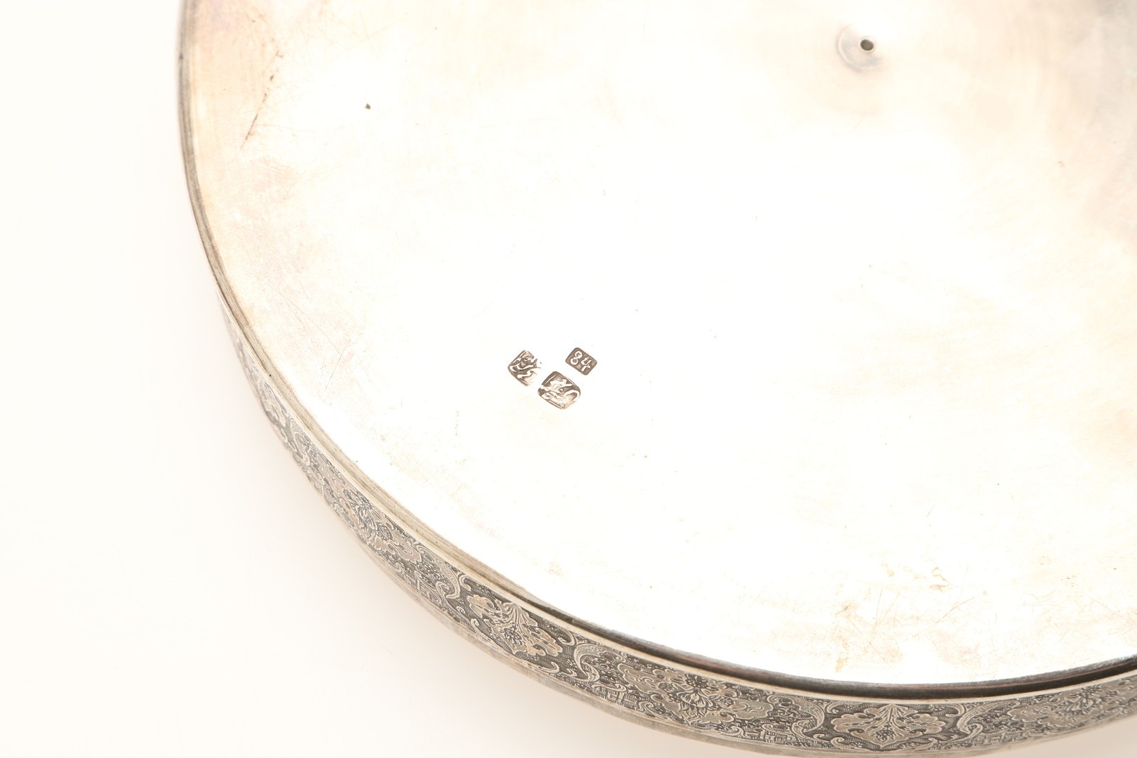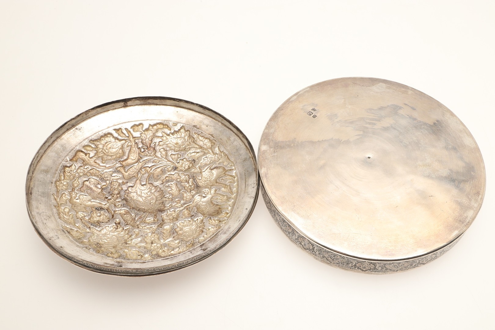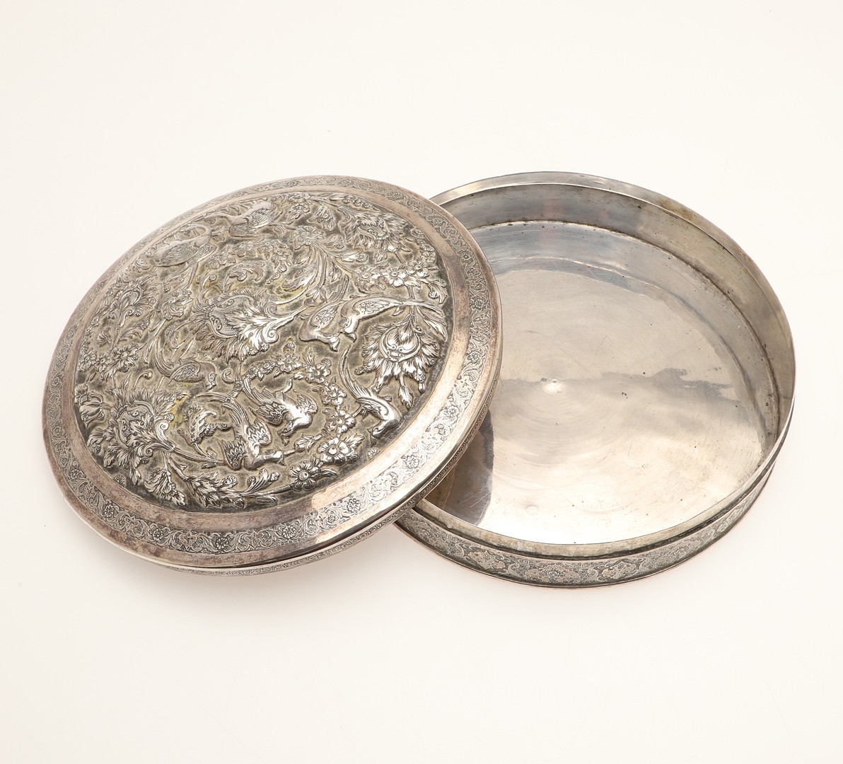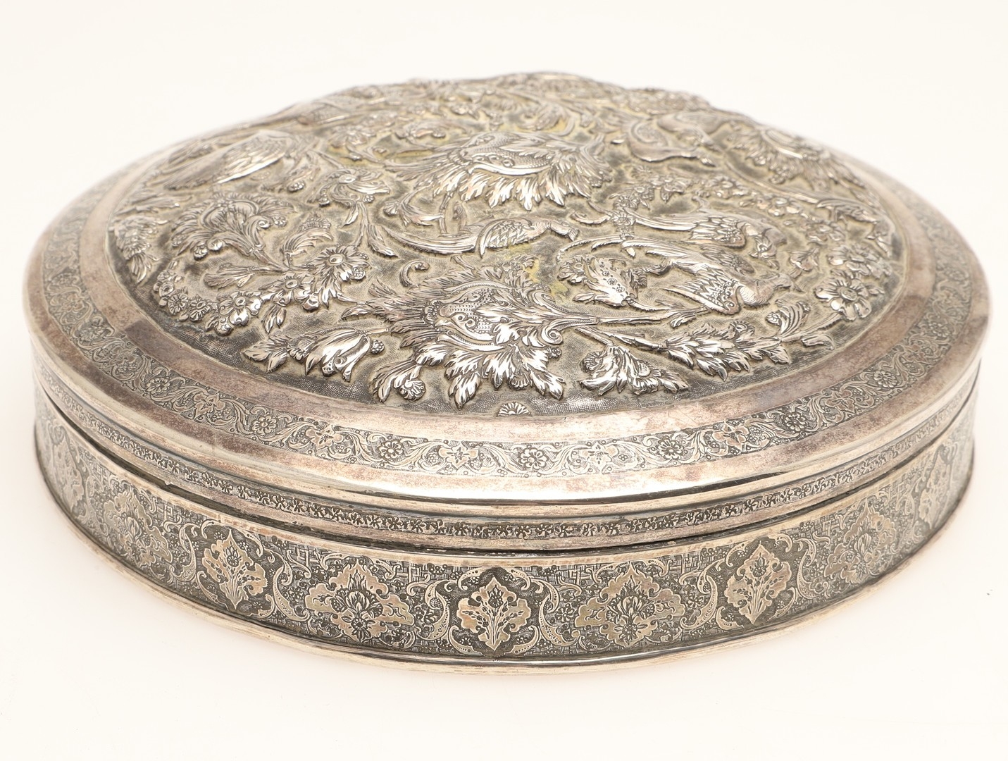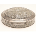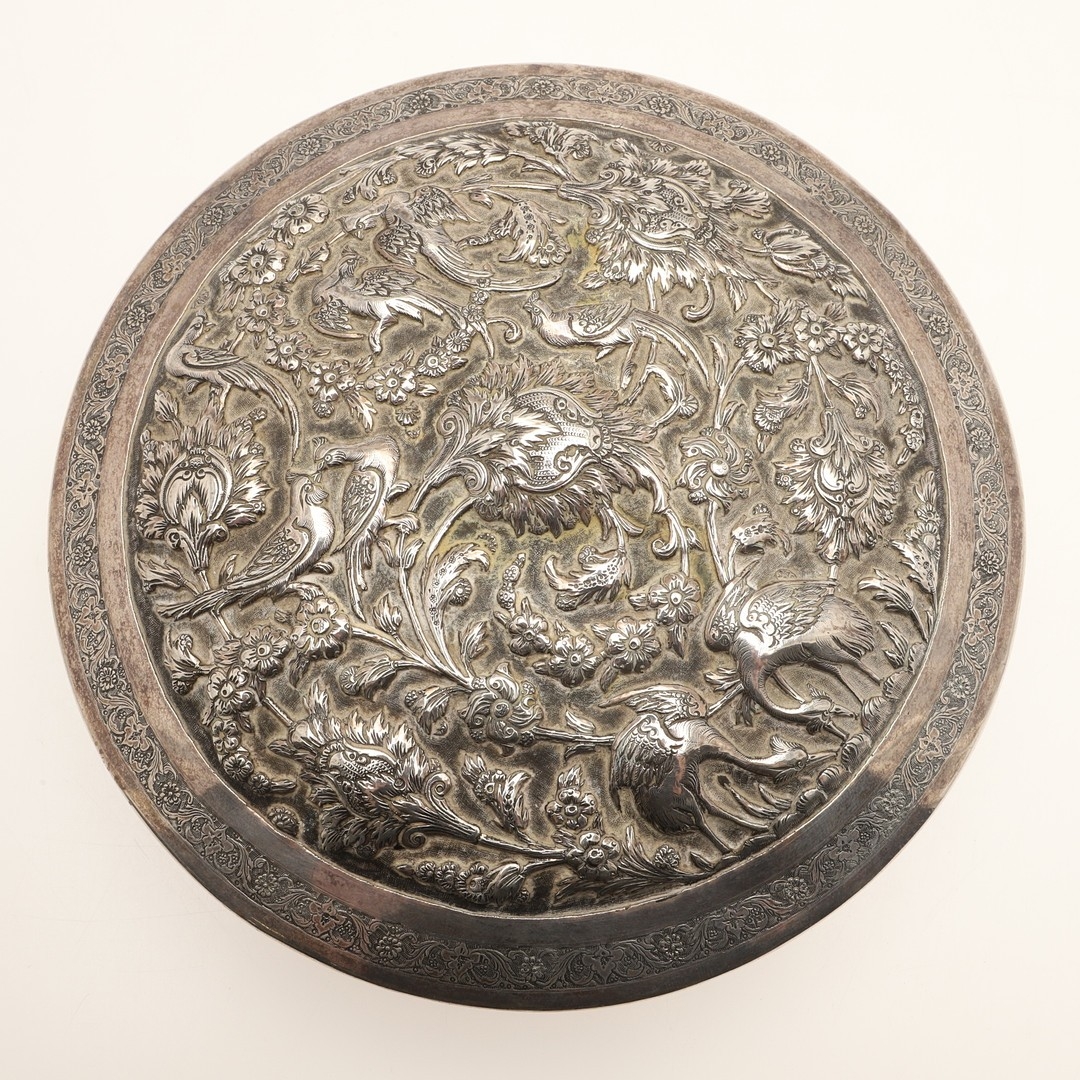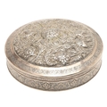A PERSIAN 875 SILVER BOX. Circular shape, the lid repoussé decorated cranes amongst trailing flowers, Arabic touch marks & 84 Zolotniki (875) to base.