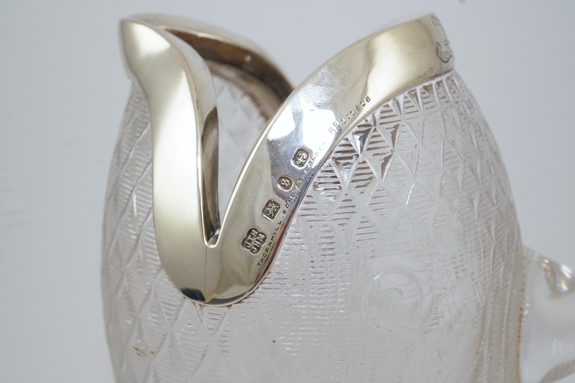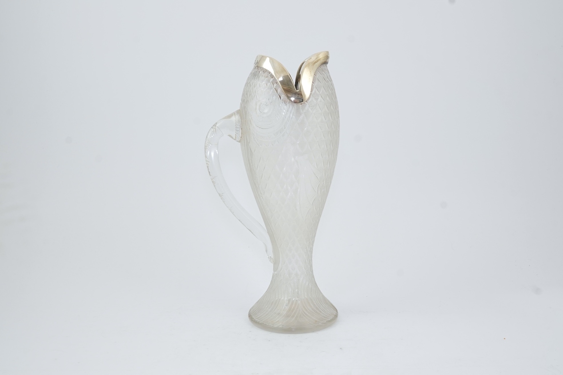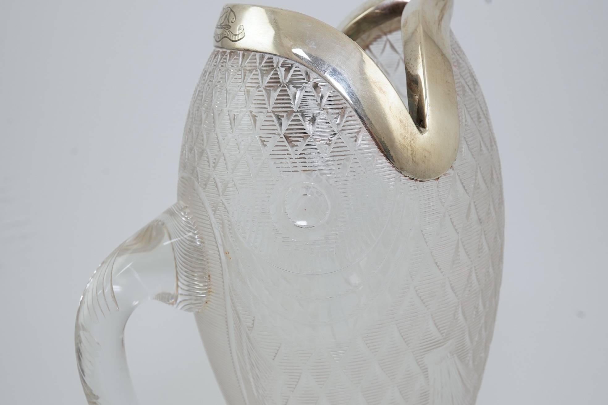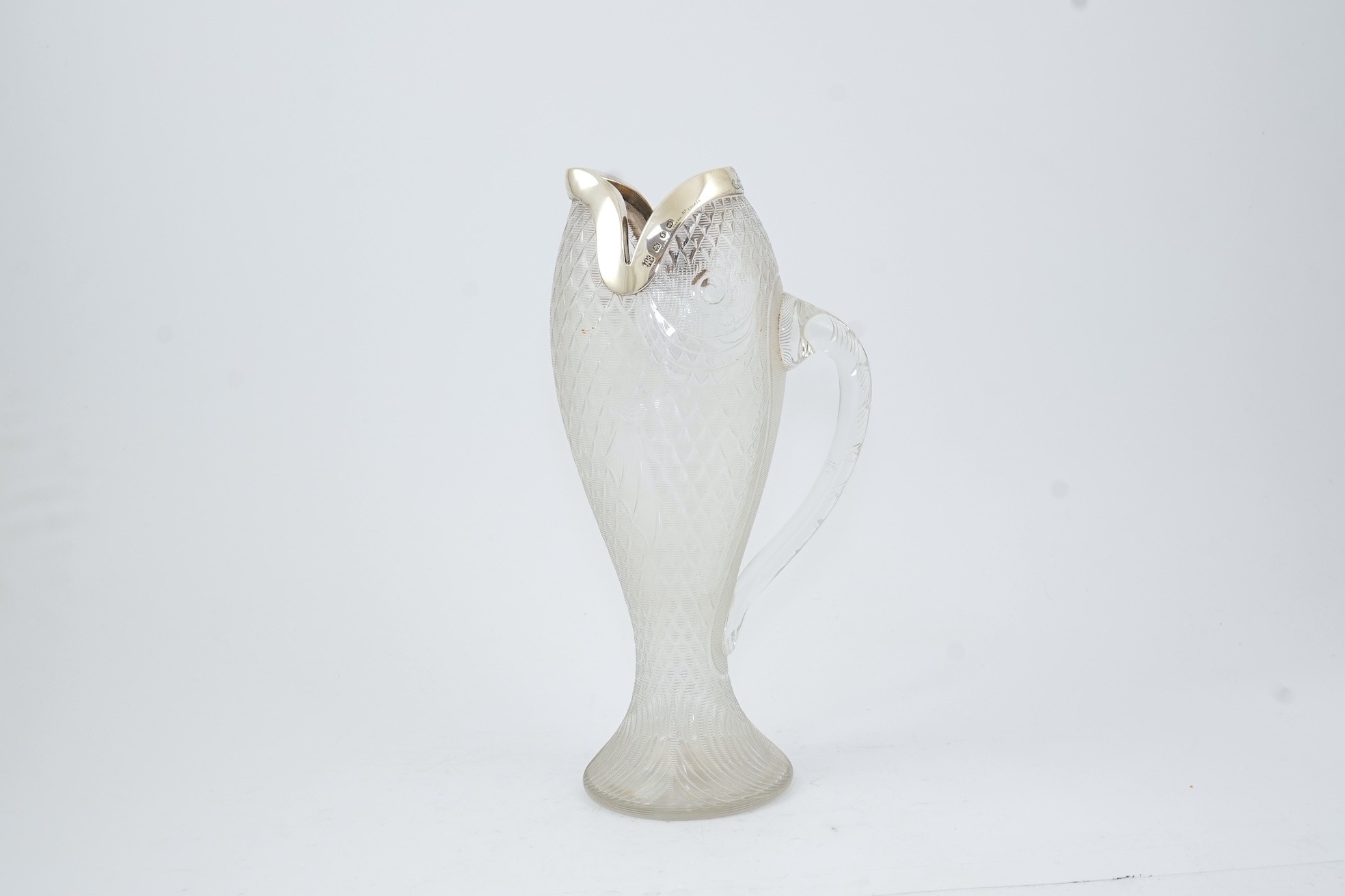 An unusual late Victorian novelty silver mounted single handled cut glass jug, modelled as a fish, by Hukin & Heath, with textured 'scale' decoration, and engraved crest to the mount, Birmingham, 1892, 29cm, retailed by Thornhill, Bond Street, London, rd. no. 202628.