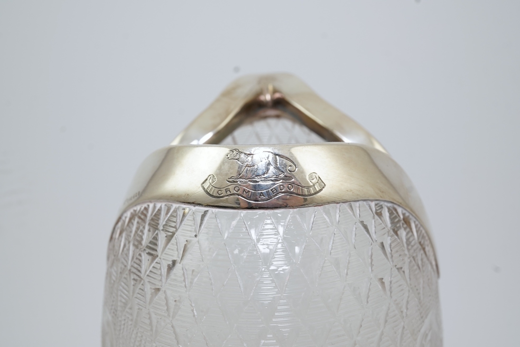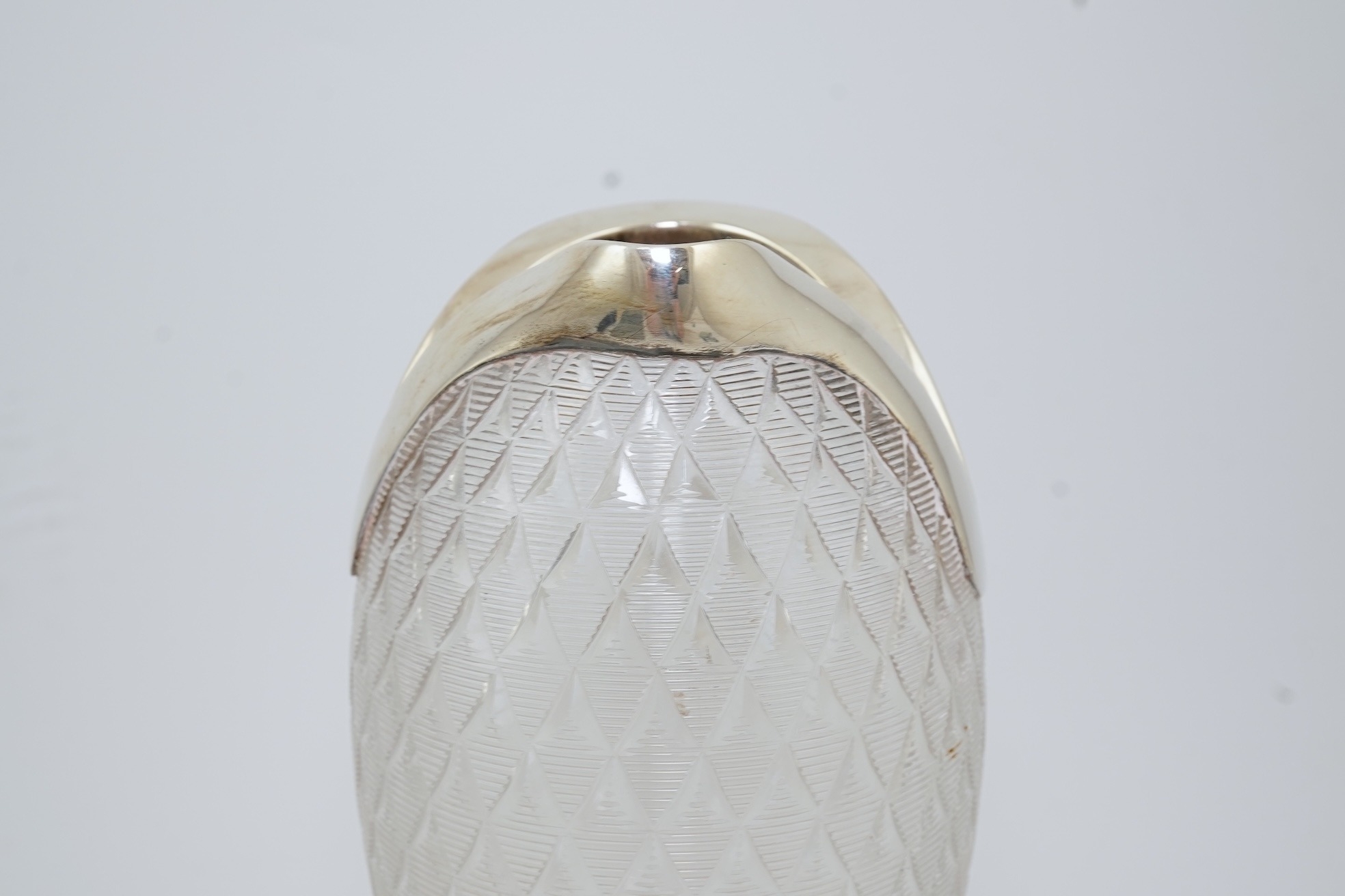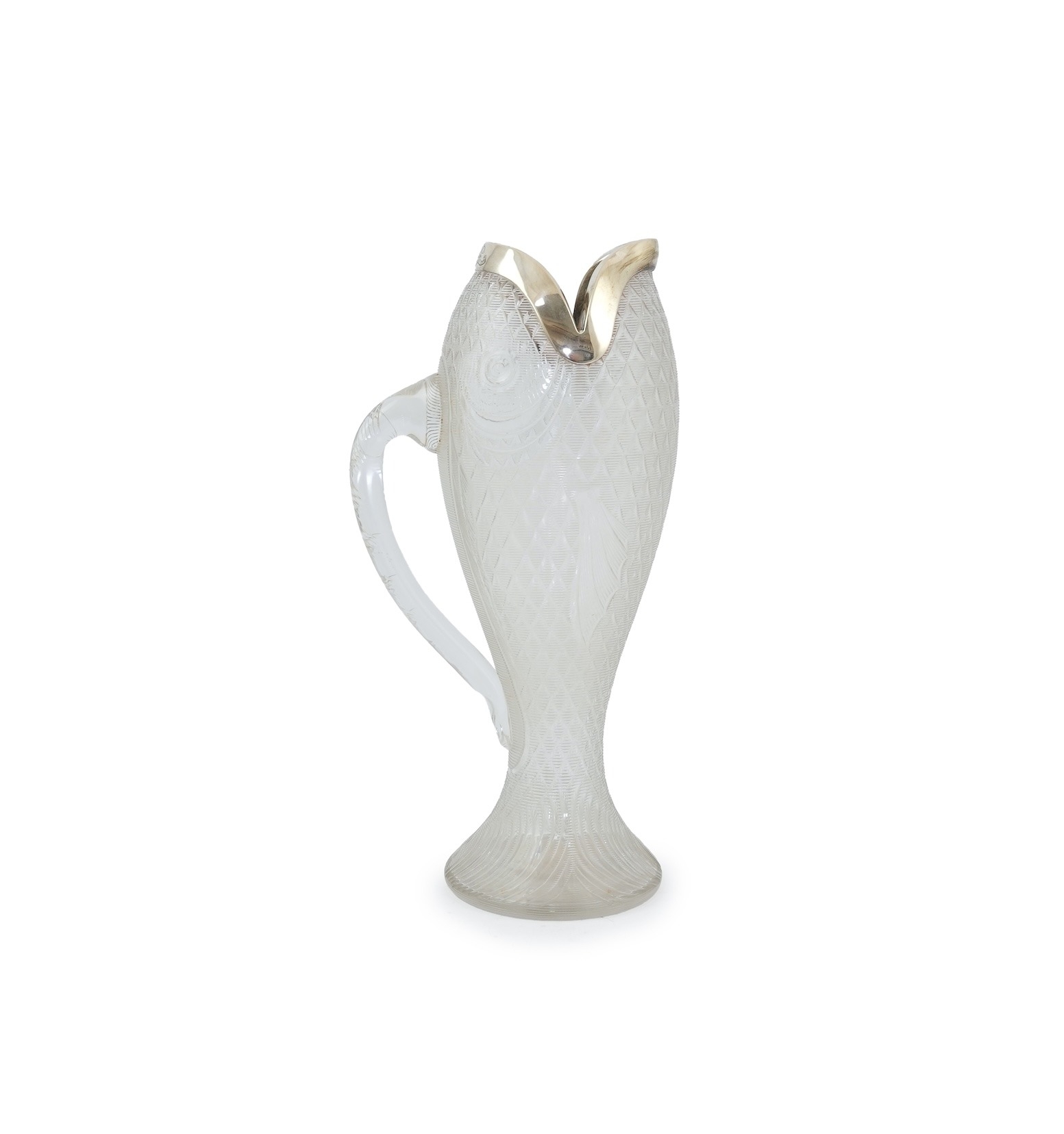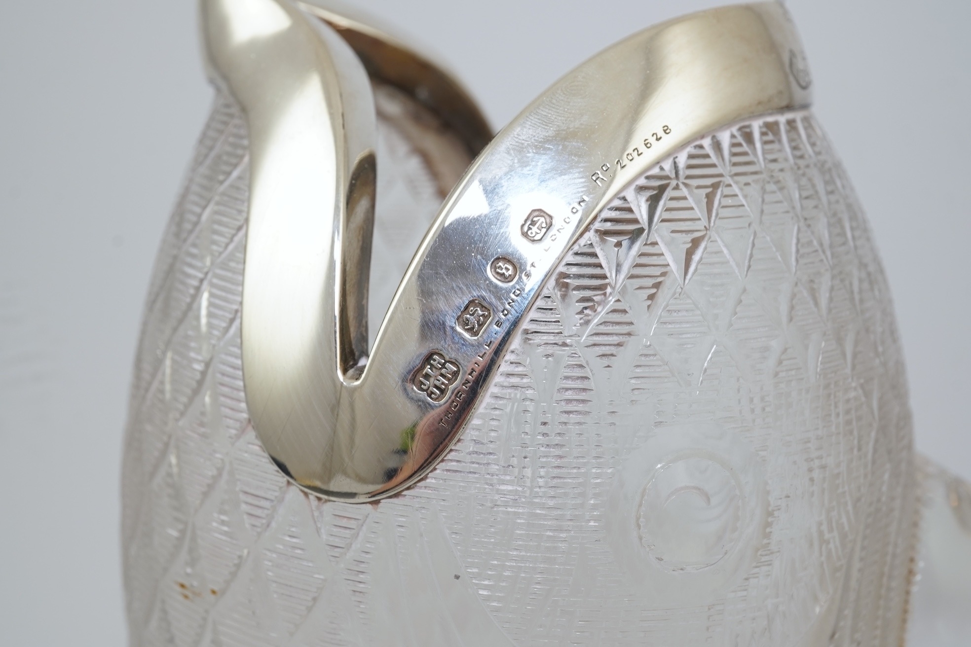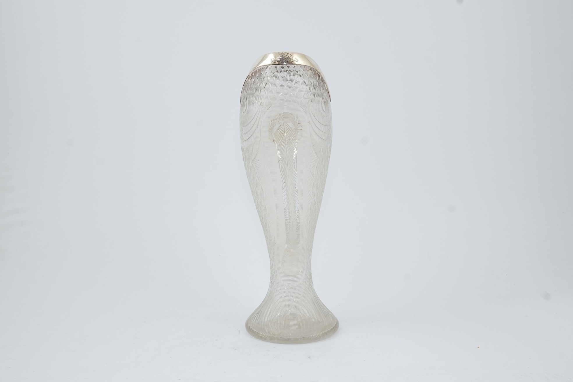 An unusual late Victorian novelty silver mounted single handled cut glass jug, modelled as a fish, by Hukin & Heath, with textured 'scale' decoration, and engraved crest to the mount, Birmingham, 1892, 29cm, retailed by Thornhill, Bond Street, London, rd. no. 202628.