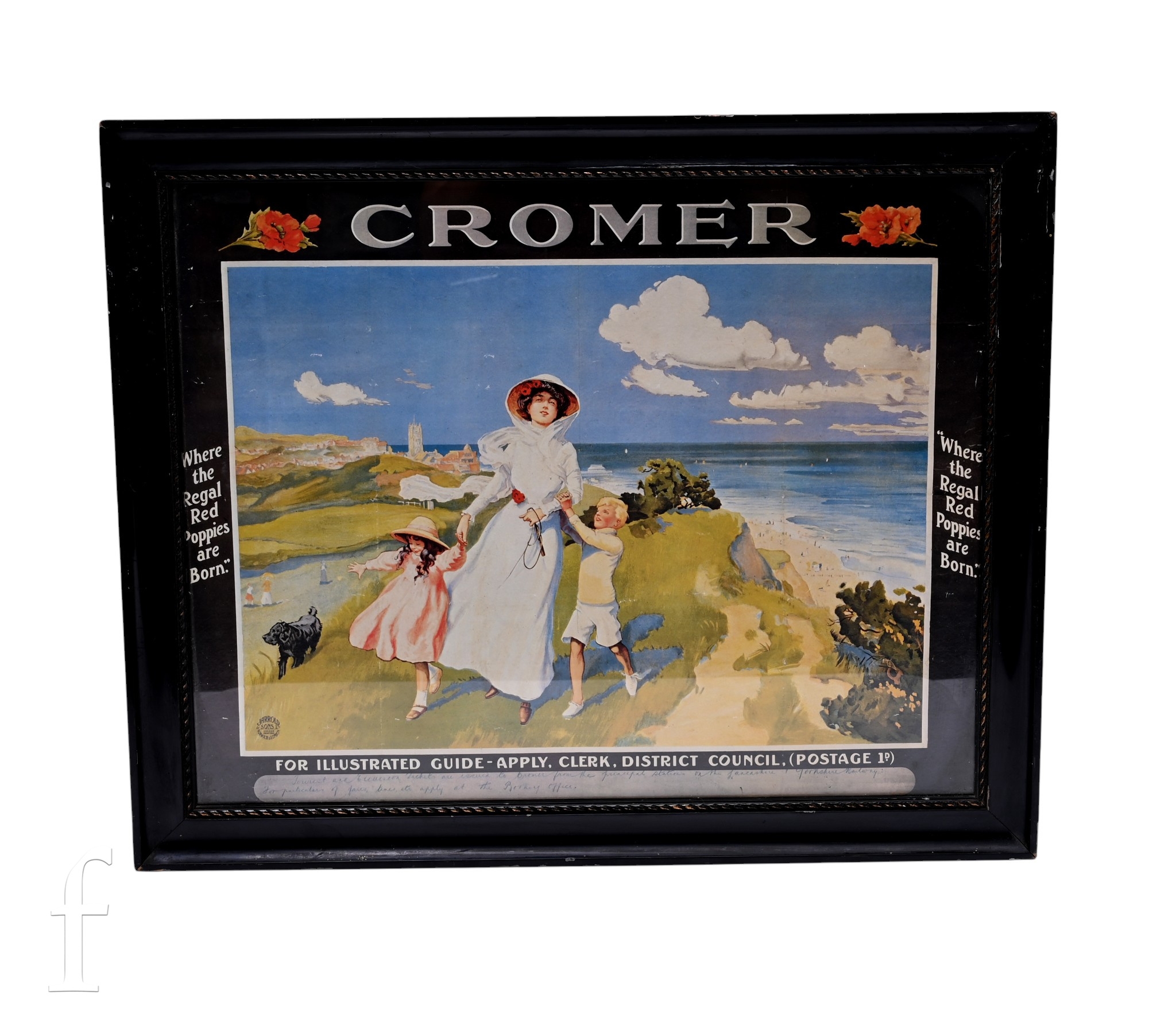 An Edwardian pictorial railway poster for Cromer (after the original) depicting a mother and her two children with their black Cocker Spaniel on a sunny day by the sea printed by Jarrold & Sons, in ebonised frame, 39cm x 49cm, framed.