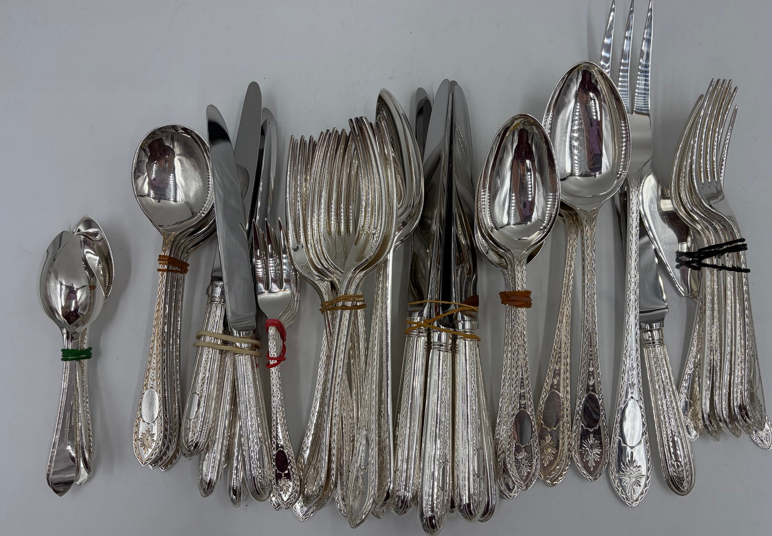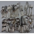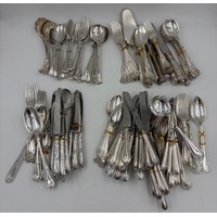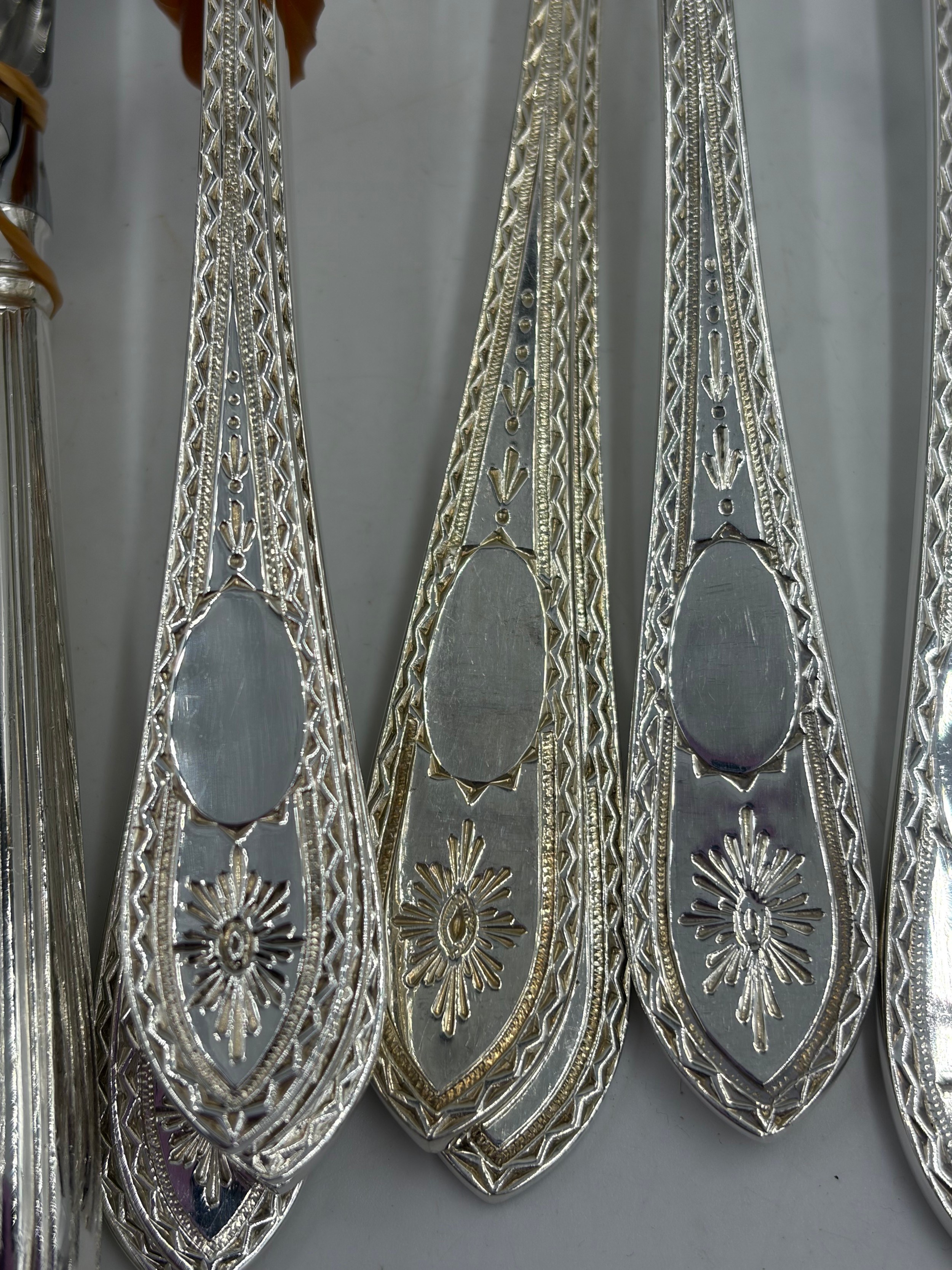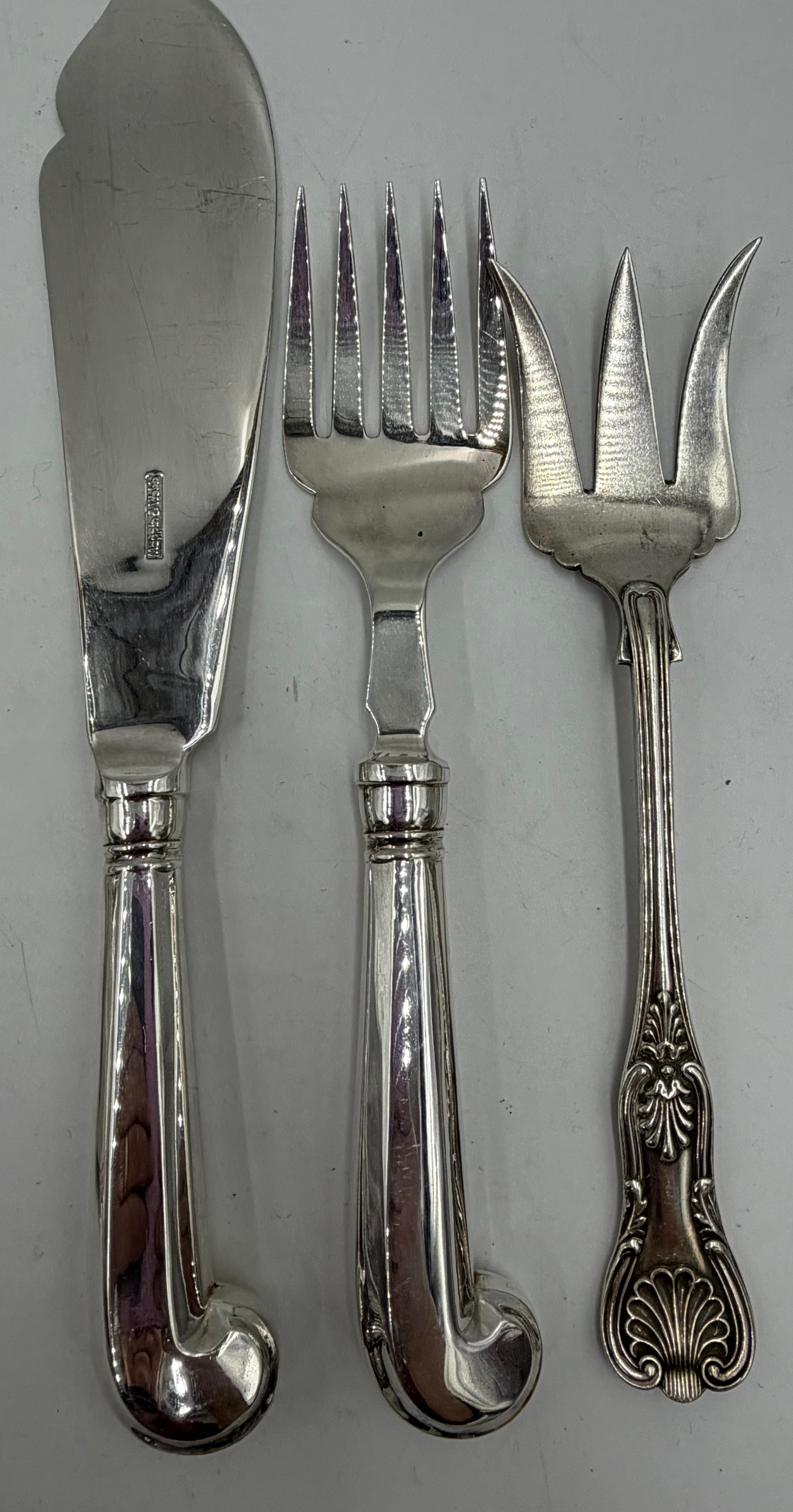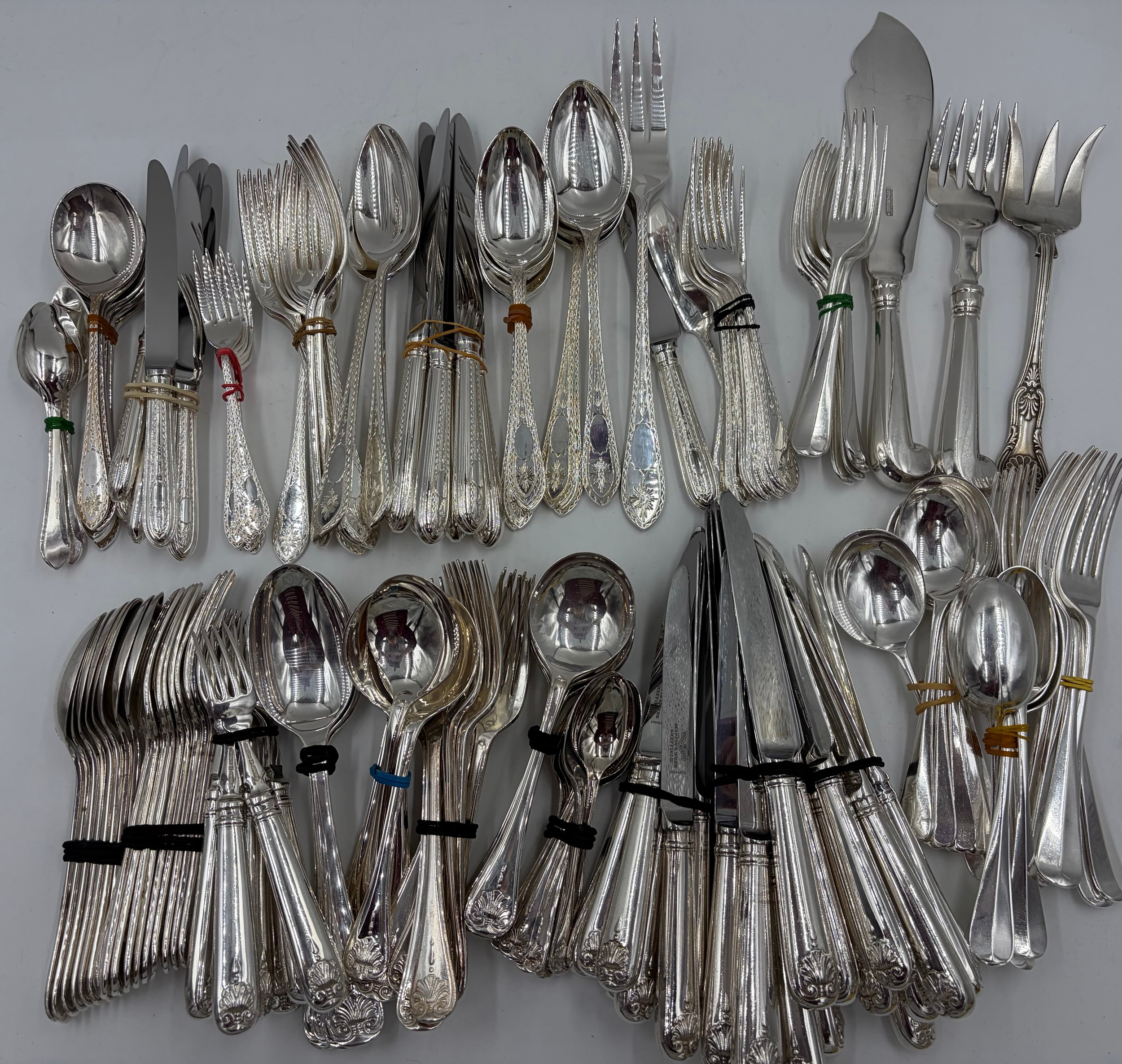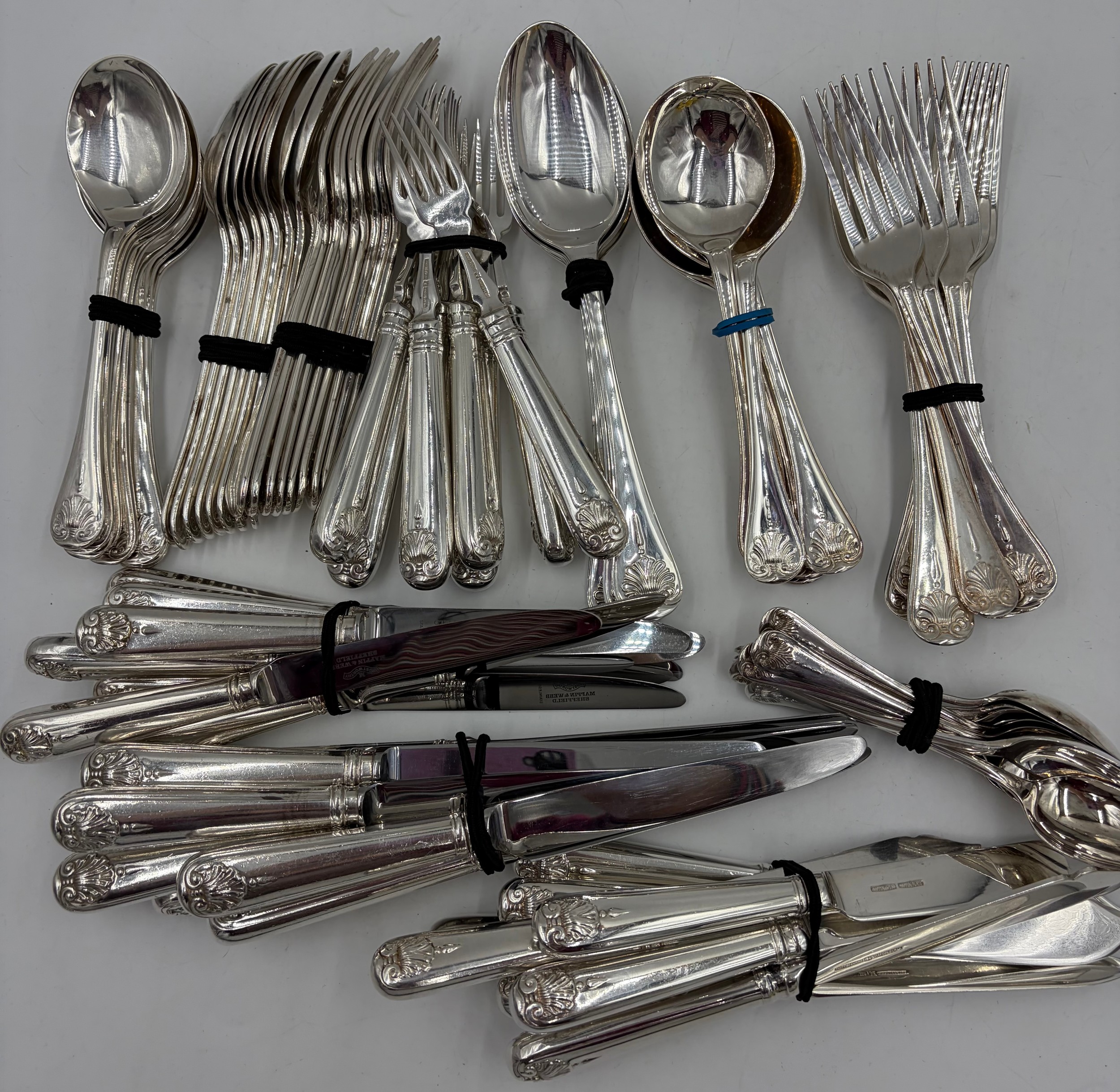 Collection of Mappin & Webb cutlery to include 3 patterns comprising of bright cut engraved start burst motive with a blank oval for a crest or monogram pattern comprising 6 dinner knives, 8 dinner forks, 6 dessert knives, 6 dessert forks, 6 dessert spoons, 6 soup spoons, 6 teaspoons, 6 large serving spoons, 1 large serving fork, 6 cake forks, 1 butter knife and 1 cheese knife. Fishtail design comprising 6 dinner forks and 6 dessert forks, 6 soup spoons, 6 dessert spoons, 1 cake slice and 2 large cake forks. Kings design comprising 8 dinner knives and forks, 8 fish knives and forks, 6 dessert knives and forks, 4 large serving spoons, 8 dessert spoons, 8 teaspoons, 14 soup spoons.