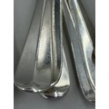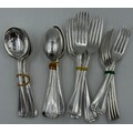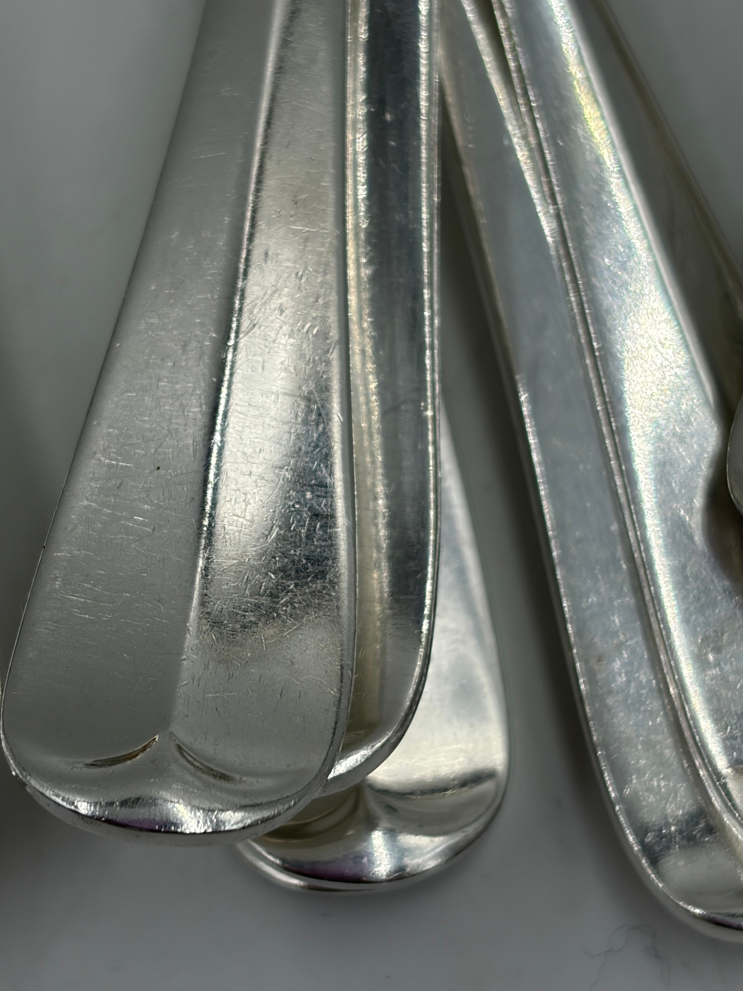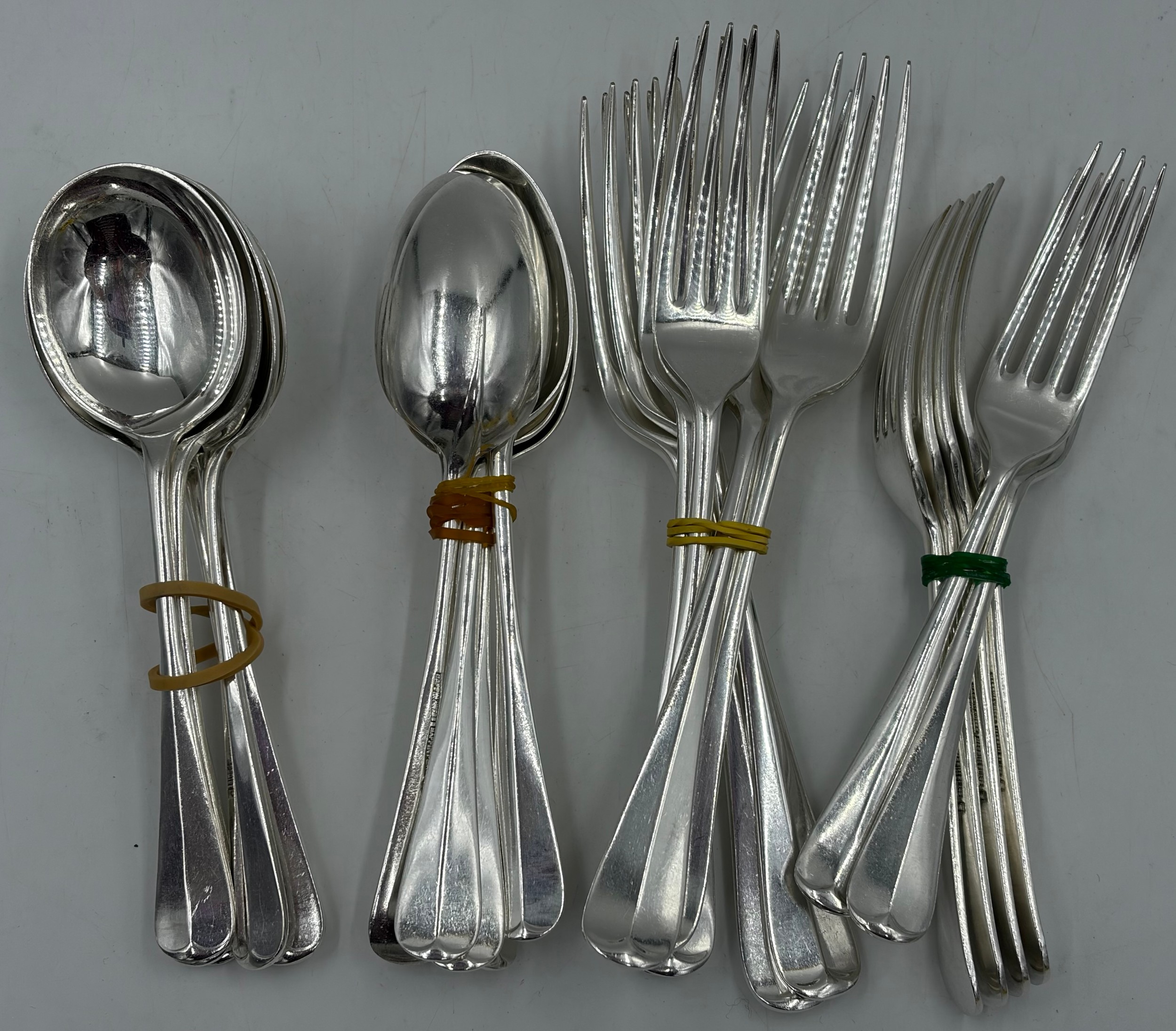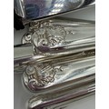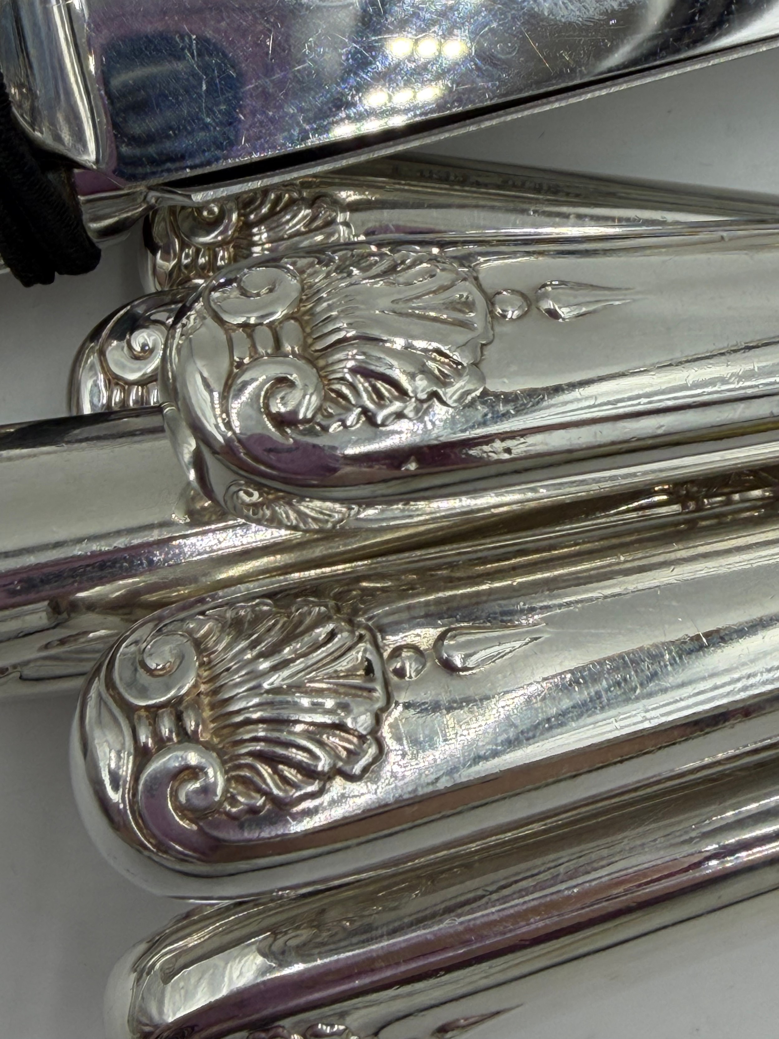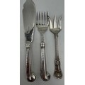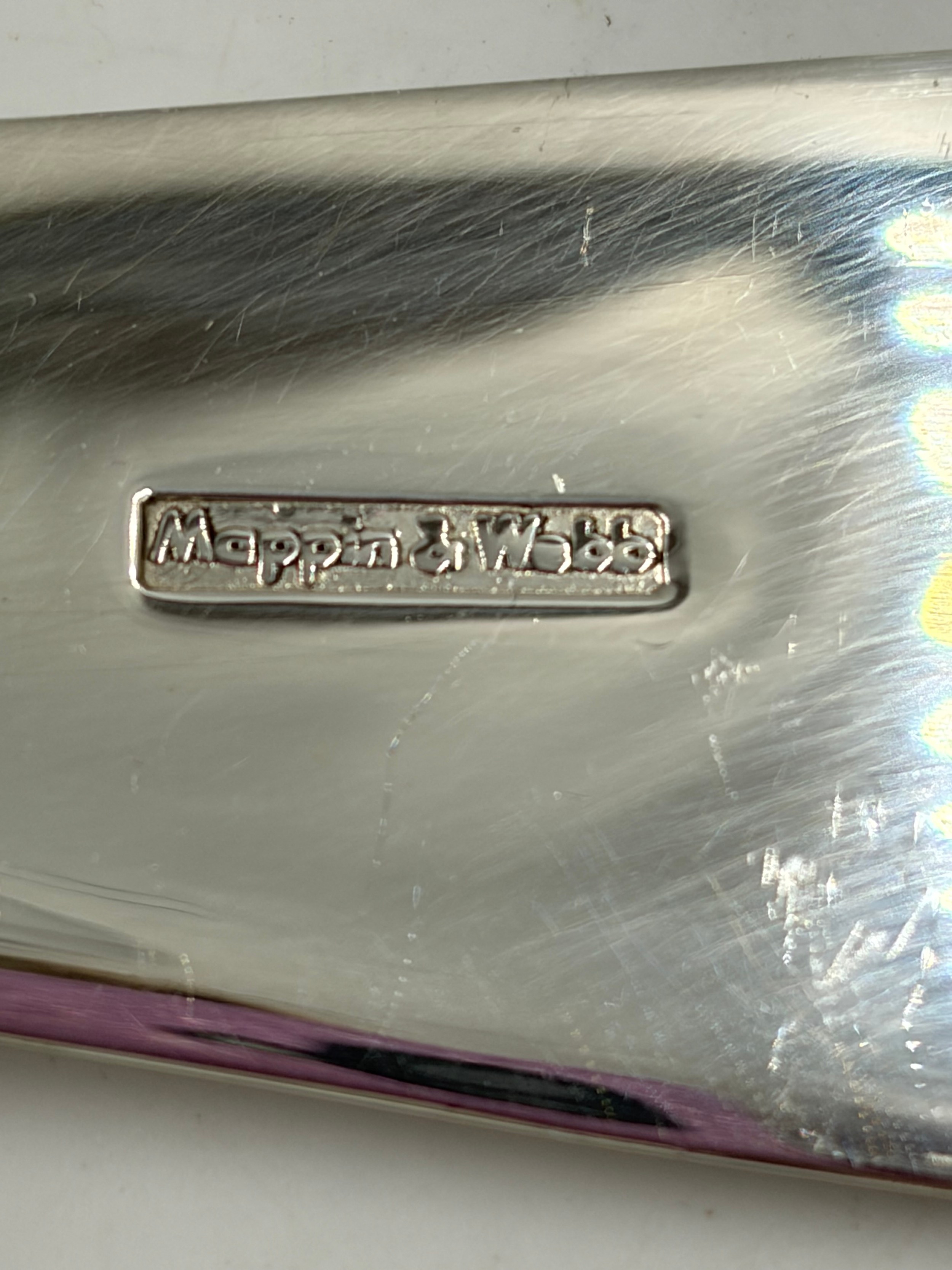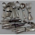 Collection of Mappin & Webb cutlery to include 3 patterns comprising of bright cut engraved start burst motive with a blank oval for a crest or monogram pattern comprising 6 dinner knives, 8 dinner forks, 6 dessert knives, 6 dessert forks, 6 dessert spoons, 6 soup spoons, 6 teaspoons, 6 large serving spoons, 1 large serving fork, 6 cake forks, 1 butter knife and 1 cheese knife. Fishtail design comprising 6 dinner forks and 6 dessert forks, 6 soup spoons, 6 dessert spoons, 1 cake slice and 2 large cake forks. Kings design comprising 8 dinner knives and forks, 8 fish knives and forks, 6 dessert knives and forks, 4 large serving spoons, 8 dessert spoons, 8 teaspoons, 14 soup spoons.